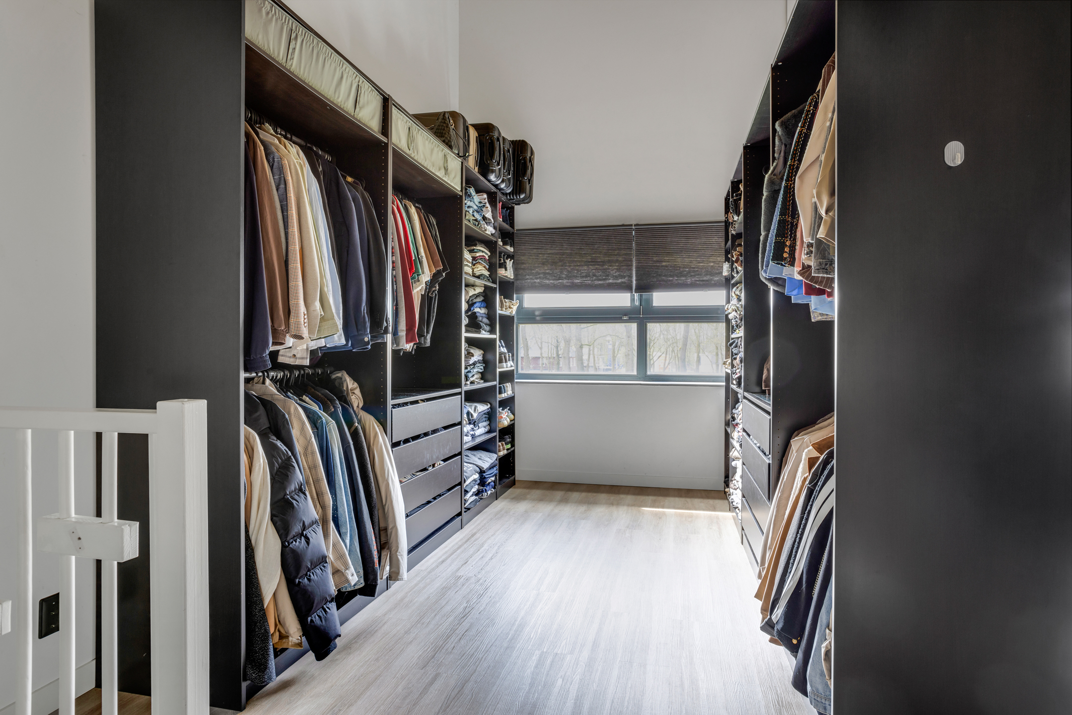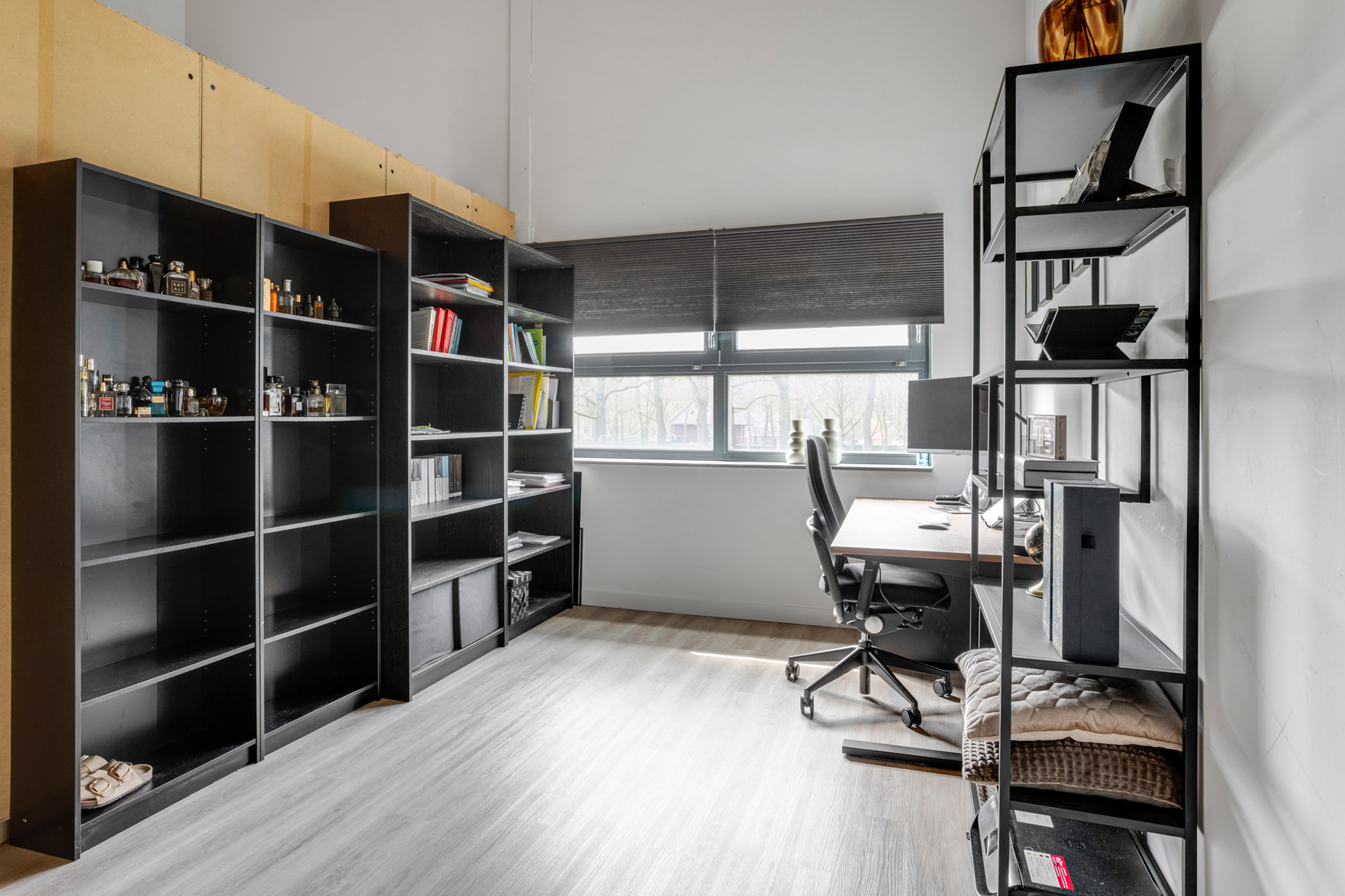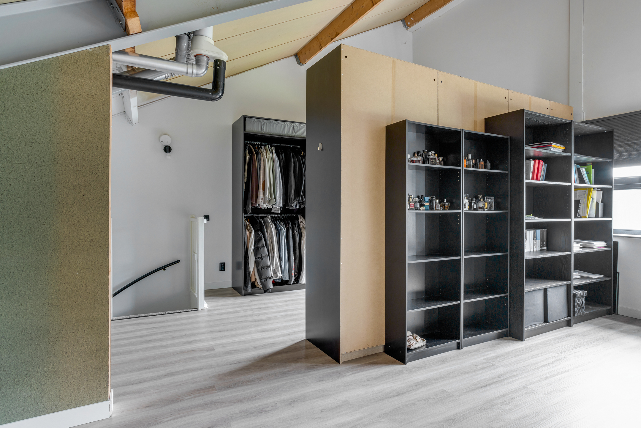 2e verdieping: Via een vaste trap bereik je de royale tweede verdieping. Deze open ruimte is verrassend ruim en multifunctioneel ingericht en momenteel in gebruik als werkkamer, met daarnaast een praktisch ingericht gedeelte als inloopkast.