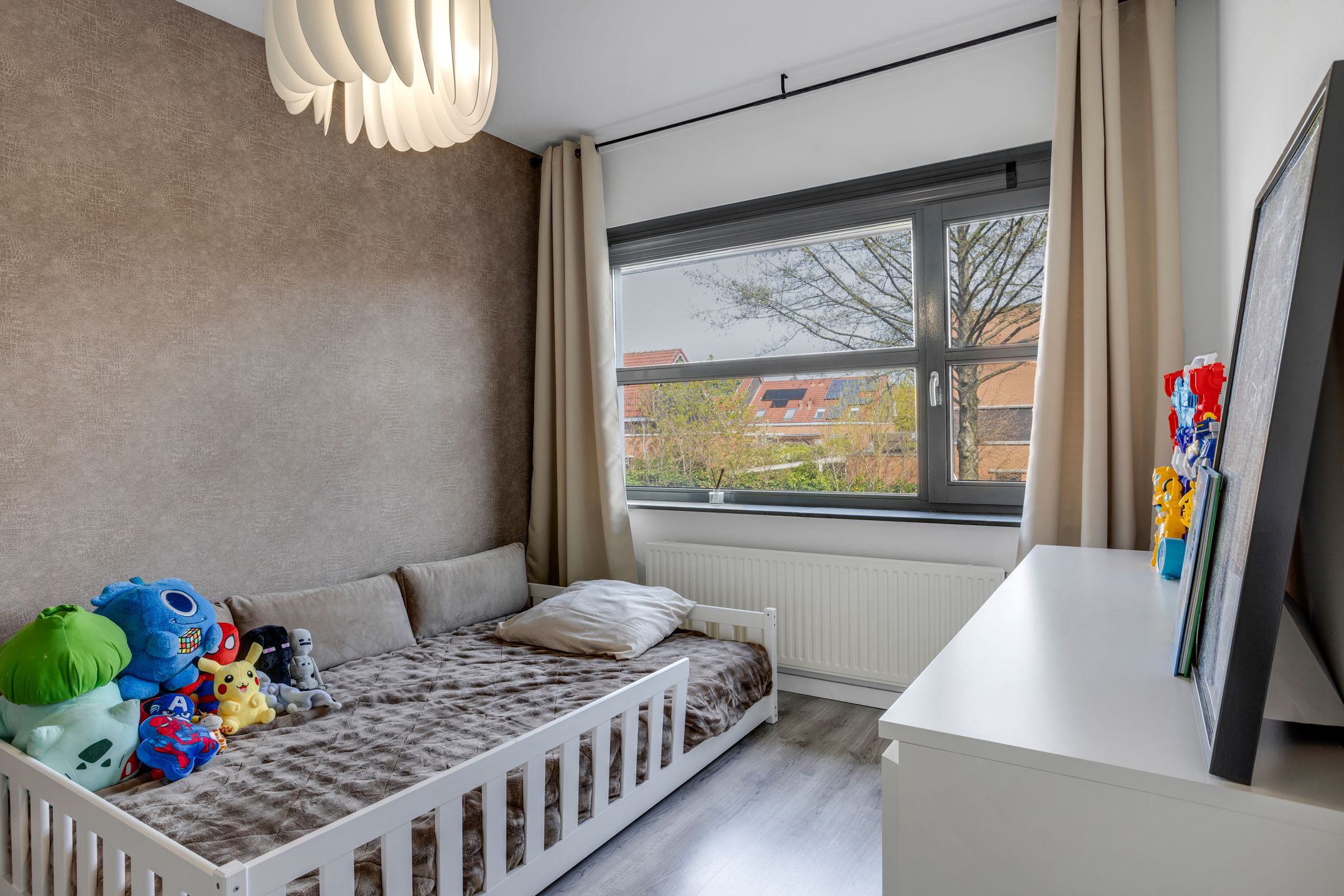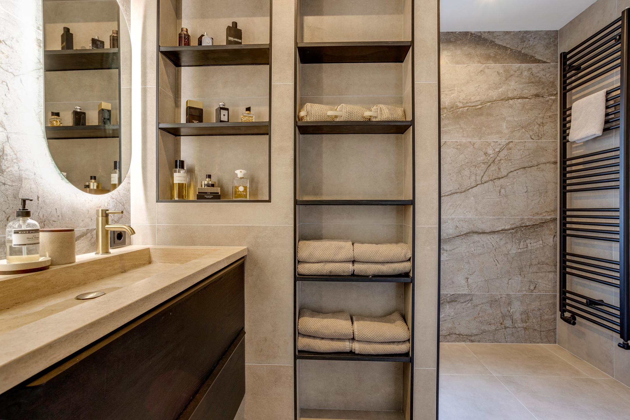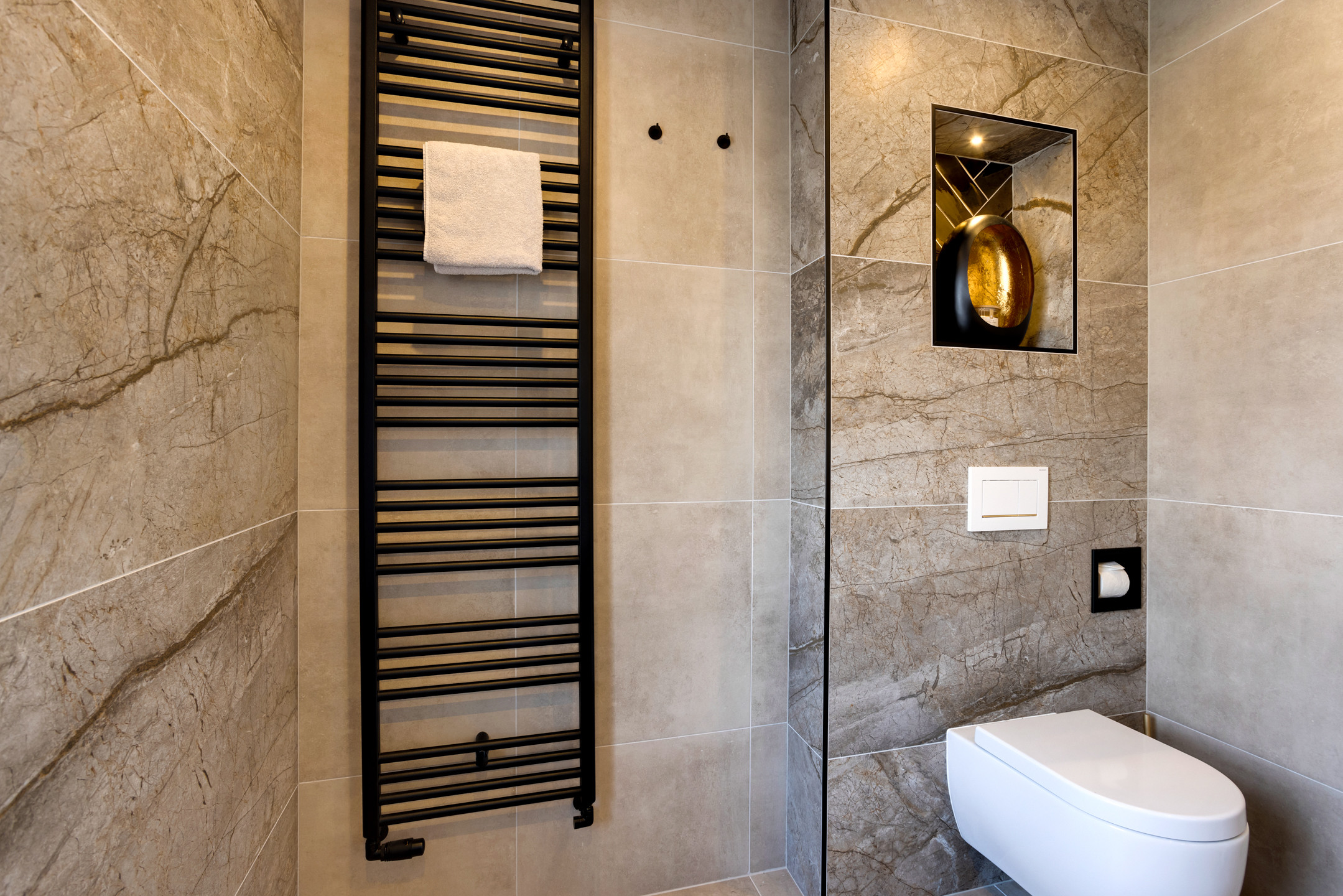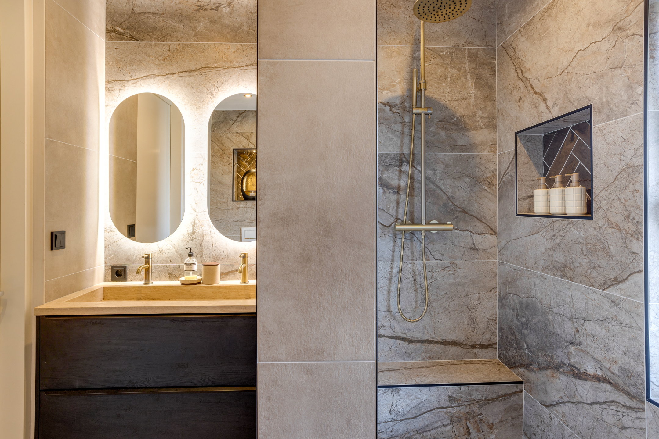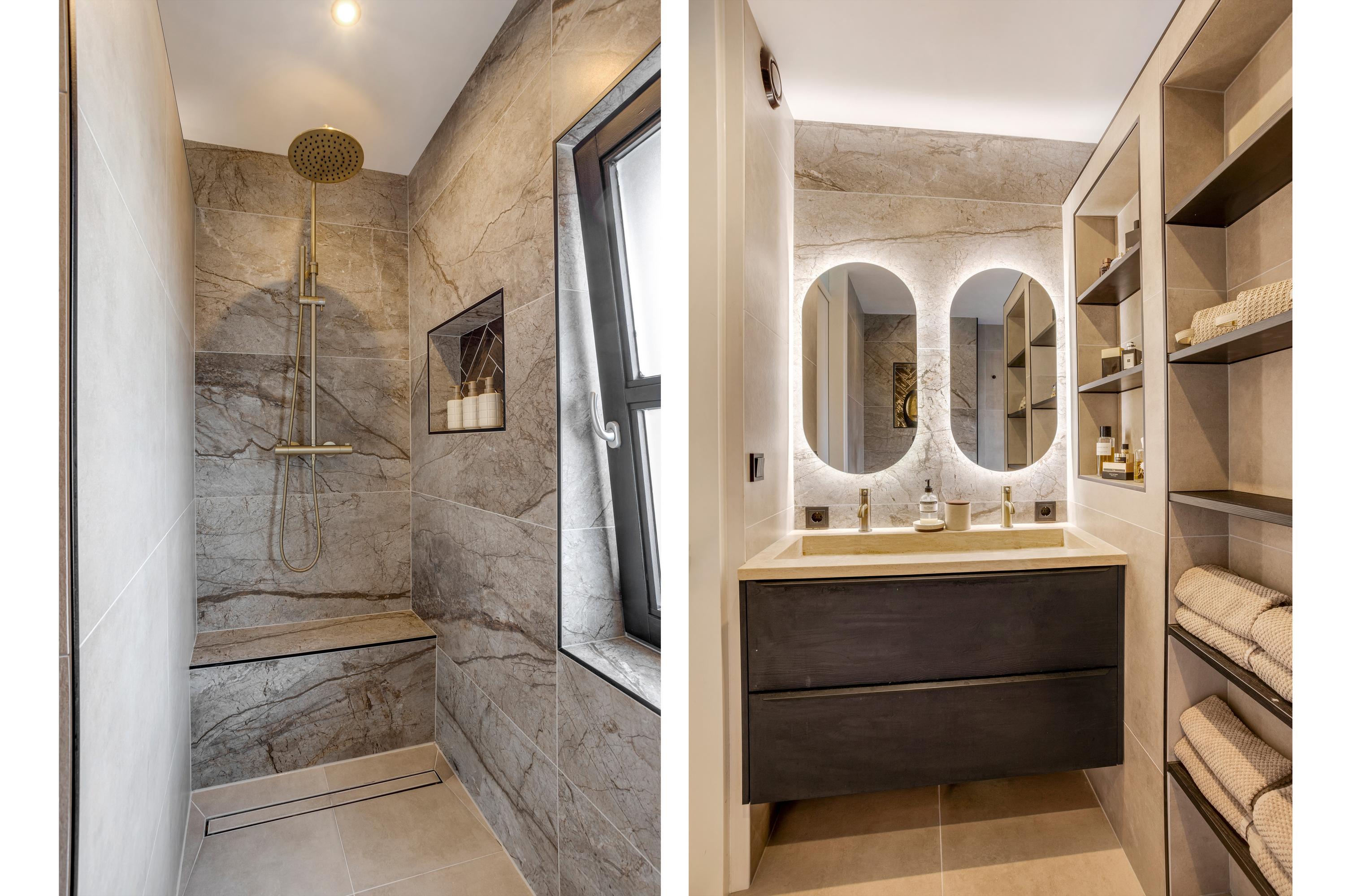 De badkamer is een echte eyecatcher en recent (2023) volledig vernieuwd. Deze luxe ruimte is strak afgewerkt en volledig betegeld in een moderne stijl. De badkamer beschikt over een inloopdouche met zowel een comfortabele stortdouche als handdouche en een praktische nis voor toiletartikelen. Daarnaast is er een stijlvol wastafelmeubel met dubbele lade en twee kranen, fraaie designspiegels en een designradiator. Het geheel wordt compleet gemaakt met een modern hangcloset.
