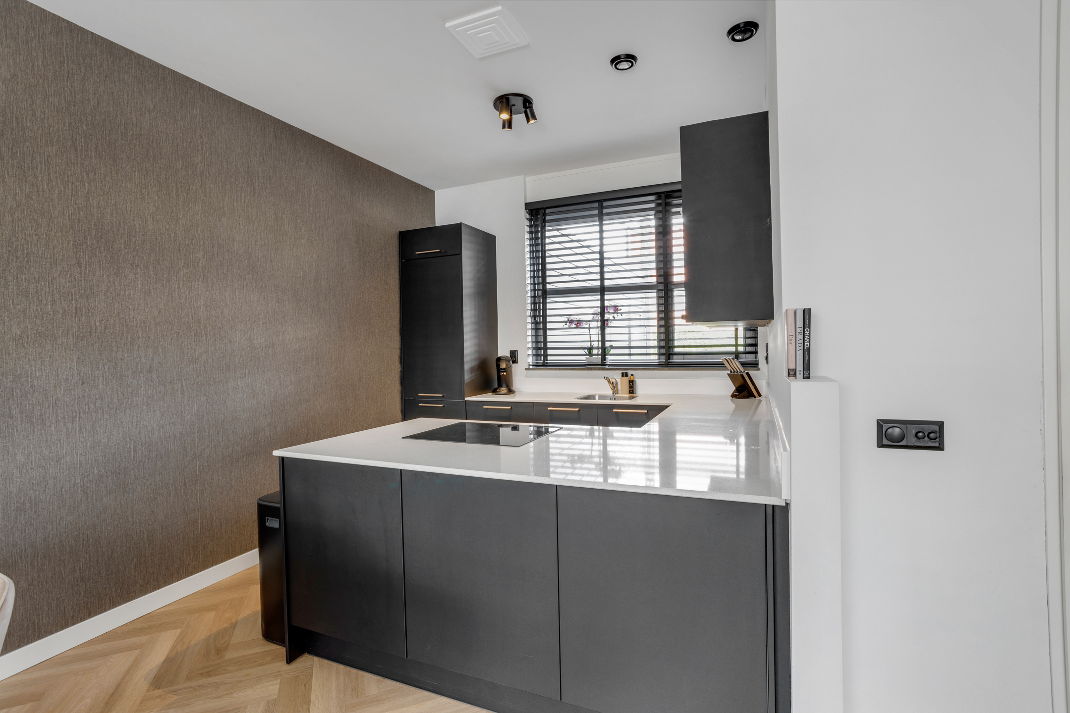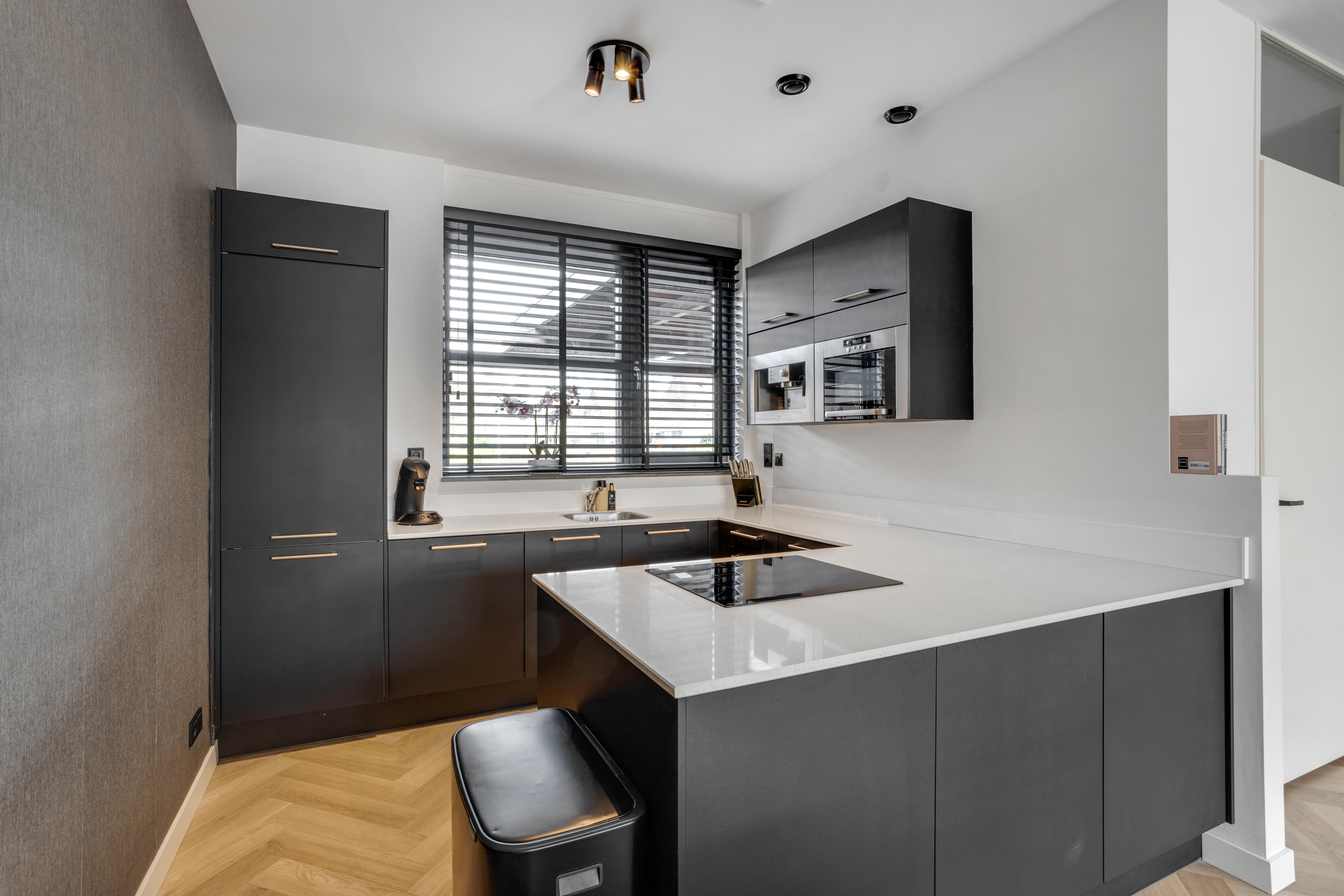 De open keuken bevindt zich aan de voorzijde van de woning en is uitgevoerd in een moderne, donkere kleurstelling met een licht werkblad. De keuken is voorzien van diverse inbouwapparatuur en biedt volop werk- en opbergruimte.