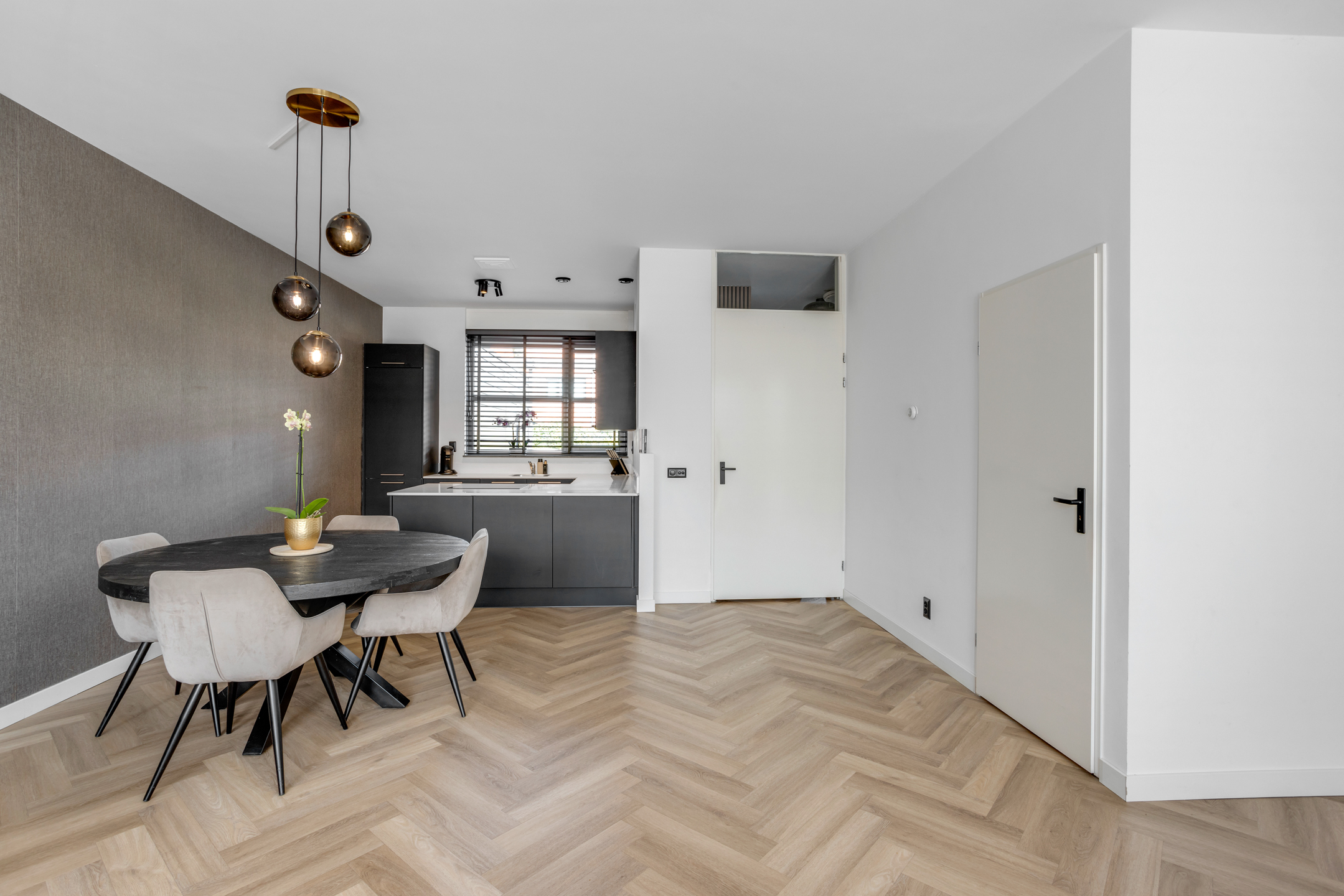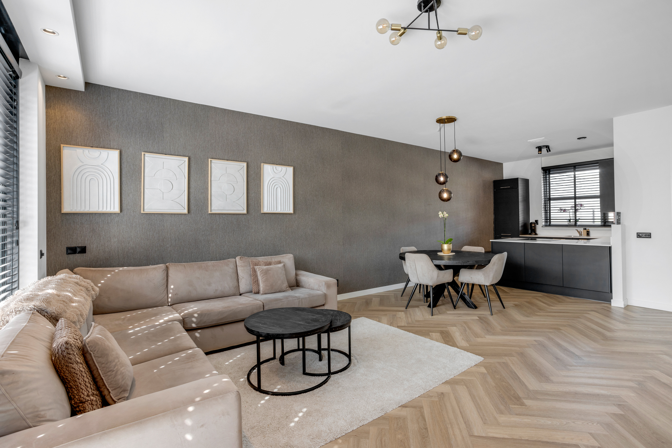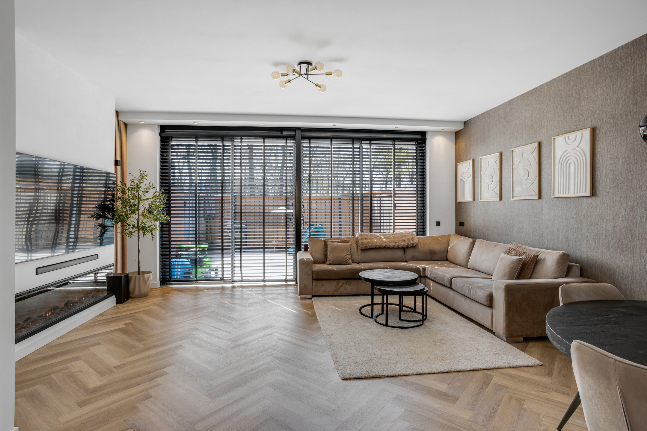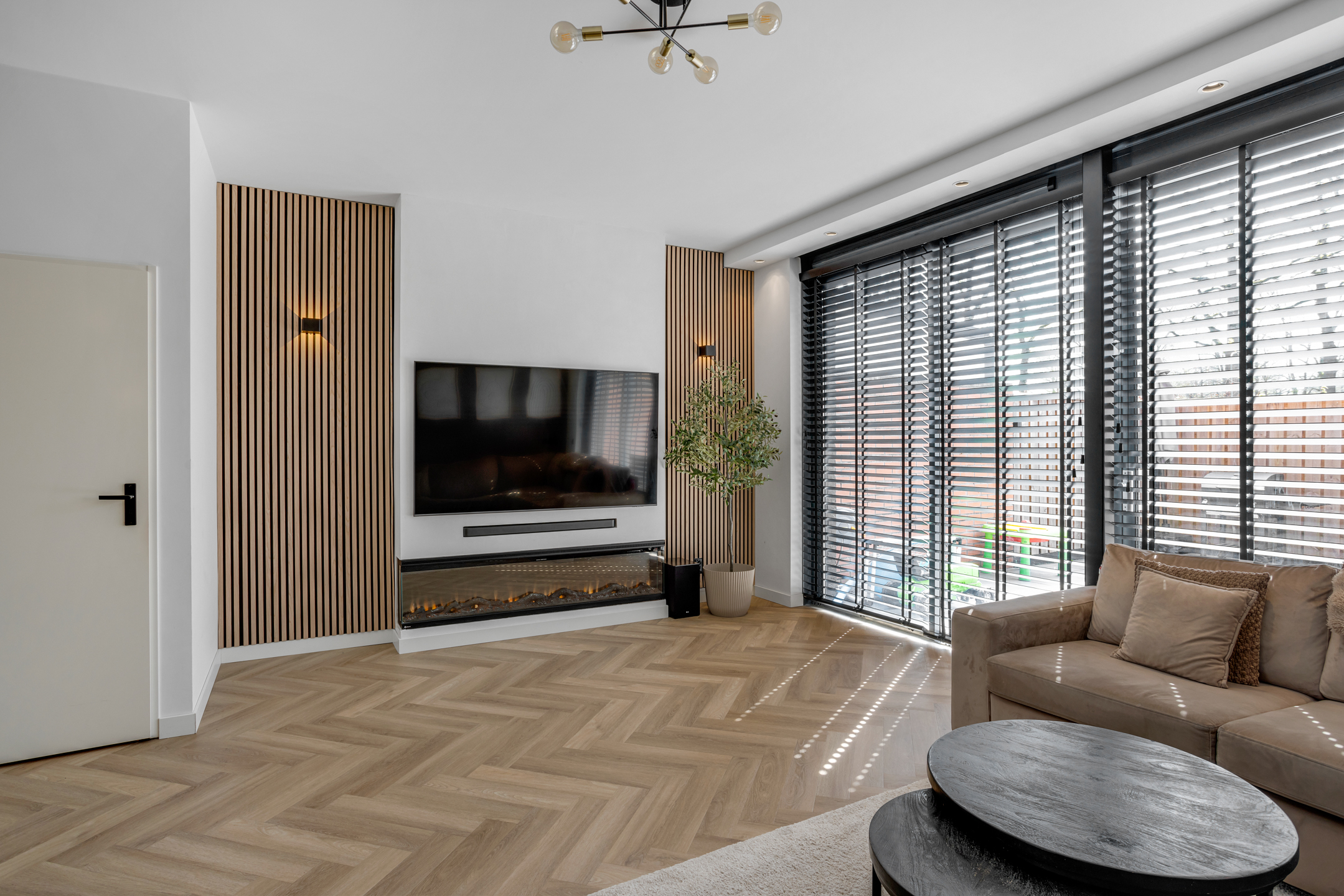 De woonkamer is verrassend ruim en strak afgewerkt, met een fraaie visgraatvloer en een warme, eigentijdse uitstraling. Dankzij de grote raampartijen en de brede schuifpui naar de tuin geniet de ruimte van veel natuurlijk licht. De luxe cinema wall met ingebouwde sfeerhaard vormt een echte eyecatcher en zorgt voor extra comfort en sfeer.