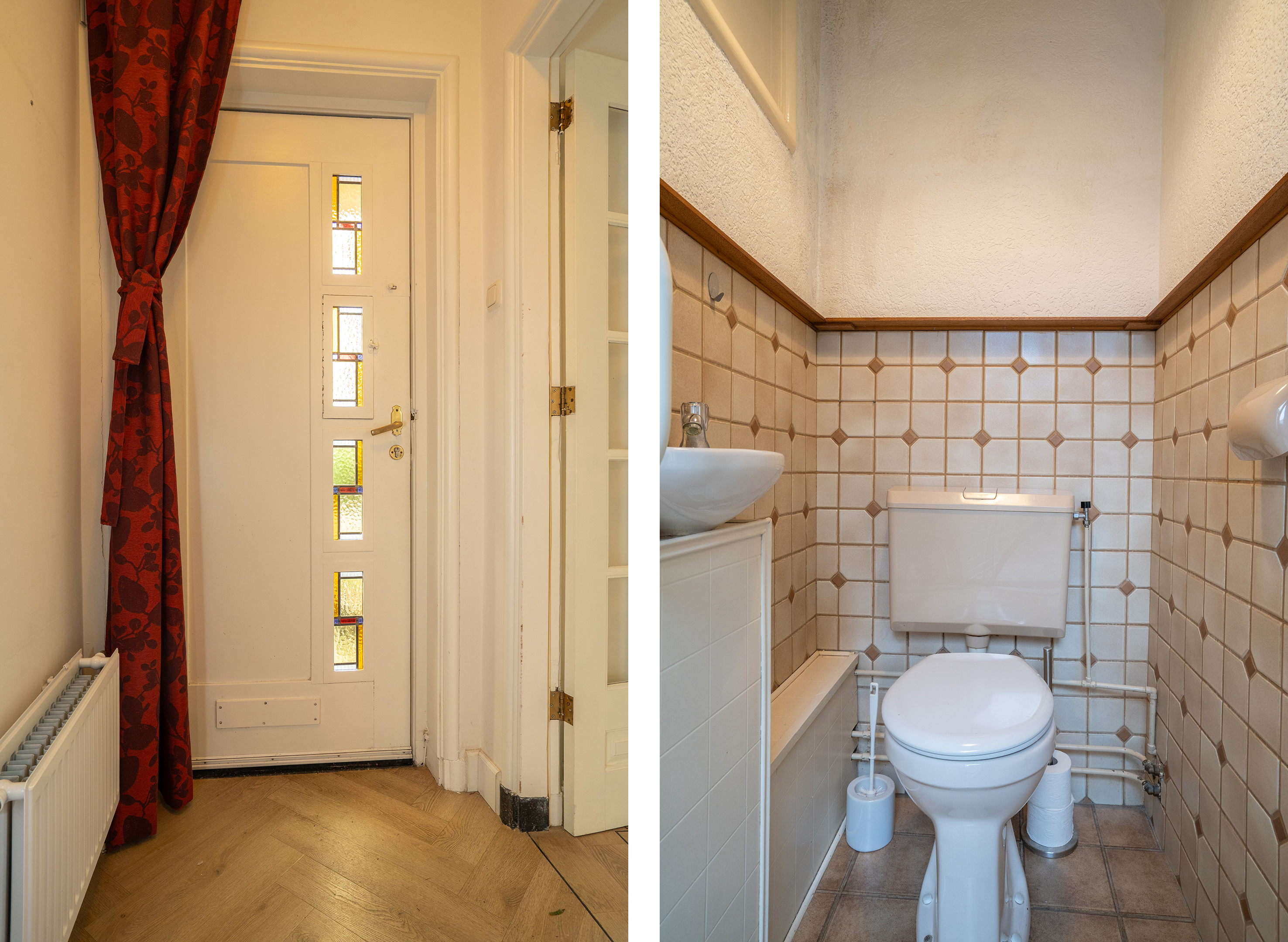 Achter de keuken ligt een tussenhal met toegang tot het toilet en de achterdeur naar buiten. Vanuit deze hal zijn tevens de twee achtergelegen bergingen bereikbaar.