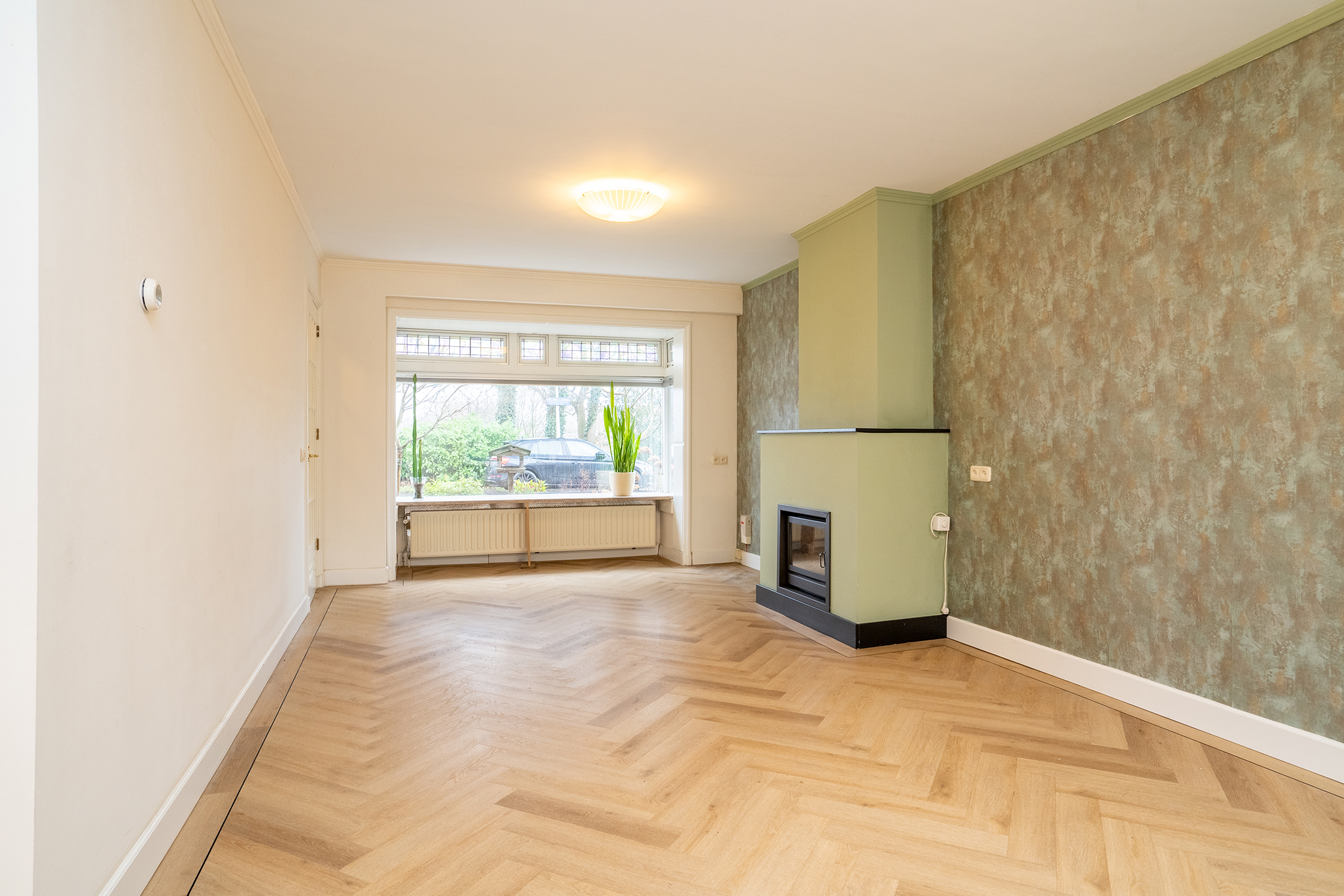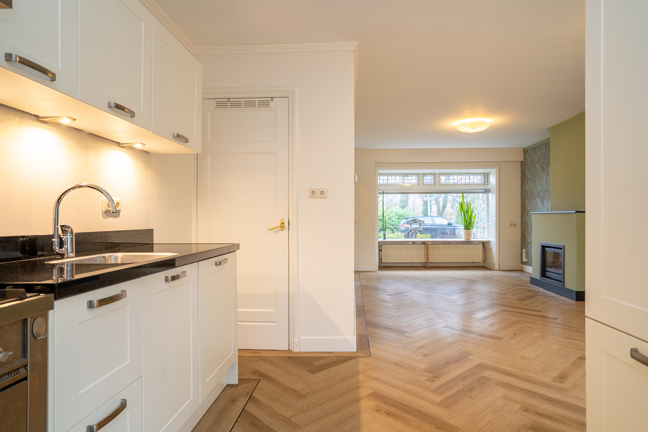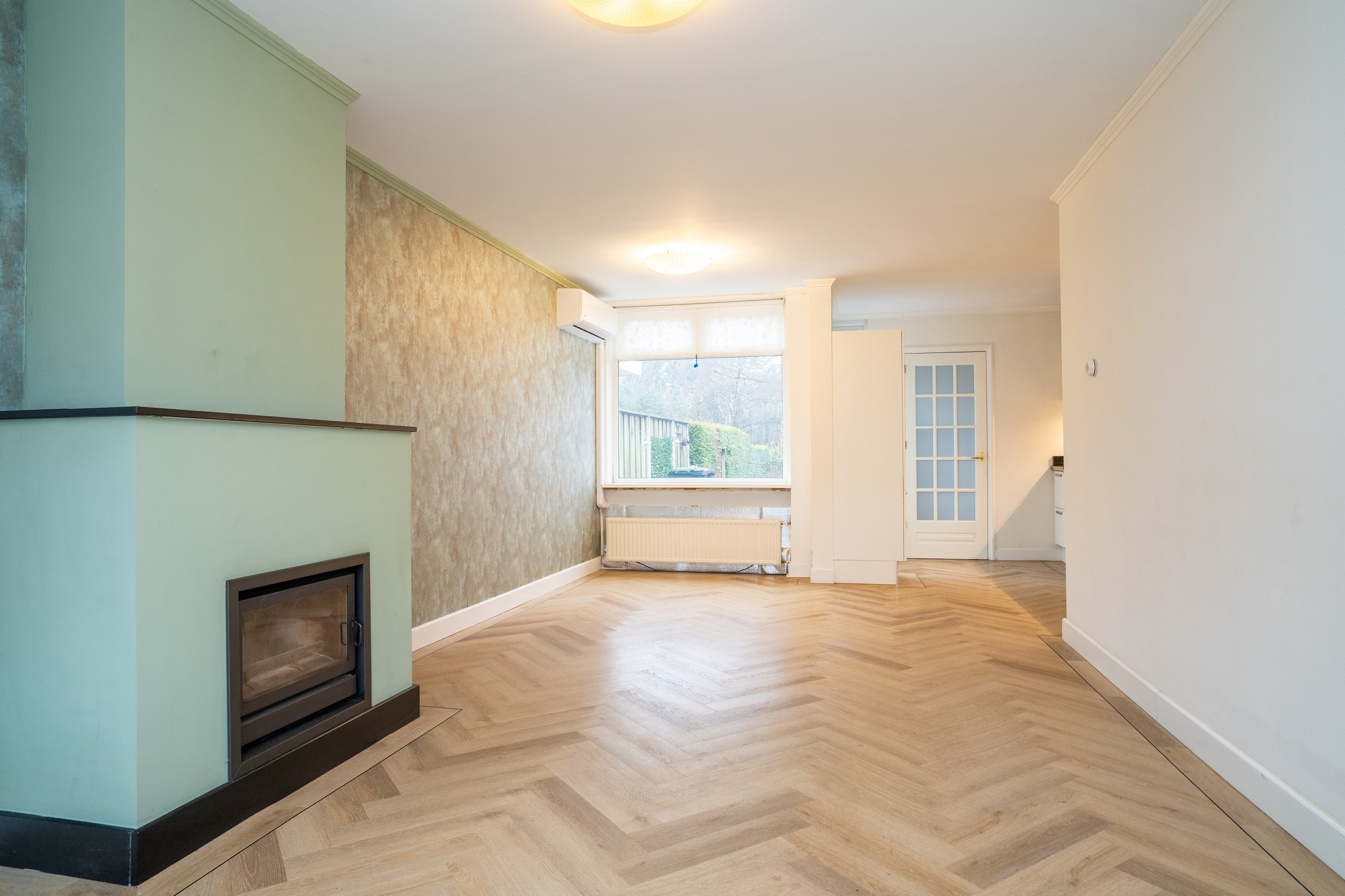 Begane grond: Via de overdekte entree bereik je de voordeur en stap je binnen in een verzorgde hal met meterkast, kelderkast en trapopgang. Vanuit hier loop je door naar de ruime en lichte woonkamer, voorzien van een fraaie PVC visgraatvloer, een sfeervolle houtkachel én een airco voor extra comfort tijdens warme dagen. Dankzij de brede raampartij aan de voorzijde geniet je hier van een prettige lichtinval en uitzicht op het groen.