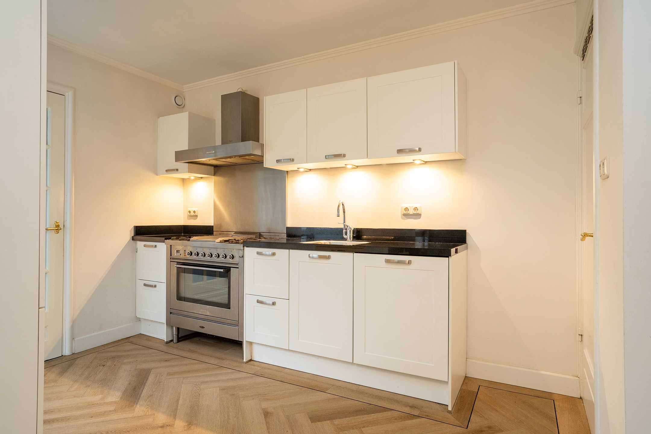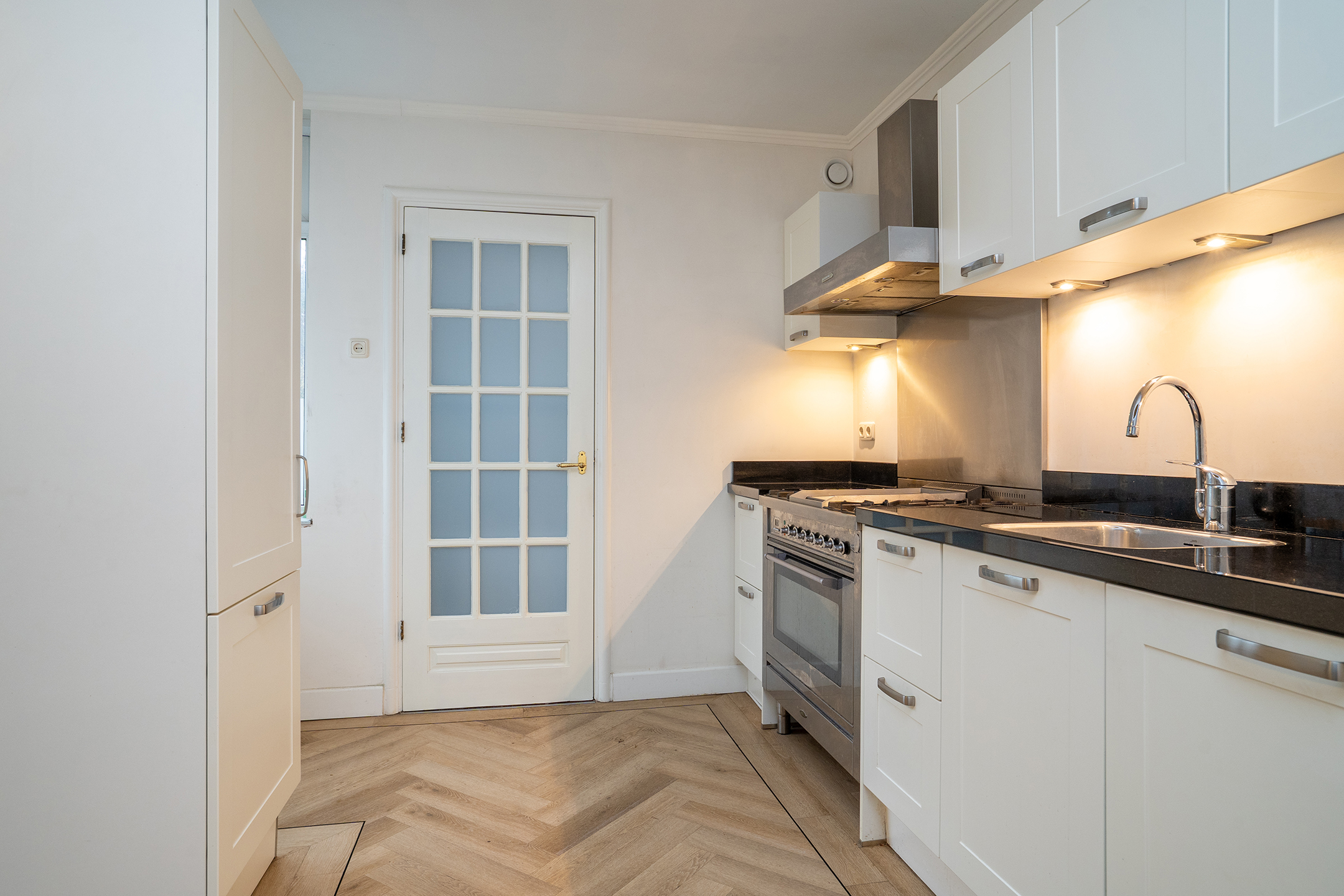 Aan de achterzijde bevindt zich de nette keuken. Deze is voorzien van diverse inbouwapparatuur, waaronder een gasfornuis met afzuigkap, vaatwasser, koelkast, oven en vriezer. Het raam zorgt ook hier voor veel natuurlijke lichtinval.