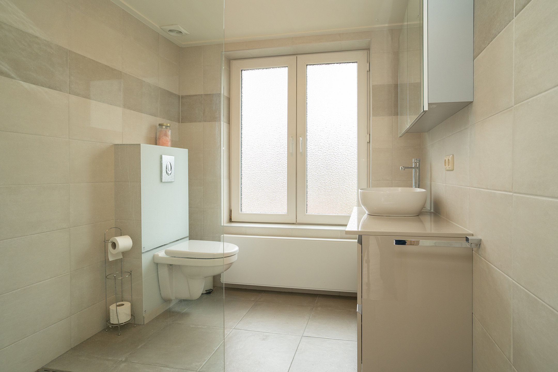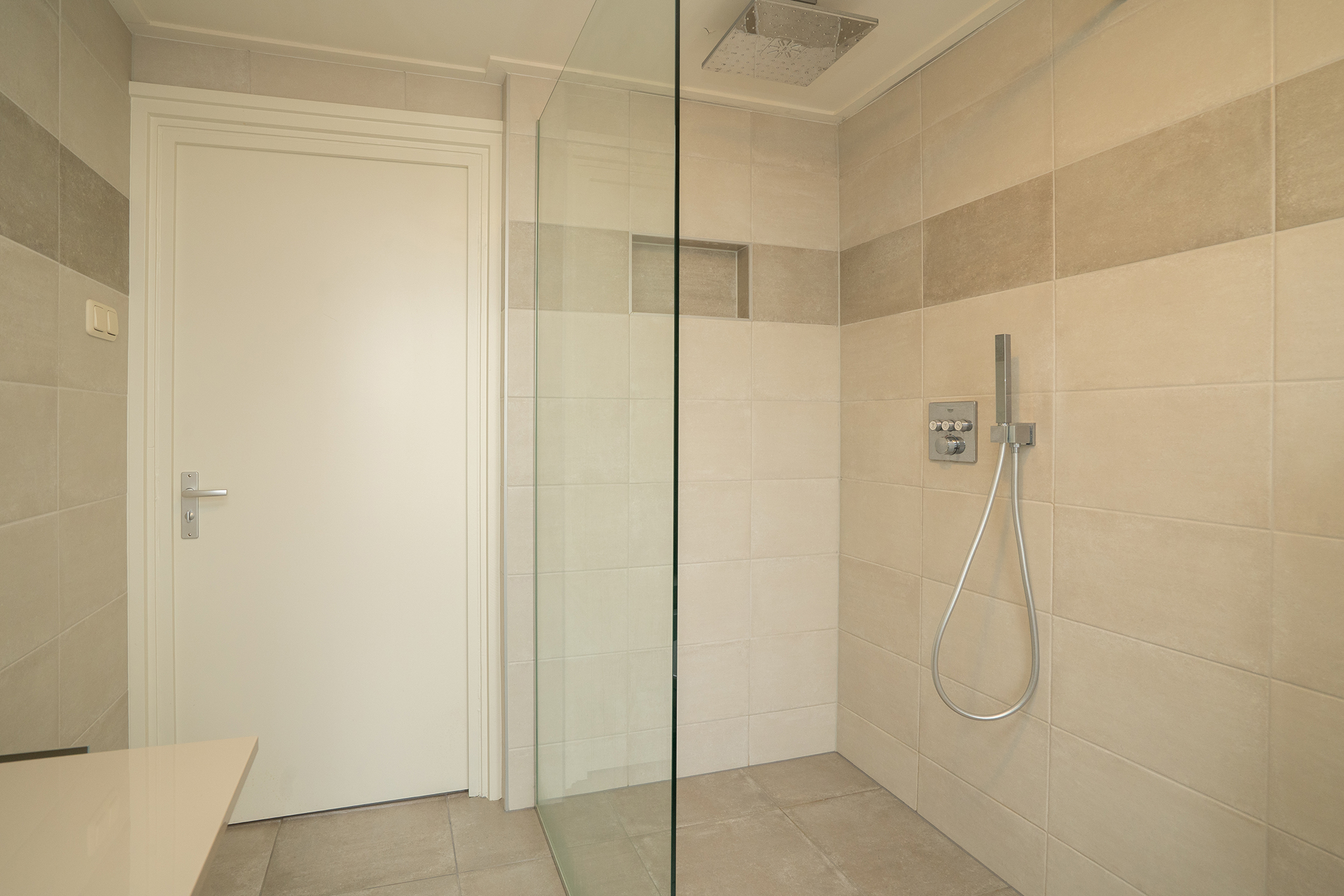 De badkamer is circa zes jaar geleden vernieuwd, is stijlvol en volledig betegeld en biedt een fijne combinatie van comfort en design. De ruimte is voorzien van een royale inloopdouche met glazen scheidingswand en praktische nis, uitgevoerd met regen- en handdouche, een hangcloset en een wastafelmeubel met dubbele lades en een waskom. Dankzij de neutrale kleurstelling heeft de badkamer een rustige en tijdloze uitstraling.
