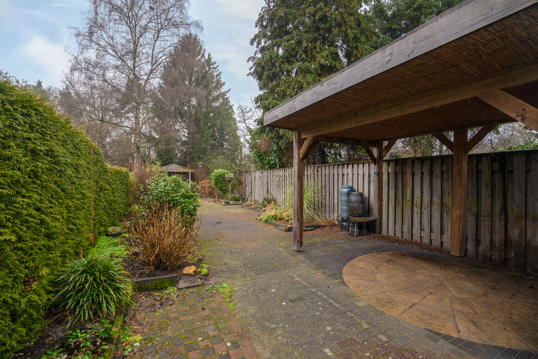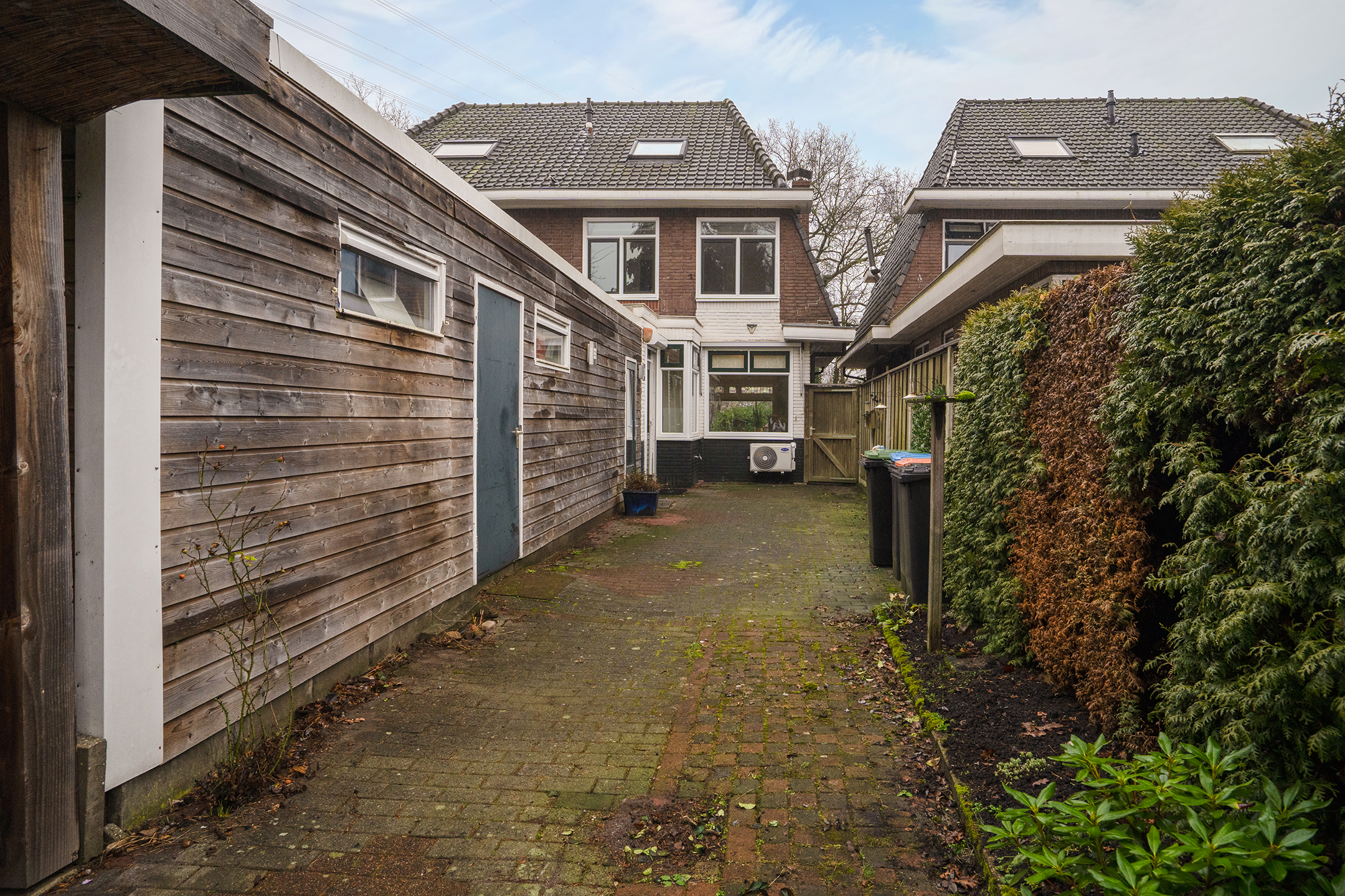 Via de praktische zijpoort naast de woning is de achtertuin ook achterom bereikbaar, ideaal voor fietsen en containers.