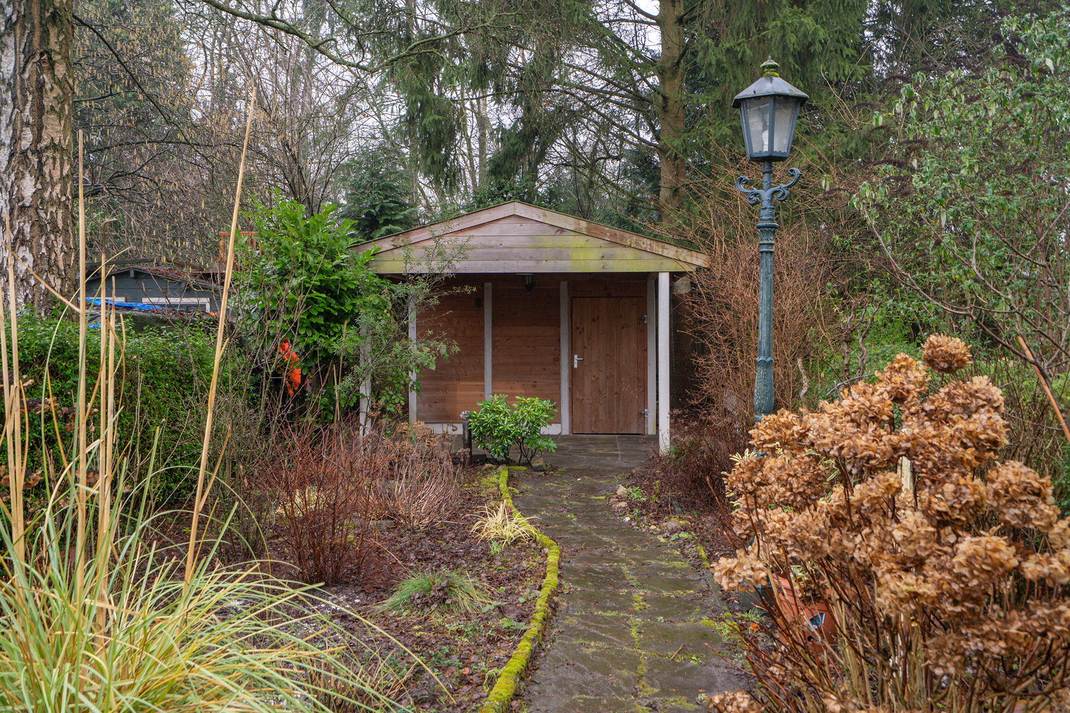 Helemaal achter in de tuin staat bovendien nog een derde, vrijstaande houten berging.