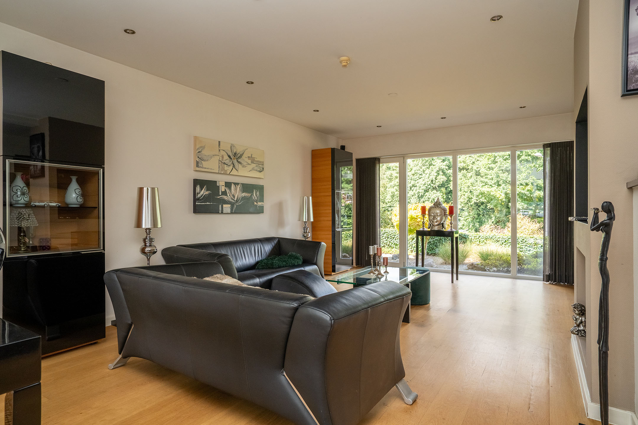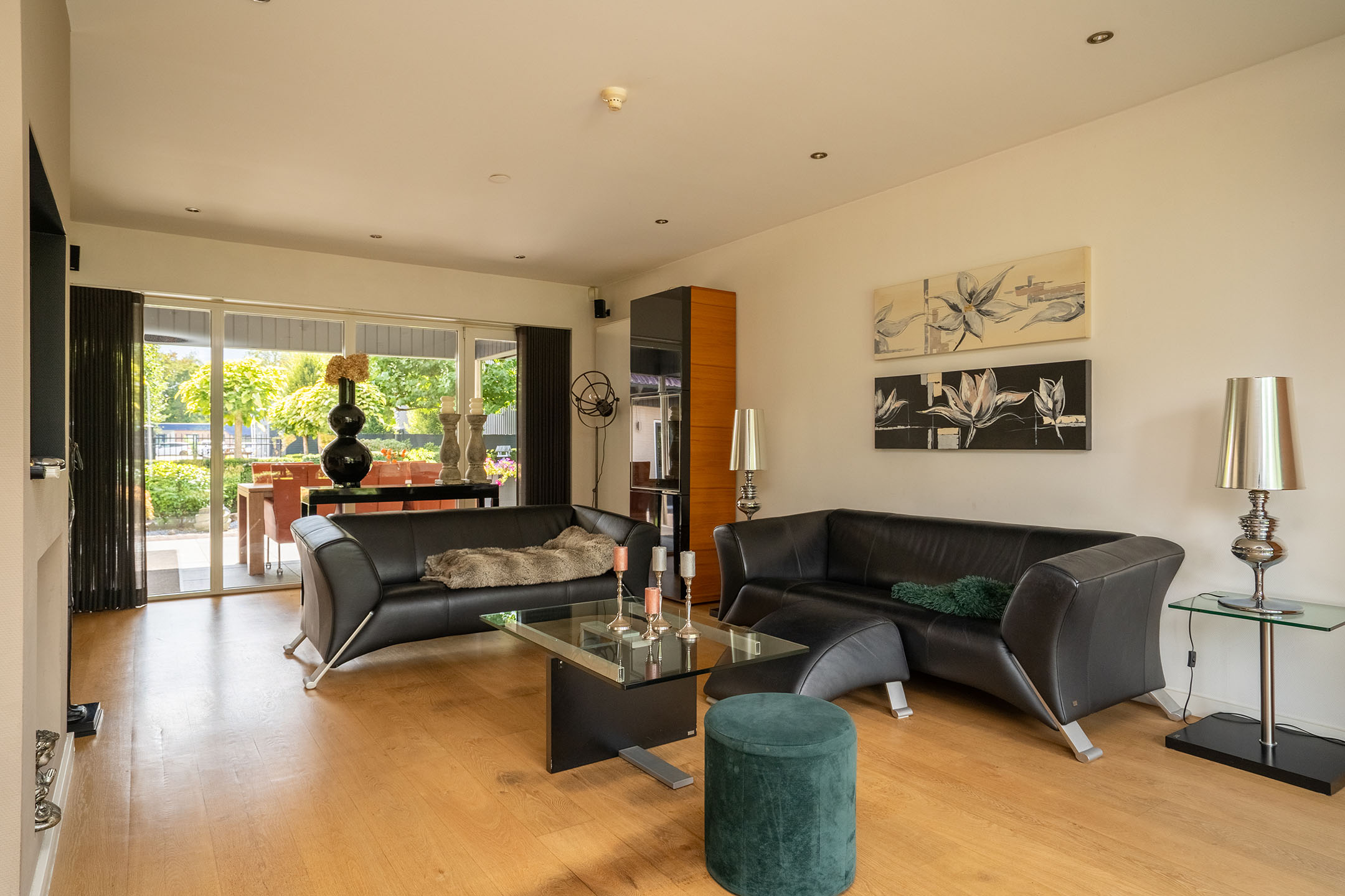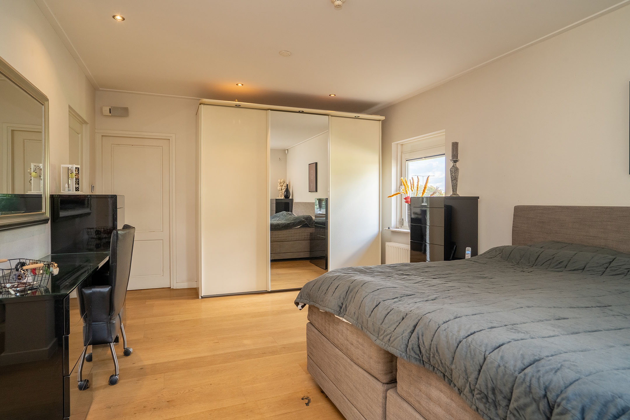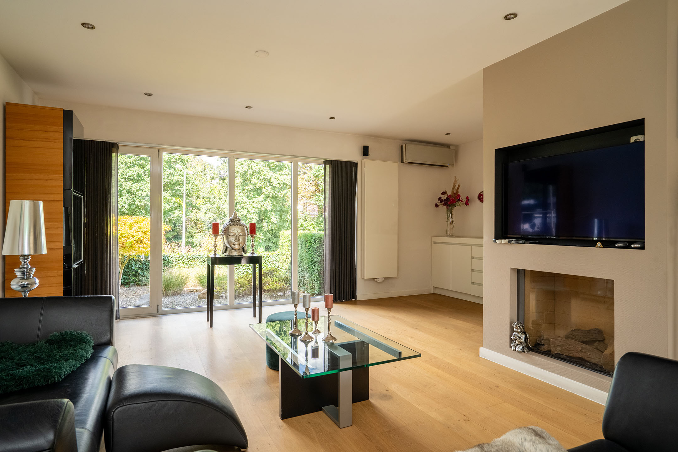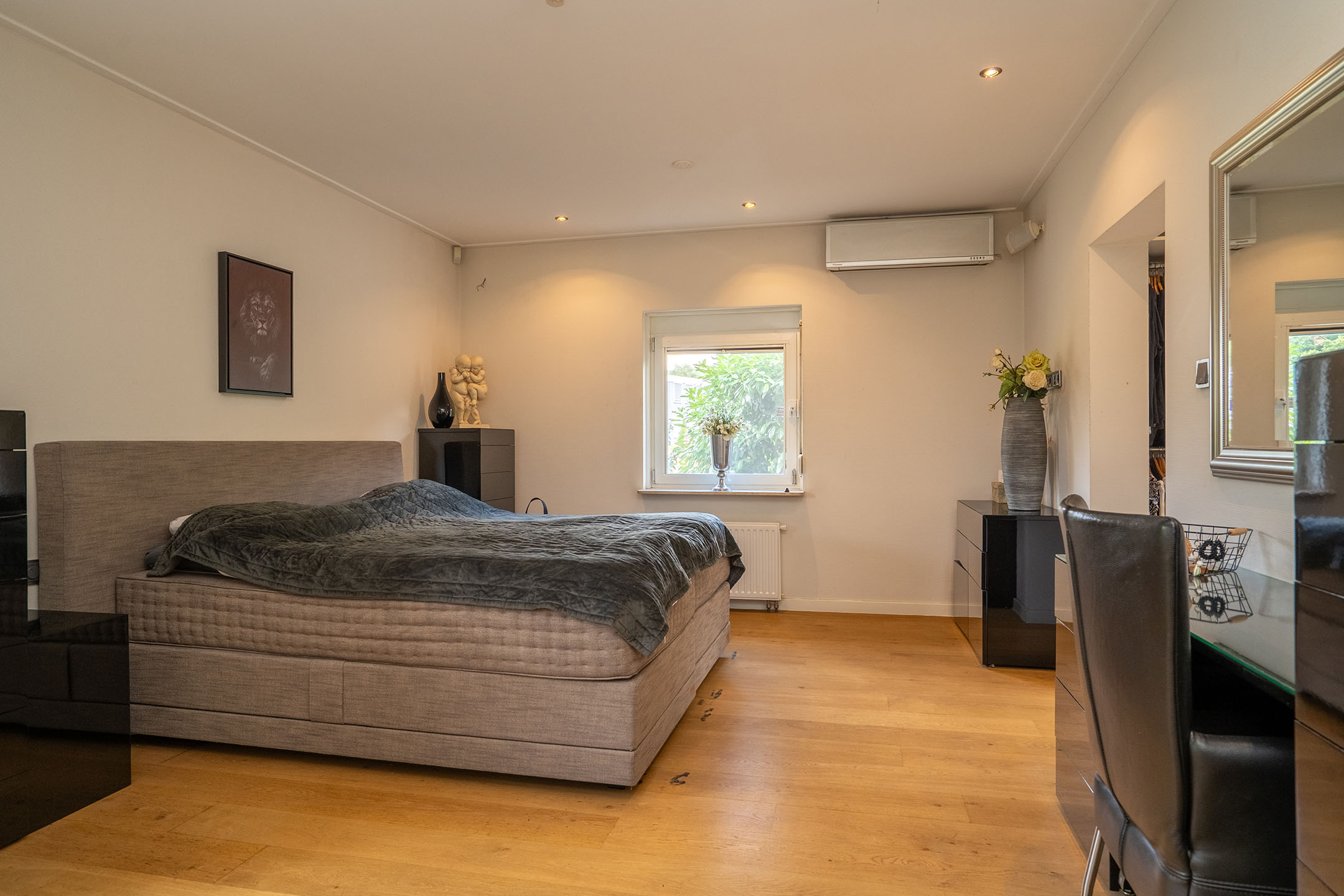 De woonkamer ligt aan de voor- en zijkant van de woning en heeft eveneens veel lichtinval. Hier vind je ook een airconditioning, wat zorgt voor extra comfort in alle seizoenen. De gehele begane grond is voorzien van een doorlopende vloer, wat rust en eenheid creëert. De woning is daarnaast ook te bereiken via de trap aan de voorzijde.