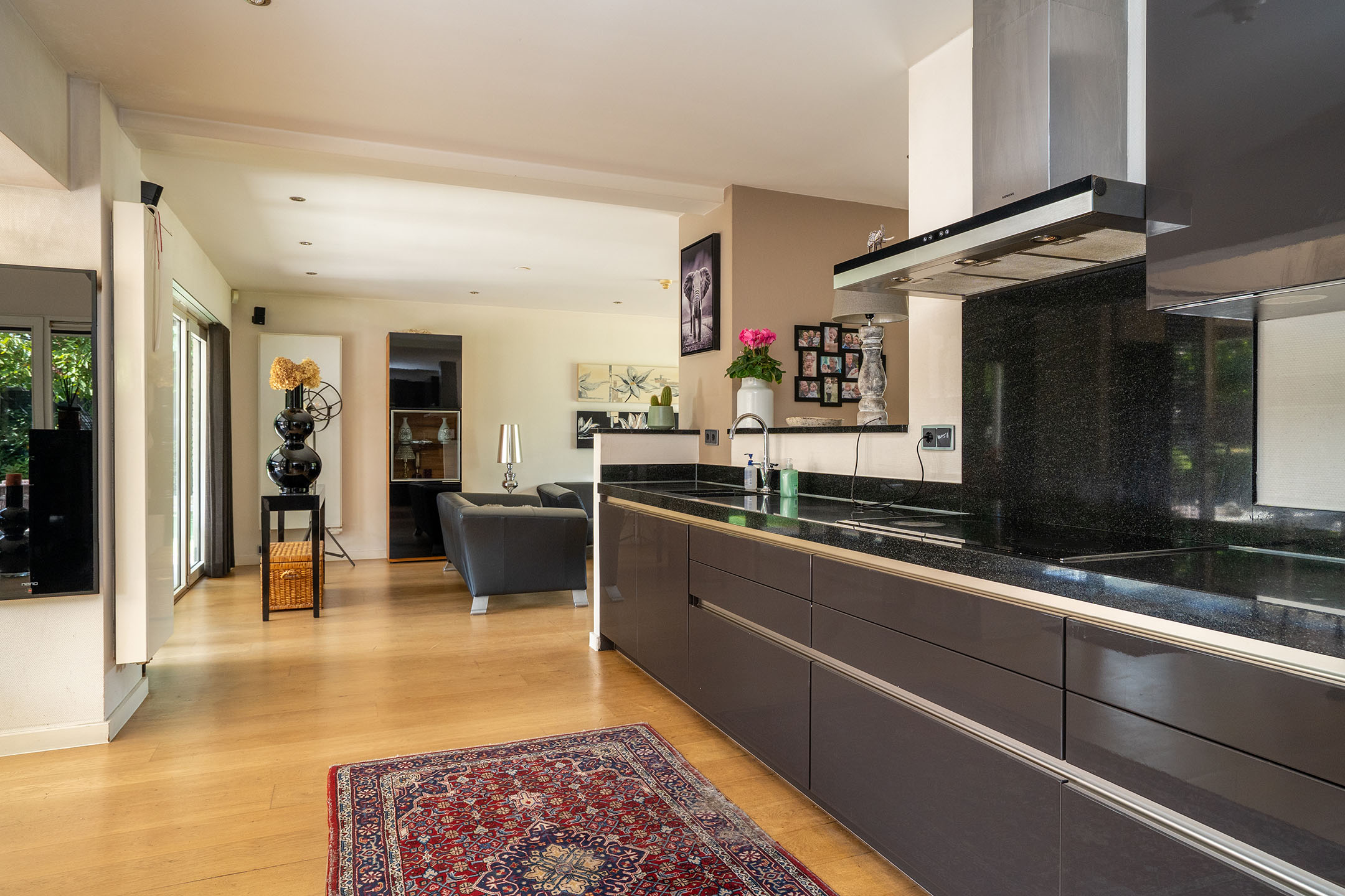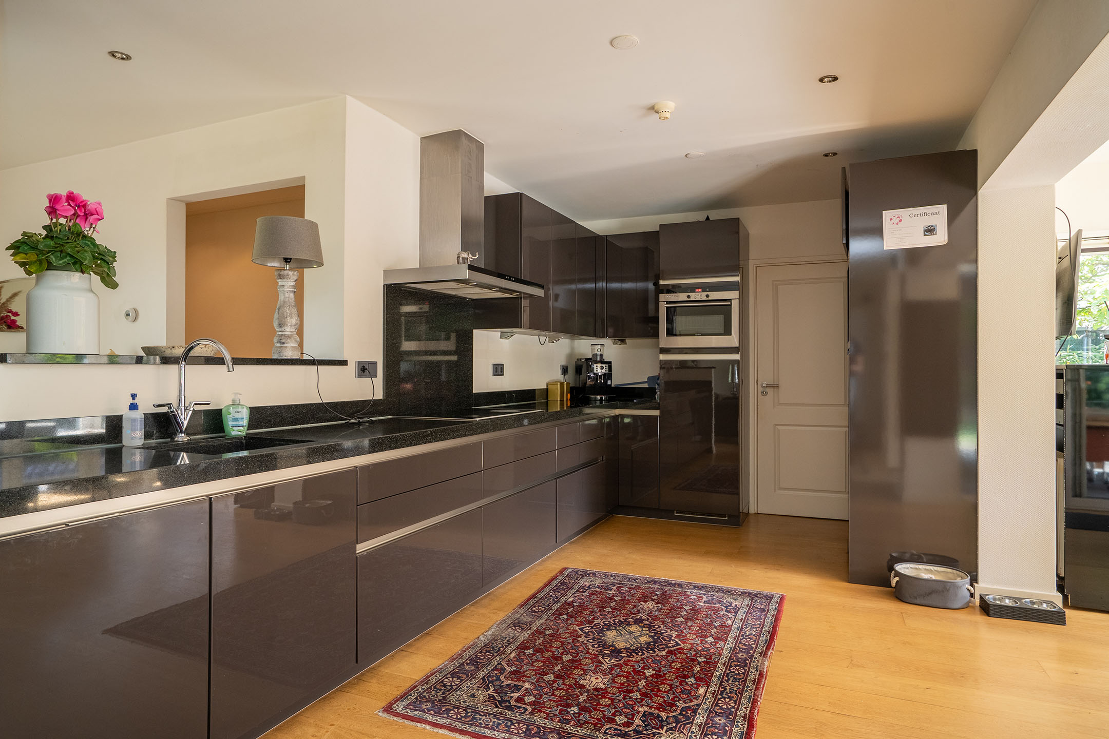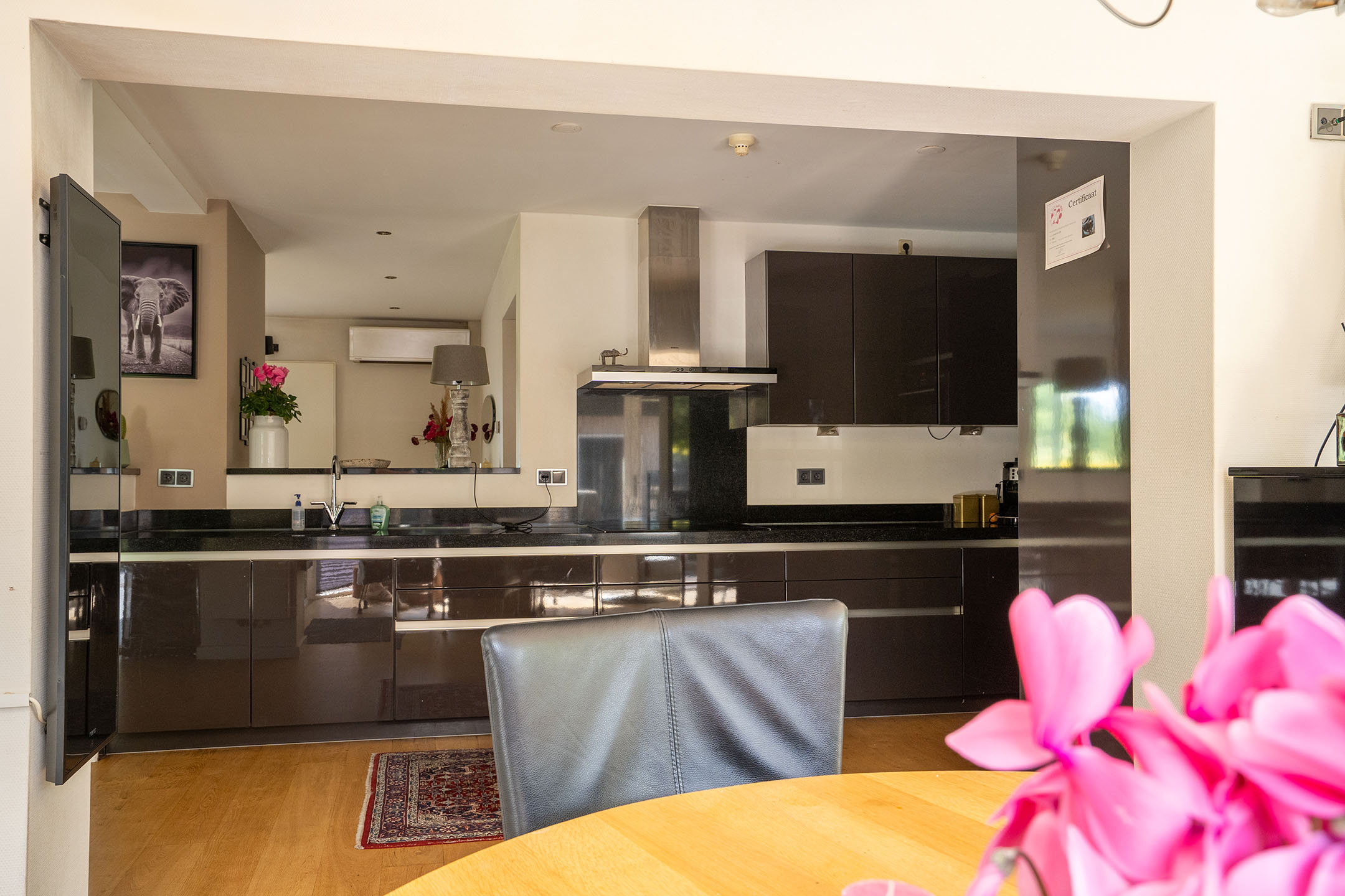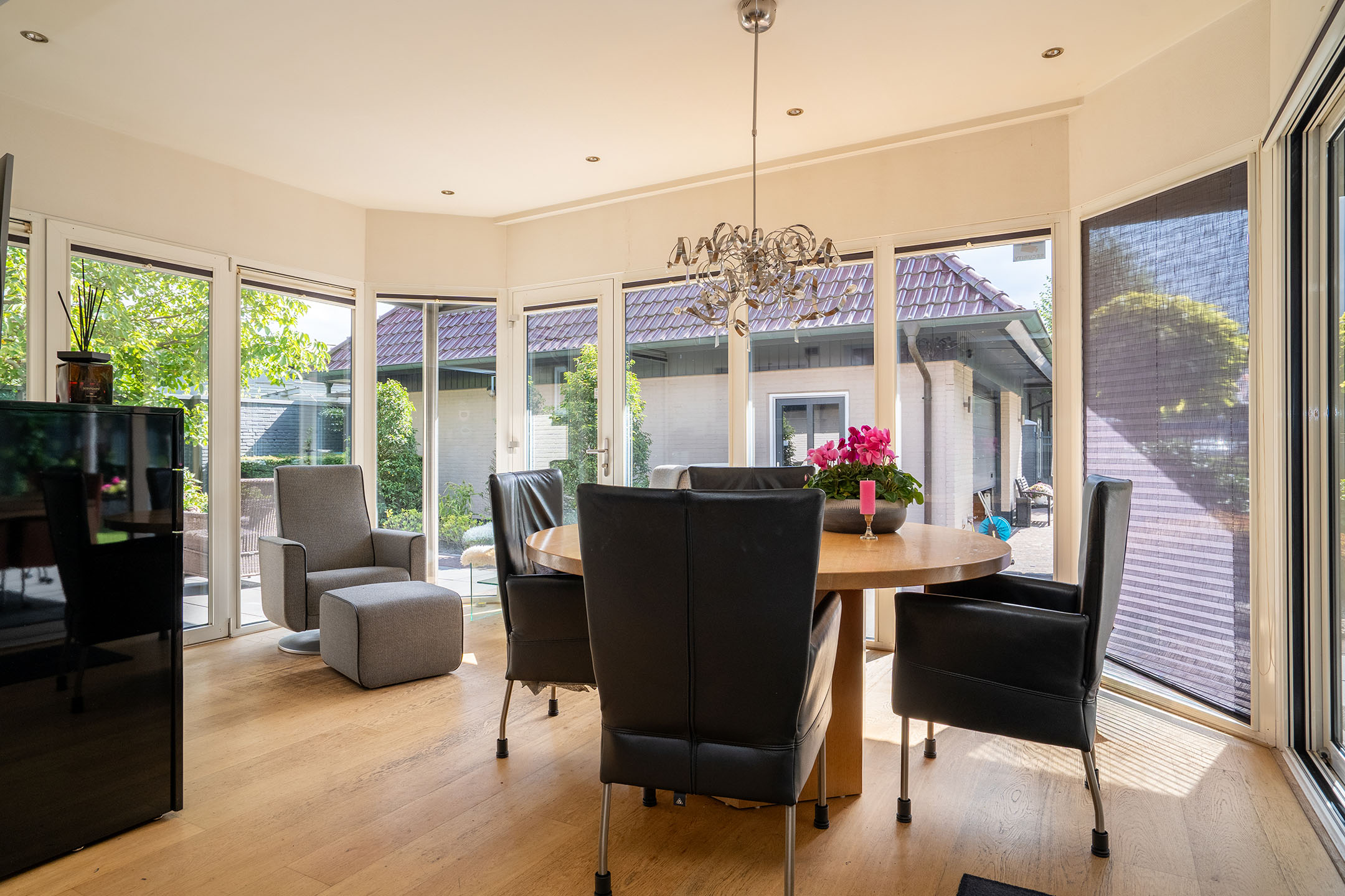 Via de ruime oprit bereik je de entree van de woning. Hier stap je direct binnen in de lichte eetkamer/serre met rondom grote raampartijen, waardoor er een heerlijke hoeveelheid daglicht naar binnen valt. Deze ruimte staat in open verbinding met de moderne keuken, die is uitgerust met alle benodigde inbouwapparatuur en veel opbergruimte.