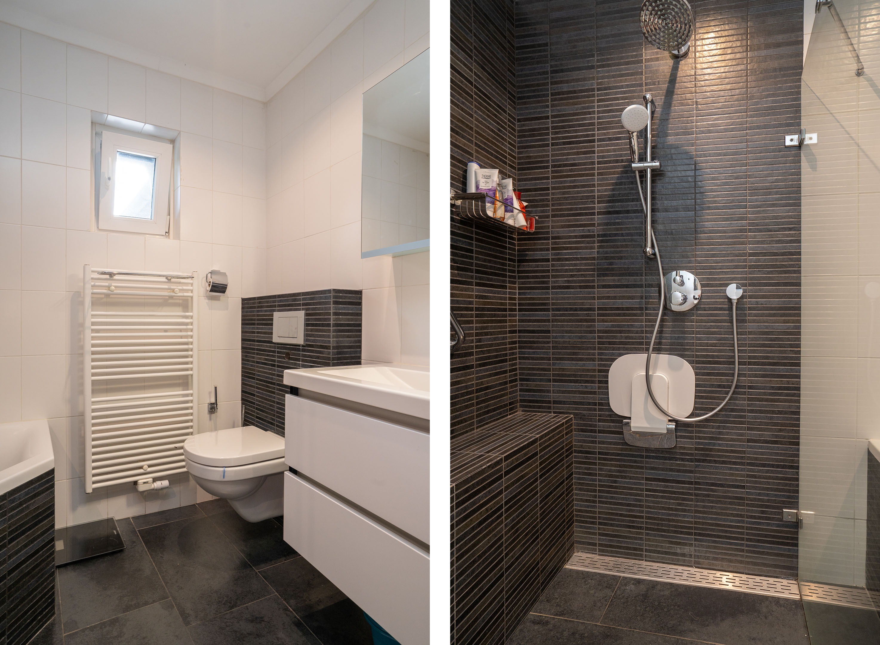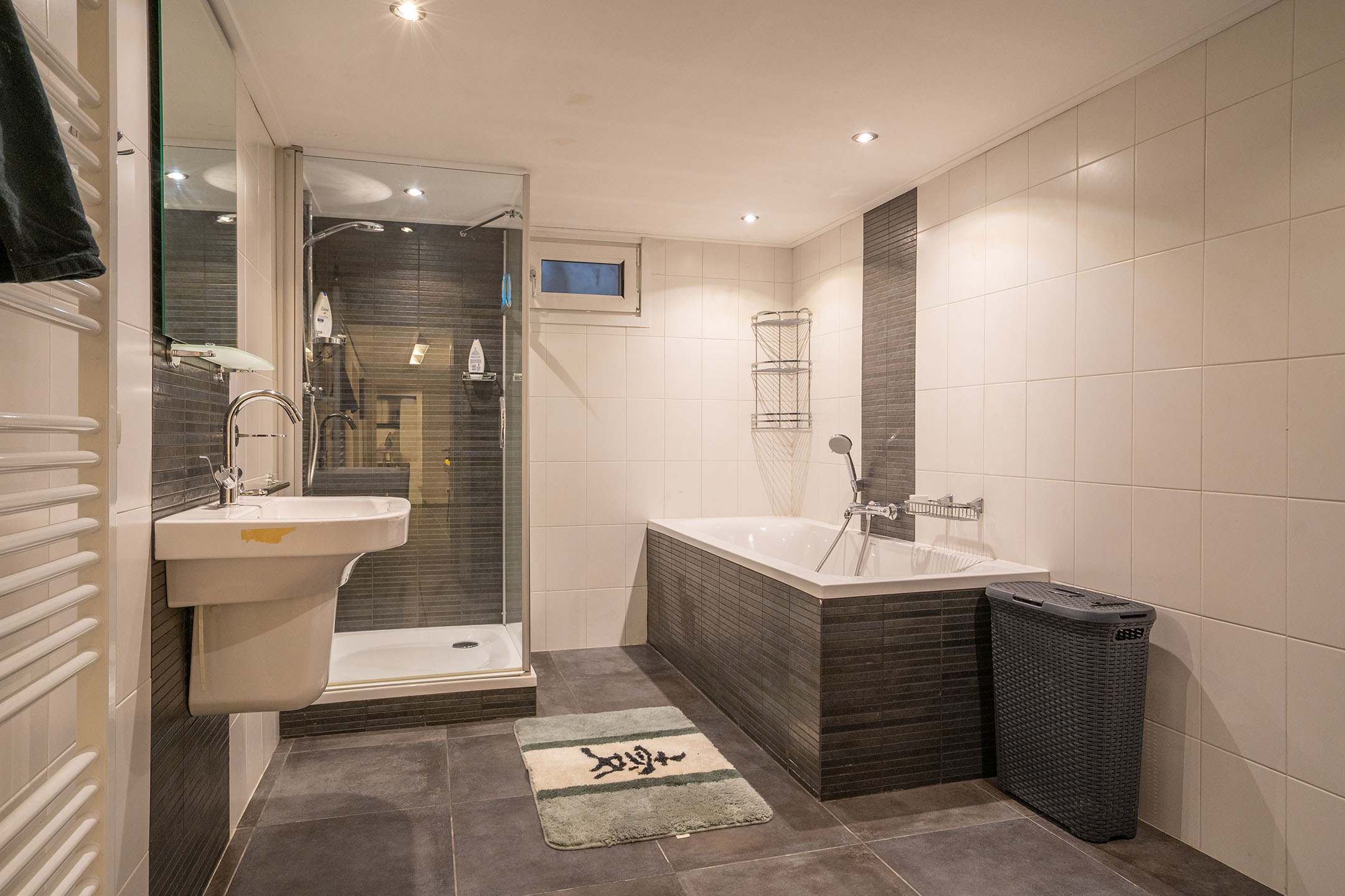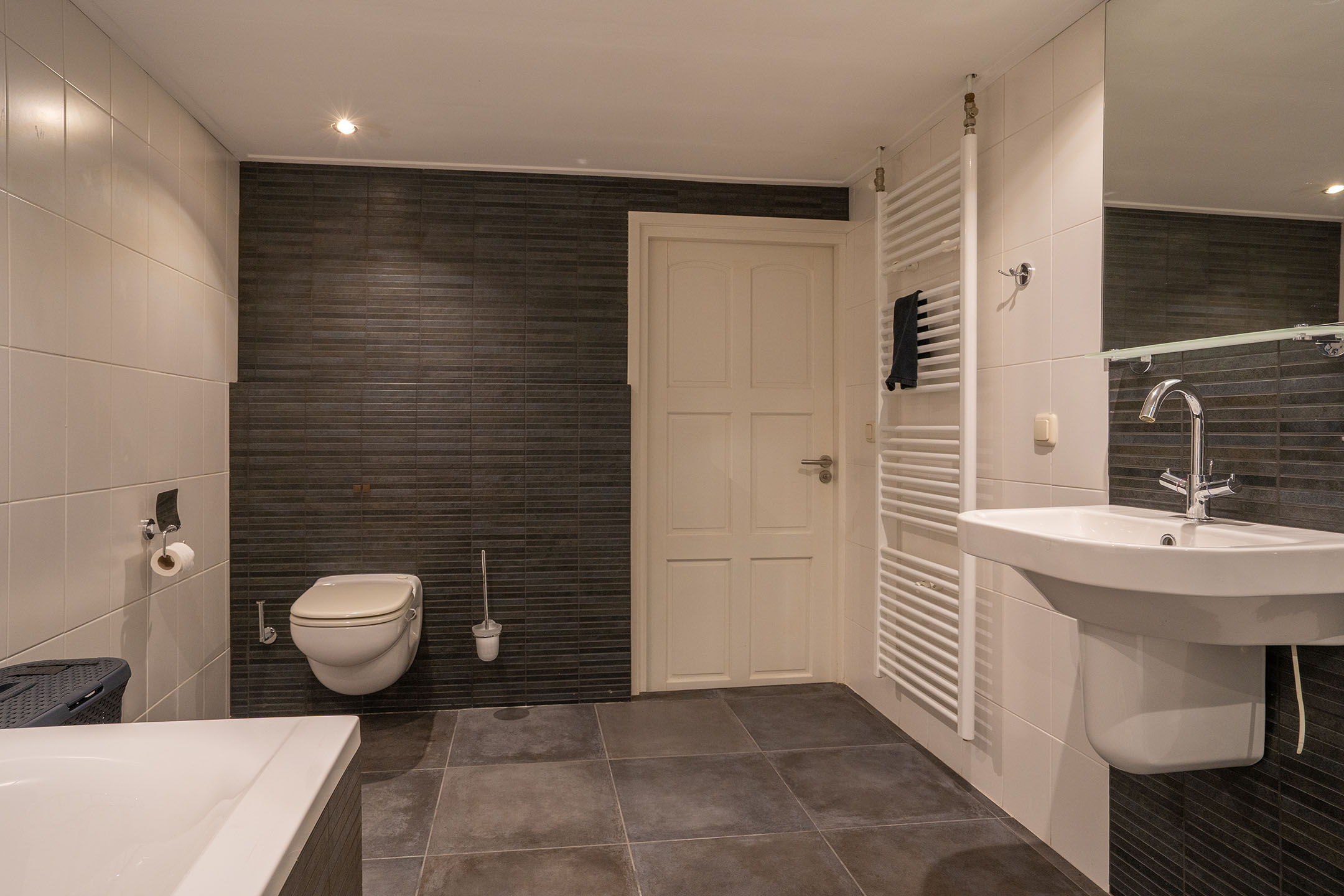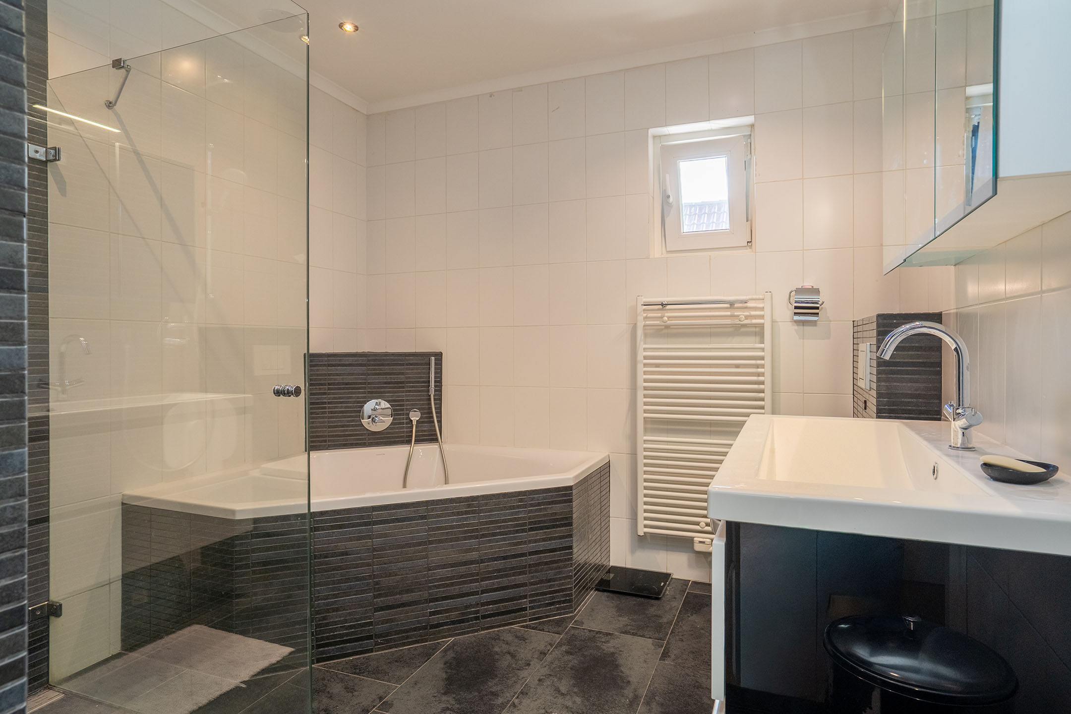 De ruim opgezette badkamer is geheel betegeld en voorzien van een douche, heerlijk ligbad, wastafel met spiegel, radiator en toilet. Een comfortabele en complete ruimte waar je van alle gemakken bent voorzien.