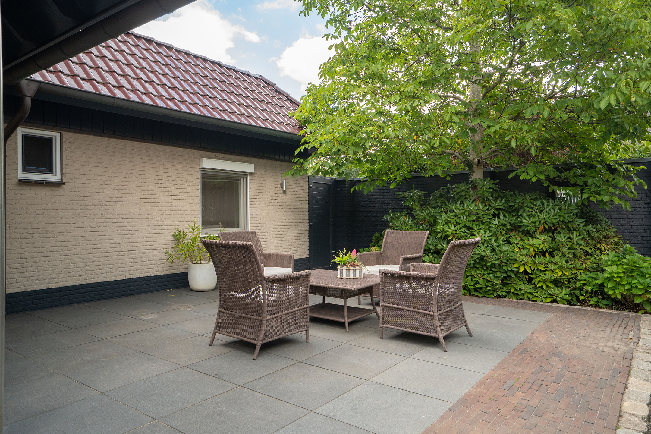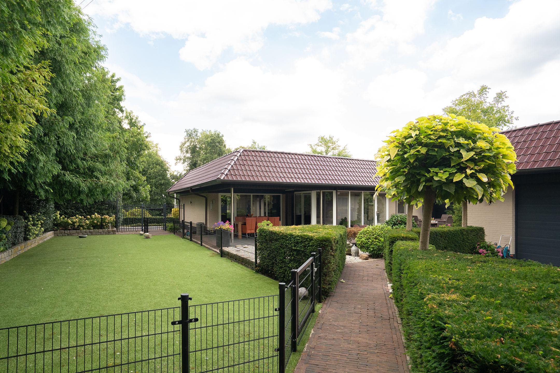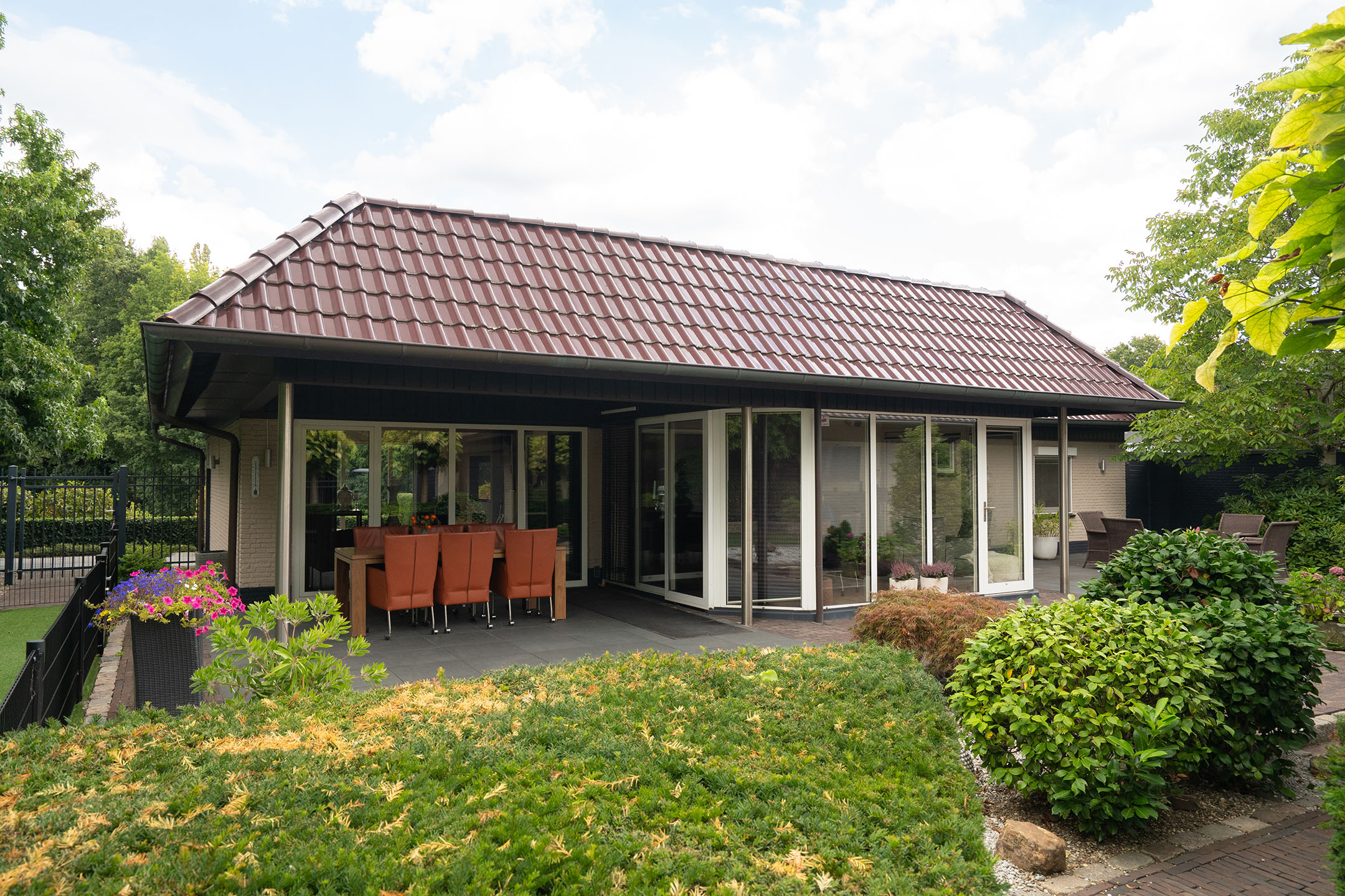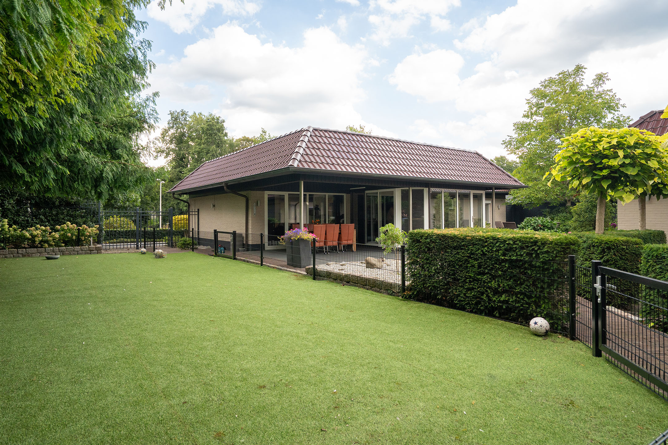 De bungalow wordt omringd door een verzorgde en onderhoudsvriendelijke tuin die veel privacy biedt. Er is een royaal overdekt terras waar je beschut en in alle rust kunt genieten van lange zomeravonden. Dankzij de grote raampartijen van de woonkamer en keuken is er een prettige verbinding tussen binnen en buiten. De tuin is strak aangelegd met sierbestrating, kunstgras en fraaie beplanting. Er zijn meerdere zitjes gecreëerd, zodat er op ieder moment van de dag een plek in de zon of schaduw te vinden is. De borders met struiken, bomen en bloeiende planten zorgen daarbij voor een sfeervol geheel.
