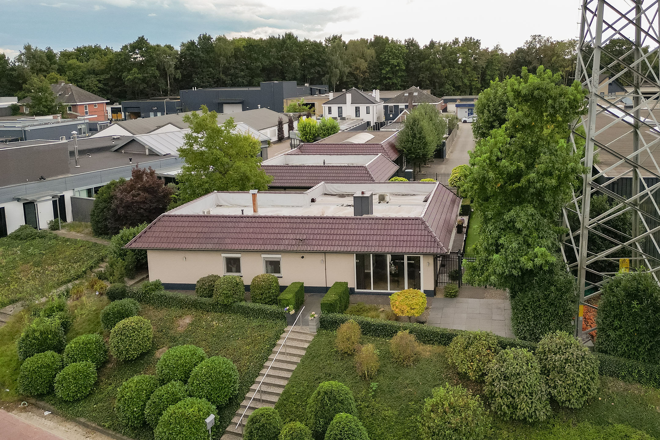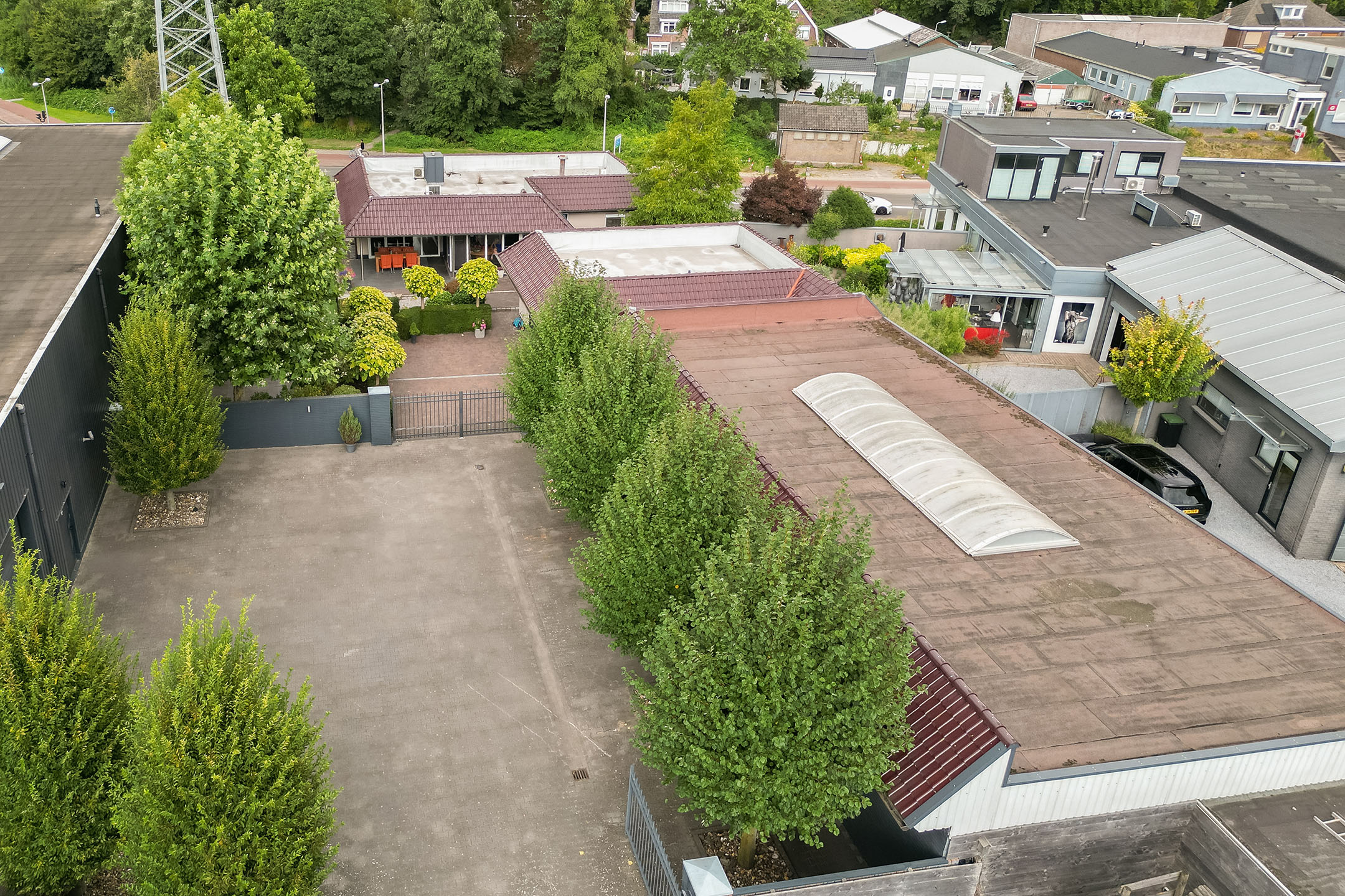 Wanneer je het perceel oprijdt via de Josinkstraat, passeer je eerst deze indrukwekkende bedrijfspanden. Achter het afsluitbare hek bevindt zich vervolgens de bungalow aan de Hendrik ter Kuilestraat 33, compleet met eigen oprit, grote garage en tuin. Dit maakt het geheel bijzonder geschikt voor wie wonen en ondernemen wil combineren, of voor investeerders die groot willen denken.