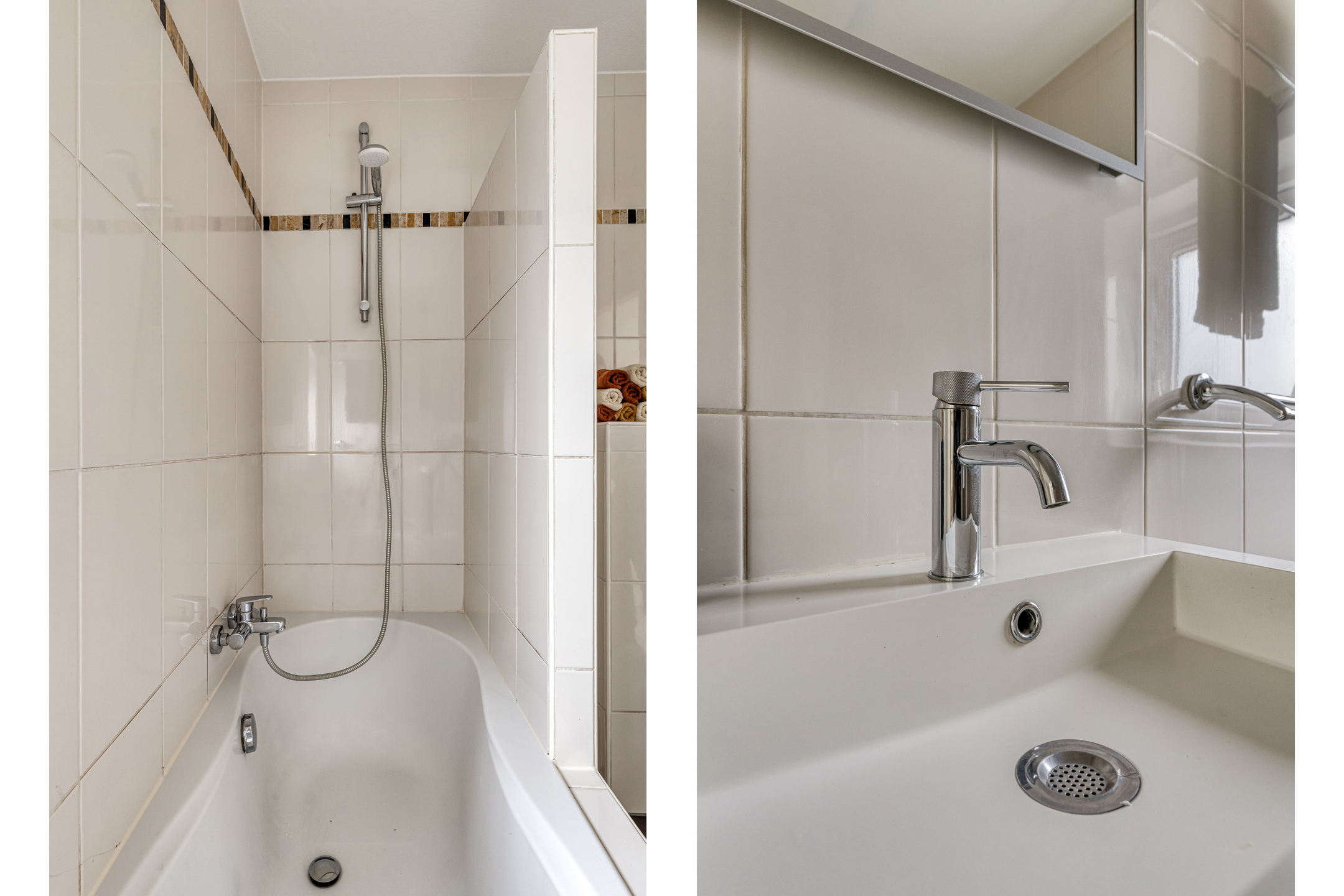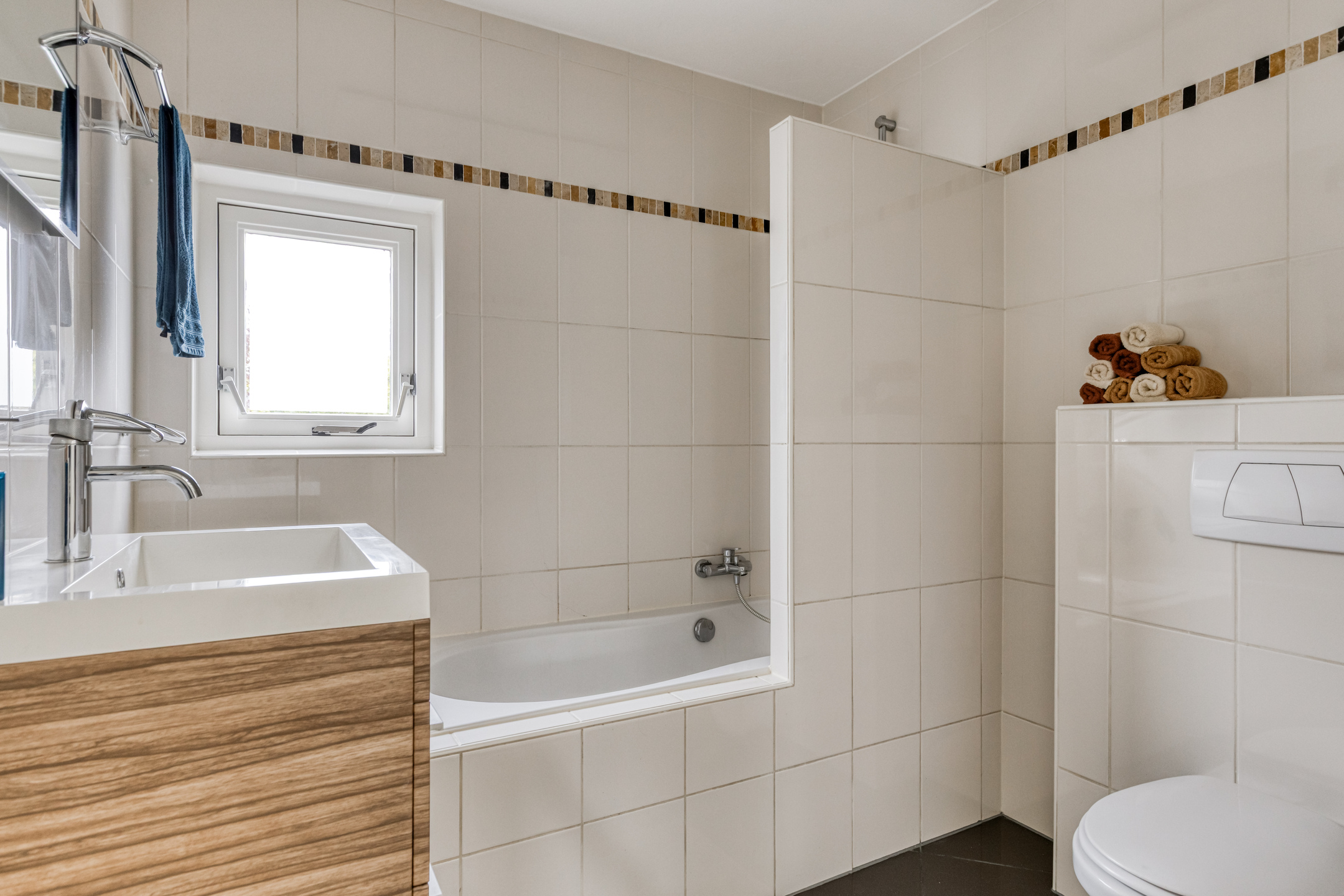 De geheel betegelde badkamer is praktisch ingedeeld en uitgerust met een ligbad met douche, een wastafelmeubel met opbergruimte en een toilet. Daarnaast bevindt zich op deze verdieping een handige kast met de aansluitingen voor wasmachine en droger.