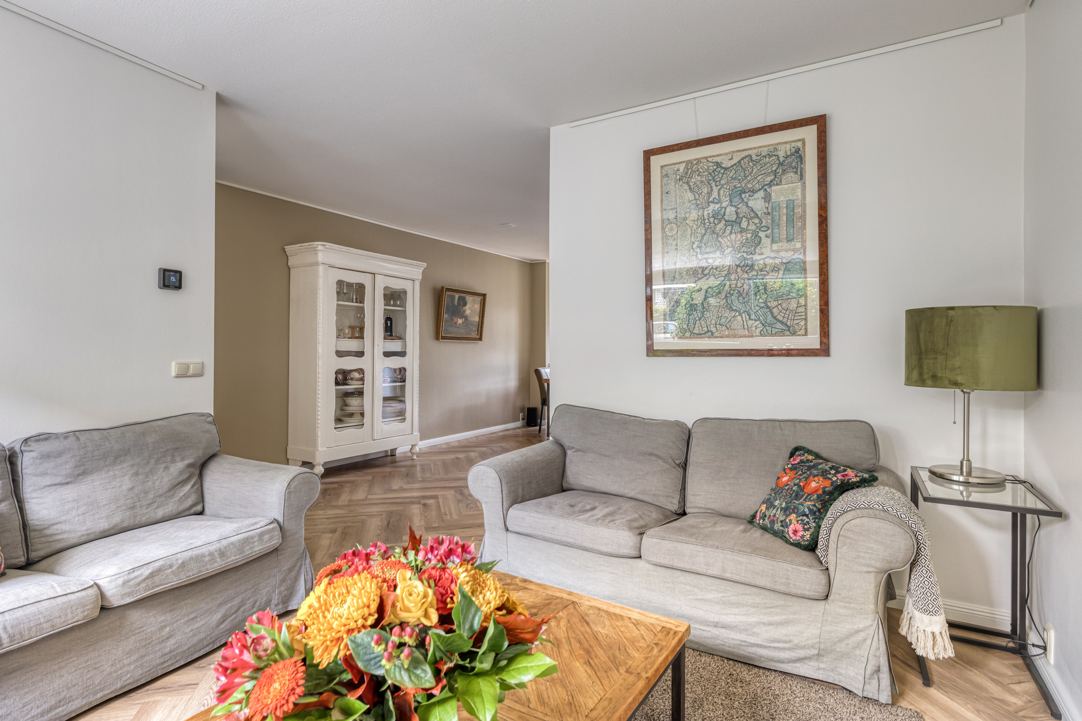 De woonkamer is een fijne leefruimte met een moderne visgraatvloer en grote raampartijen die zorgen voor veel daglicht. Aan de voorzijde bevindt zich de gezellige zithoek, terwijl de achterzijde van de woning is uitgebouwd.