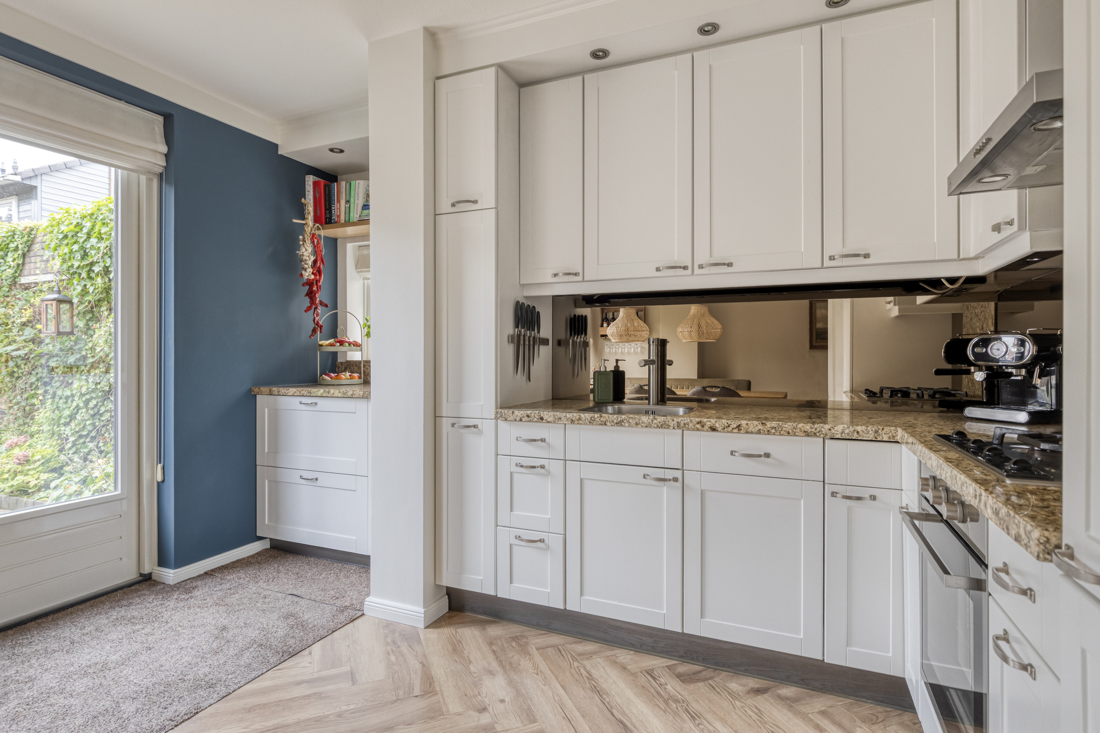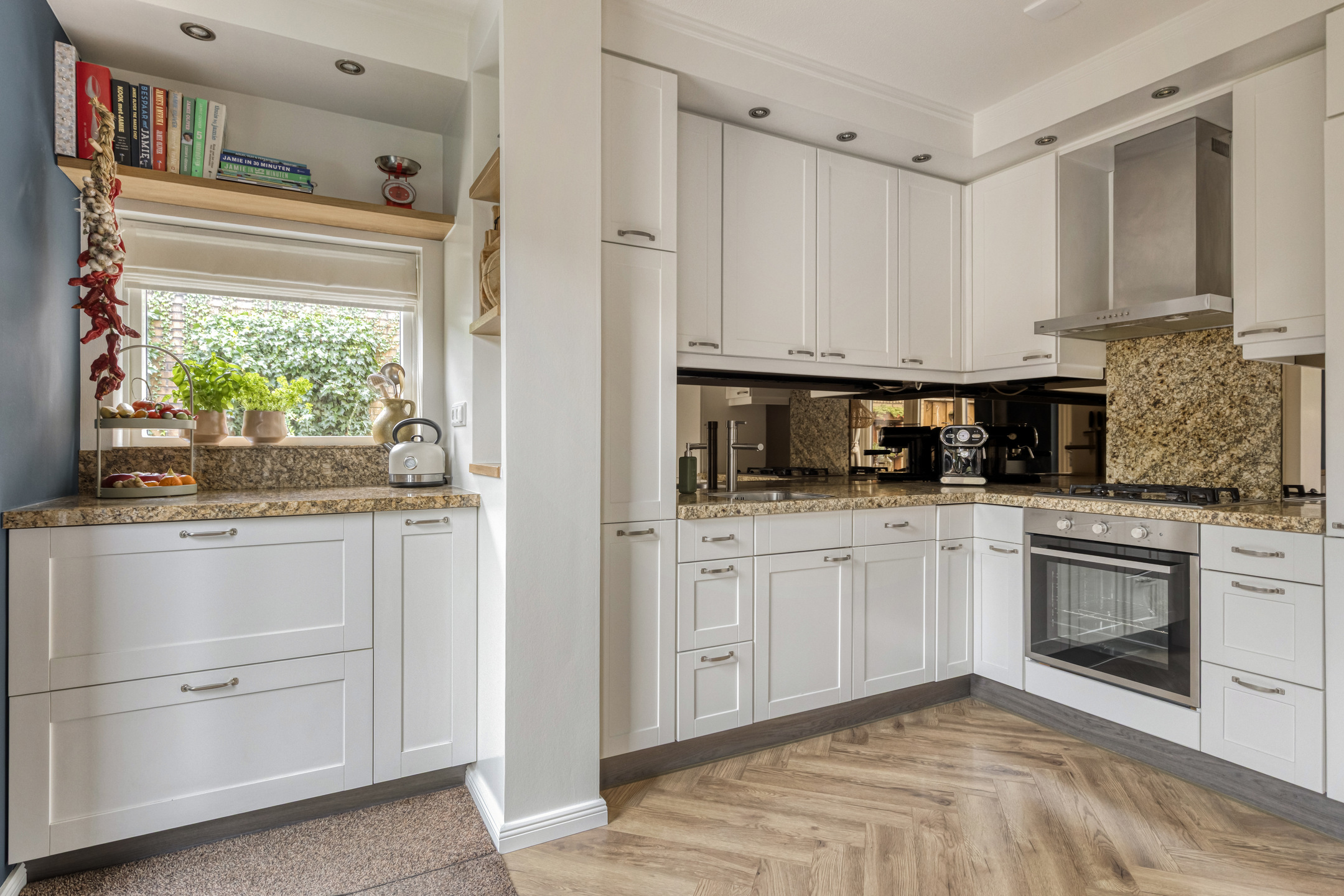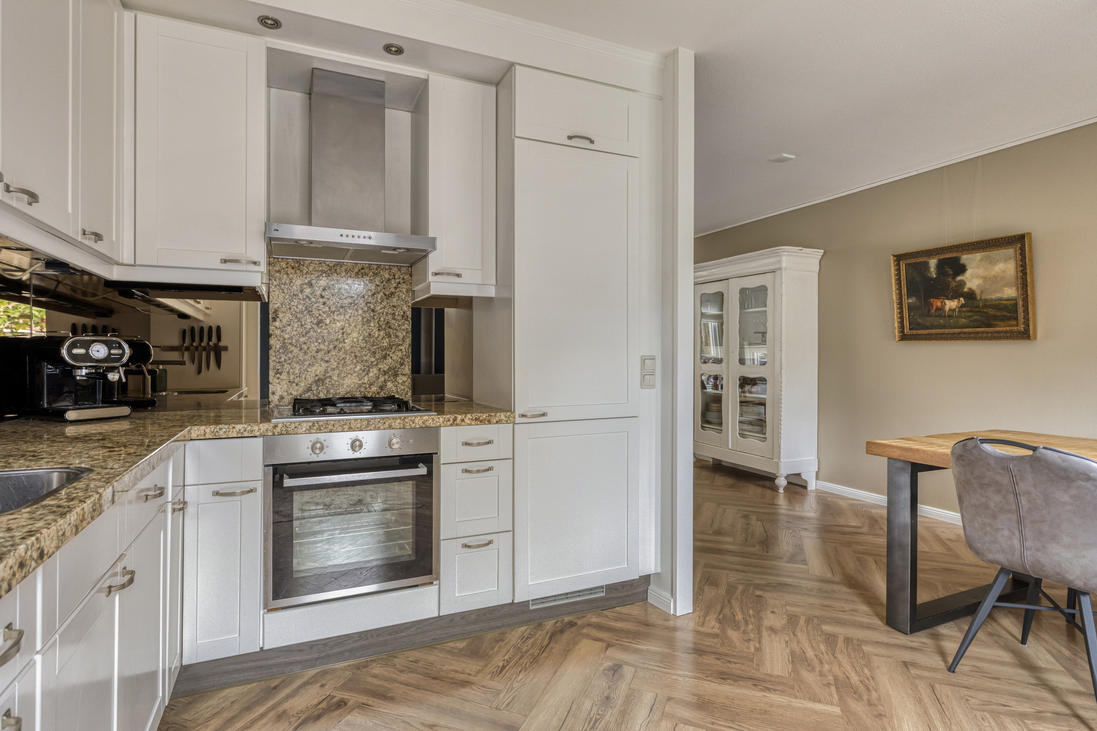 Hier is een royale eethoek gecreëerd, voorzien van een sfeervolle haard die het geheel extra warmte en gezelligheid geeft. De eethoek staat in direct contact met de keuken, die volledig is ingericht met diverse inbouwapparatuur, waaronder een oven, gasfornuis met afzuigkap, koelkast en vriezer. Vanuit de deur bij de keuken én via de dubbele tuindeuren bij de eethoek is er toegang tot de zonnige achtertuin.
