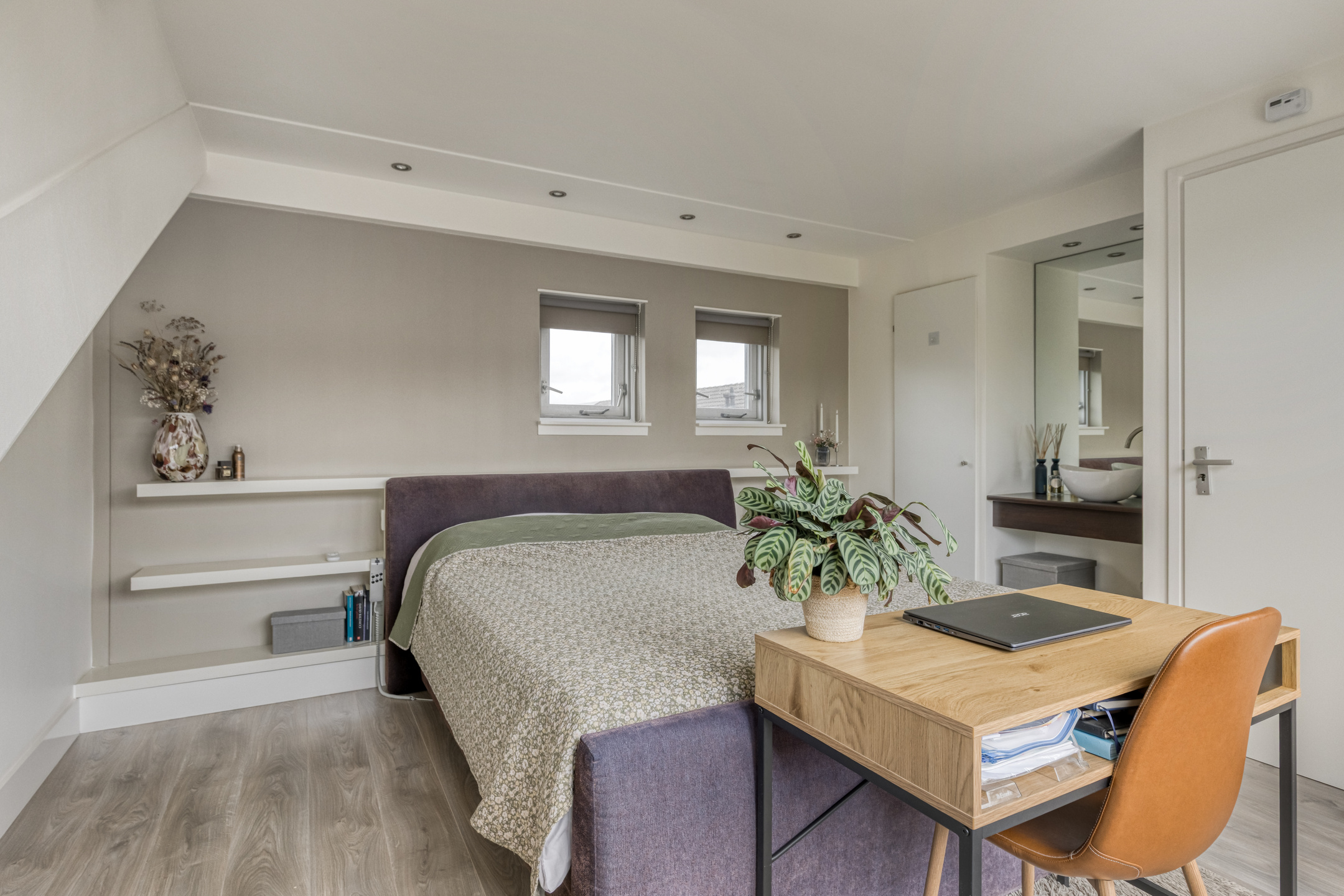 2e verdieping: Via een vaste trap bereik je de ruime zolderverdieping. Dankzij de dakkapel is hier een volwaardige slaapkamer gerealiseerd, die zich uitstekend leent als masterbedroom. De kamer is heerlijk licht door de grote ramen en voorzien van een moderne waskom met kraan, een grote spiegel en een stijlvol meubel.