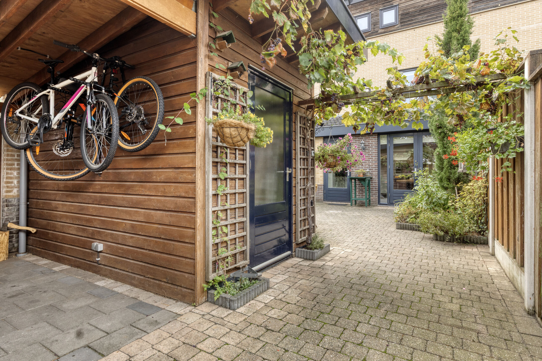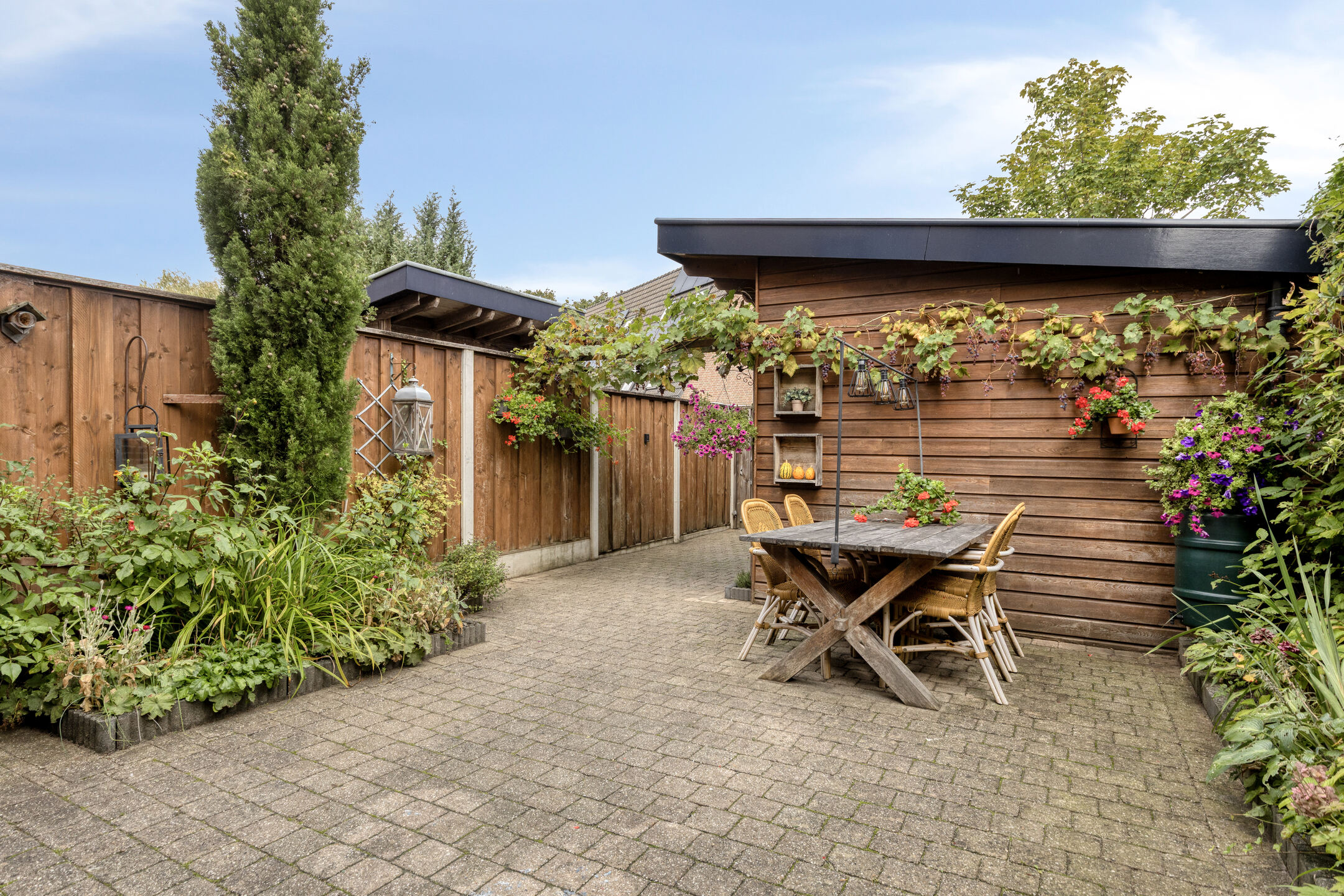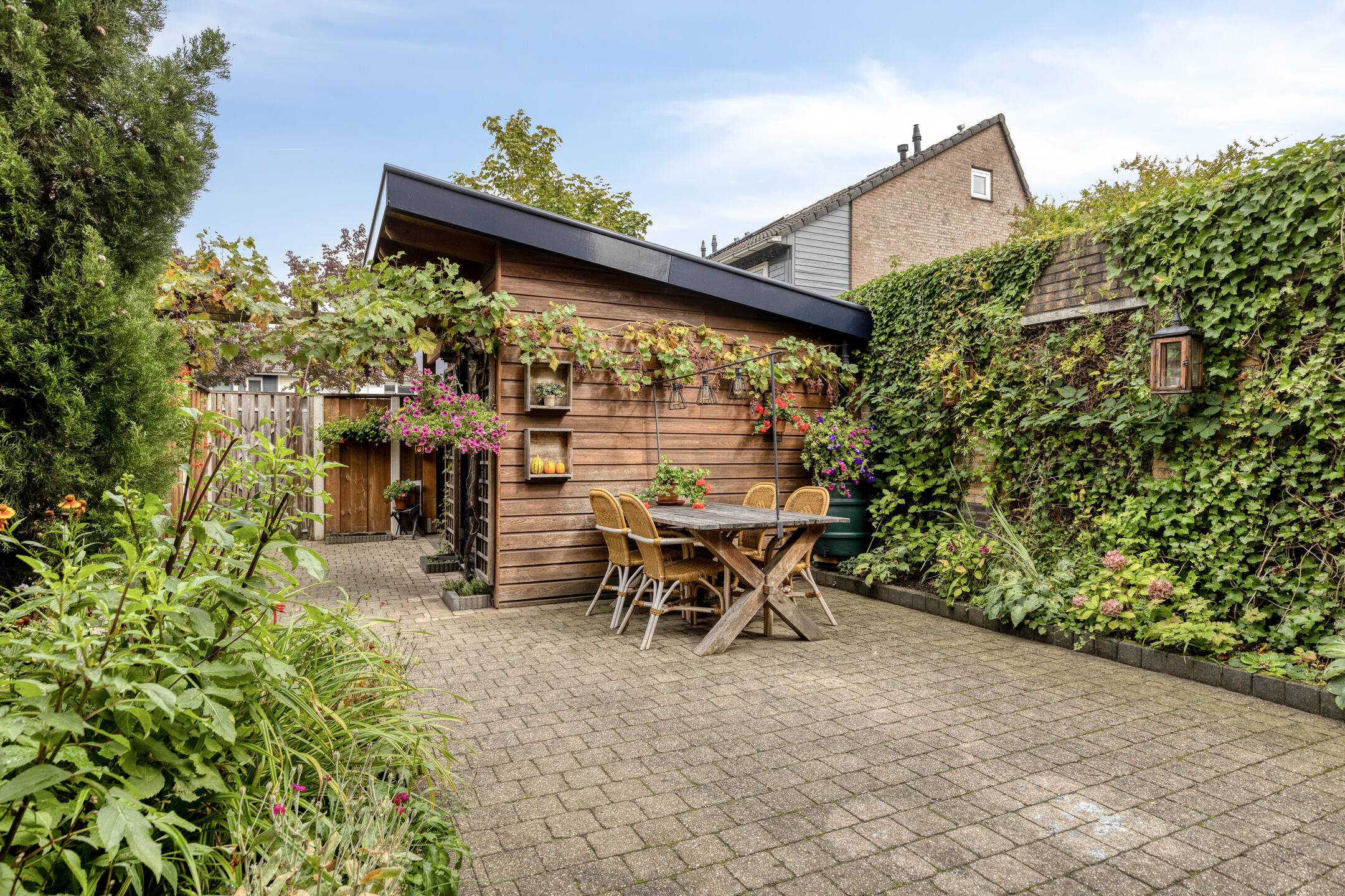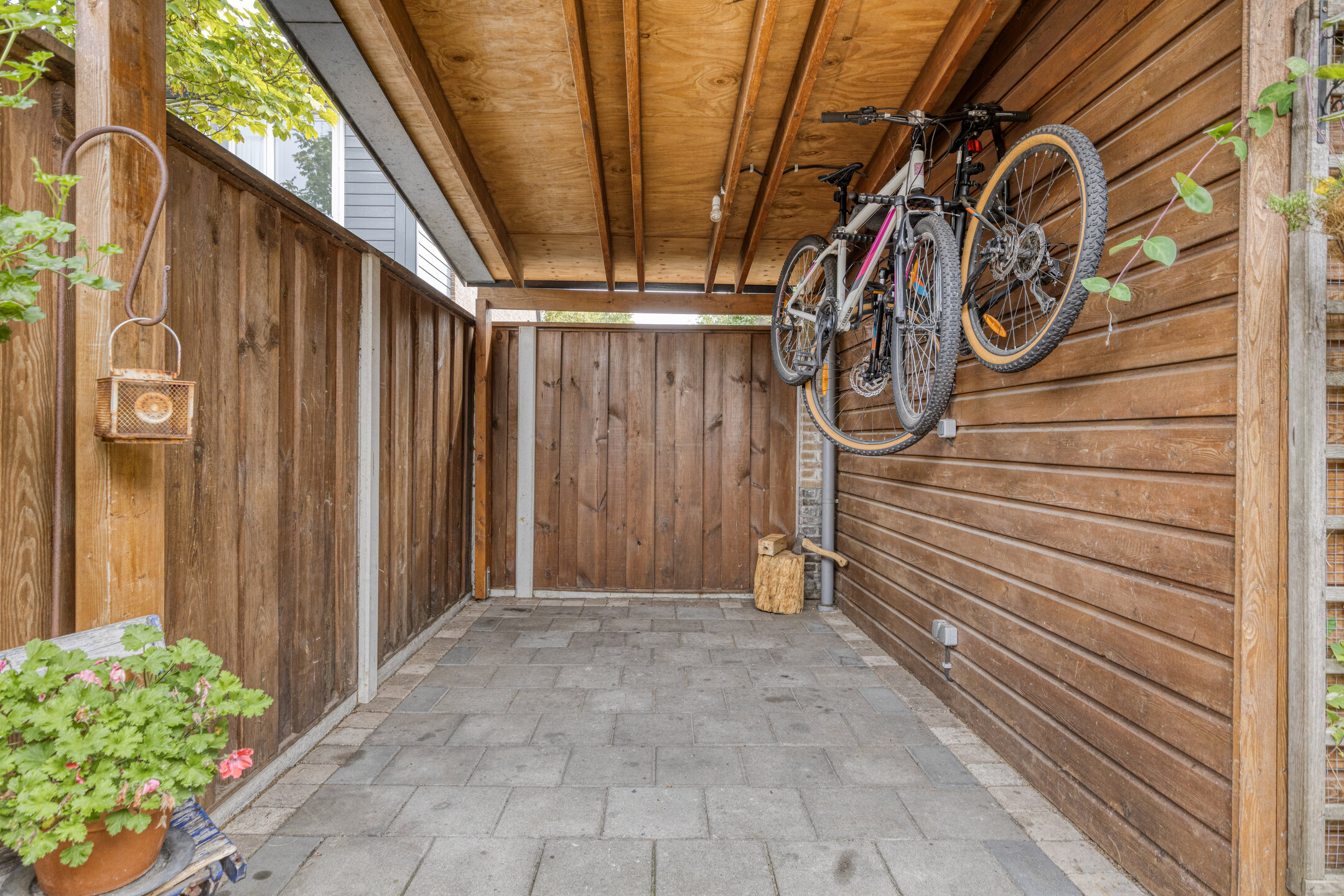 Achterin de tuin staat een ruime houten berging, ideaal voor het opbergen van fietsen en tuingereedschap. Aangrenzend bevindt zich een praktische overkapping.