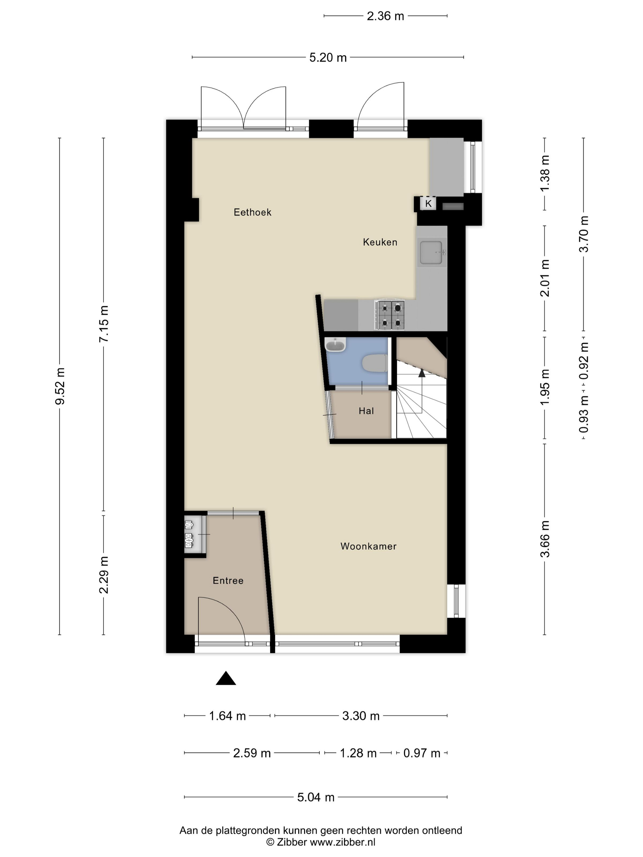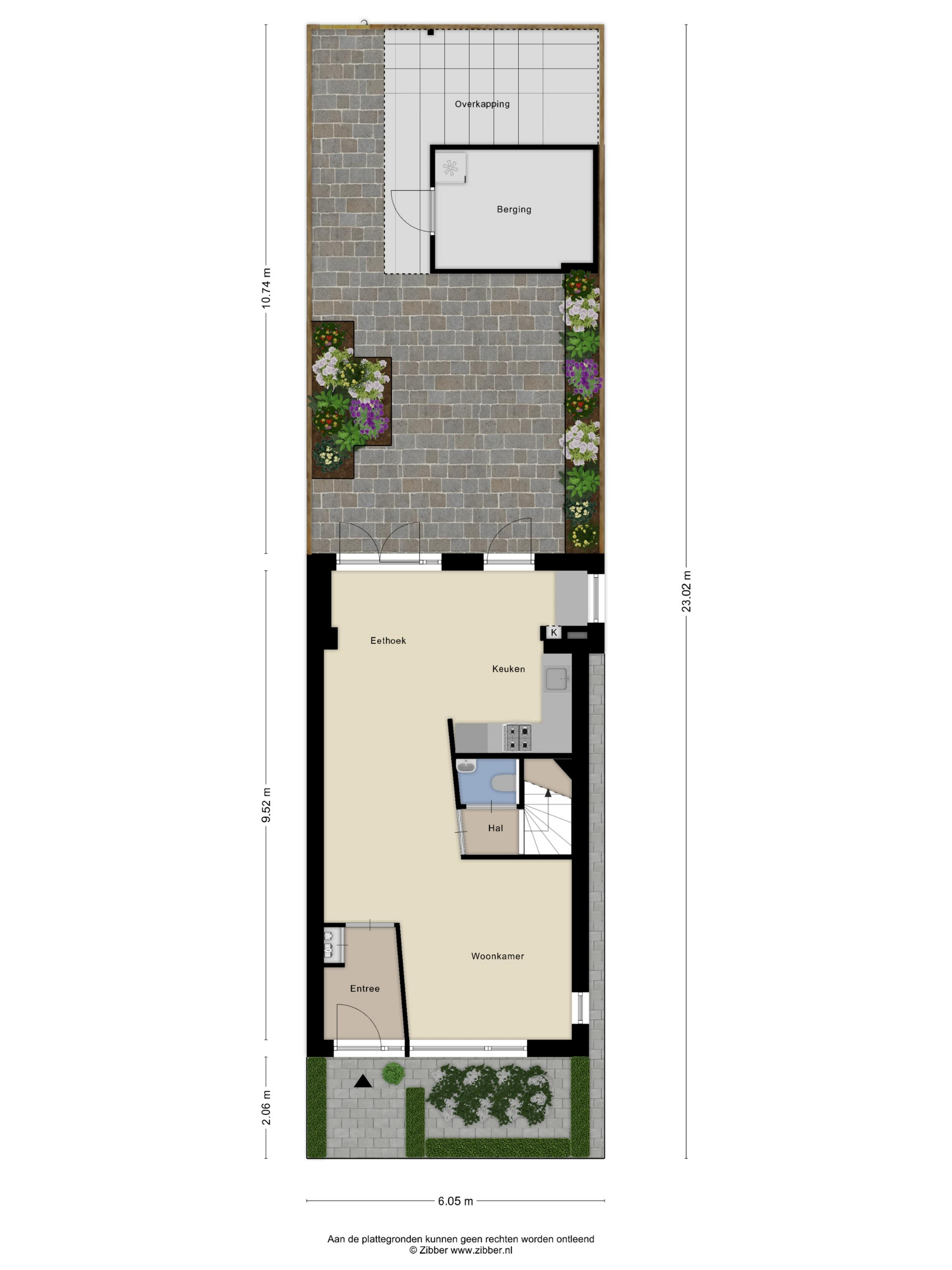 Tussen de woonkamer en de eethoek bevindt zich de hal, waar ook het toilet met fontein en de trapopgang naar de eerste verdieping te vinden zijn.