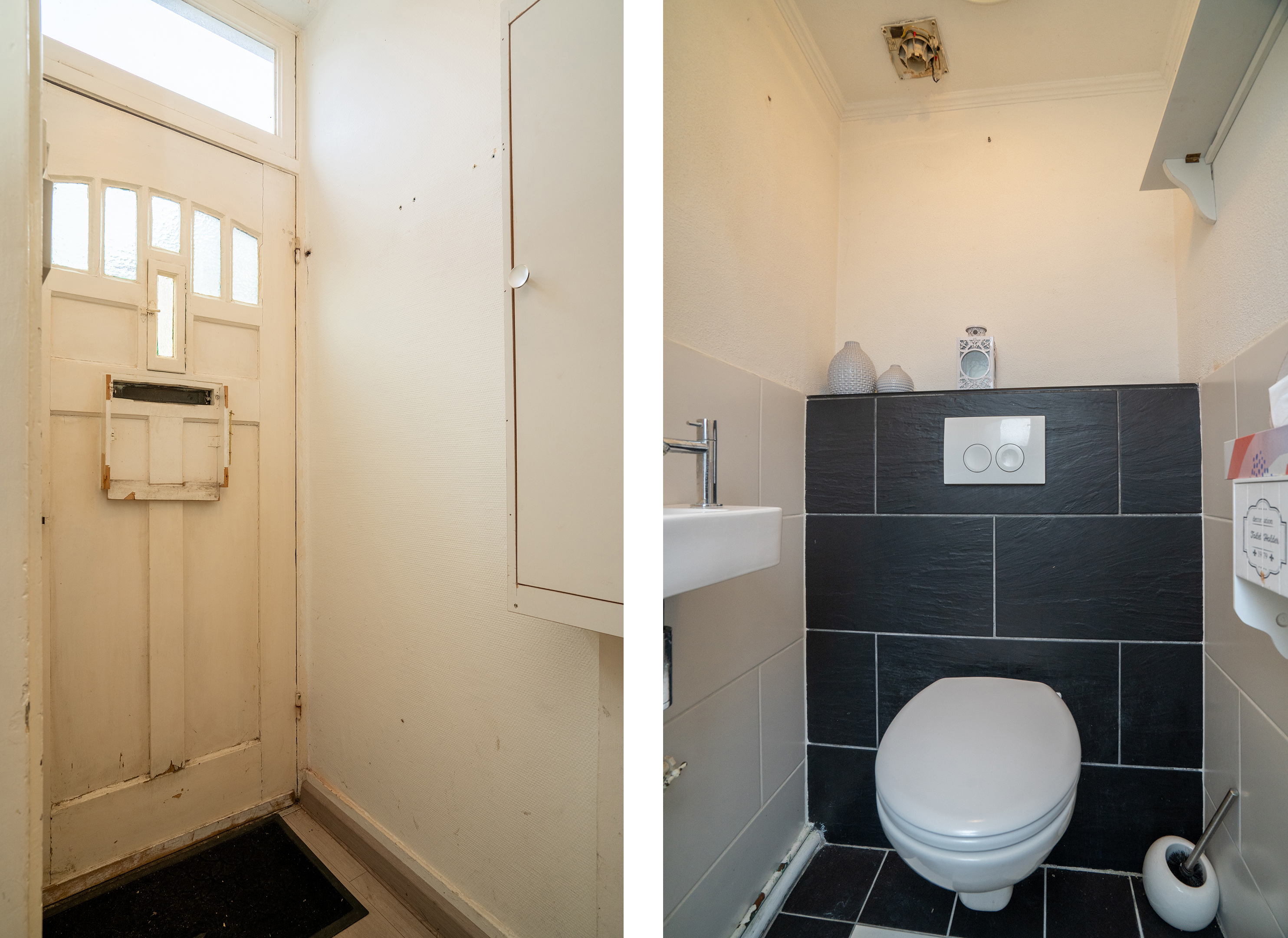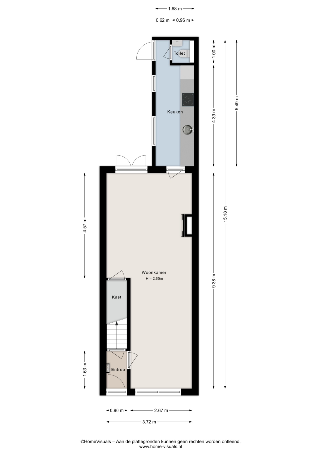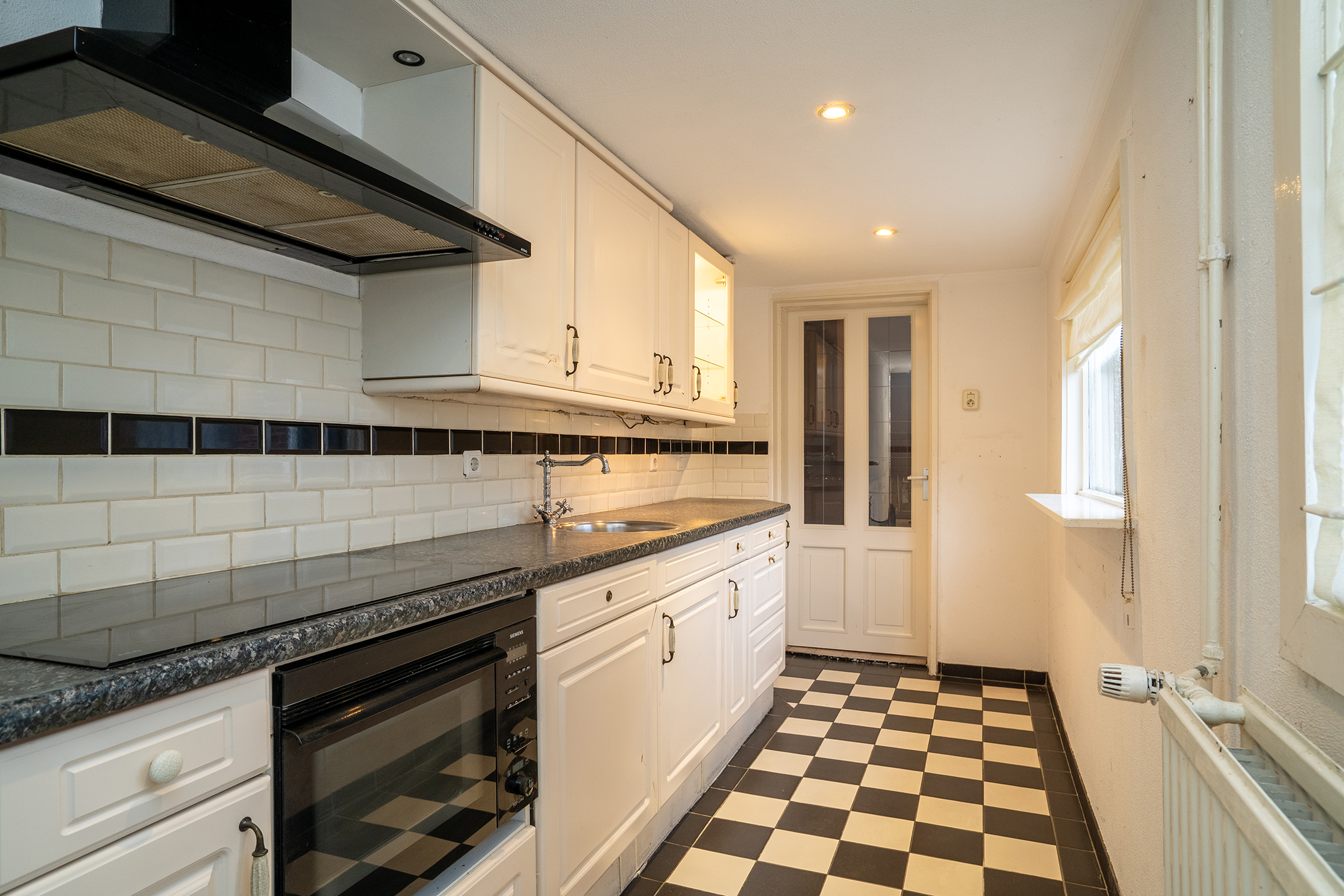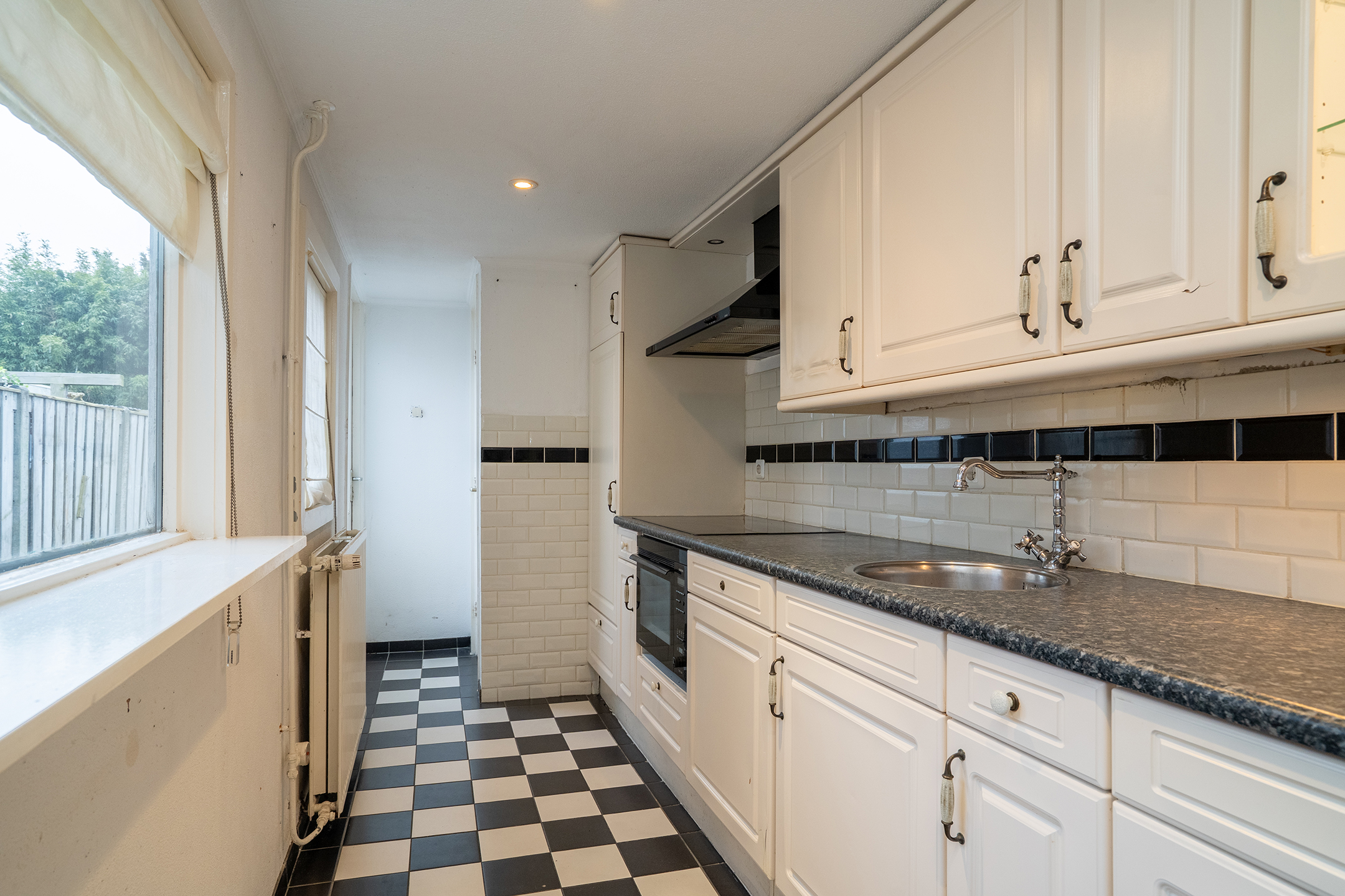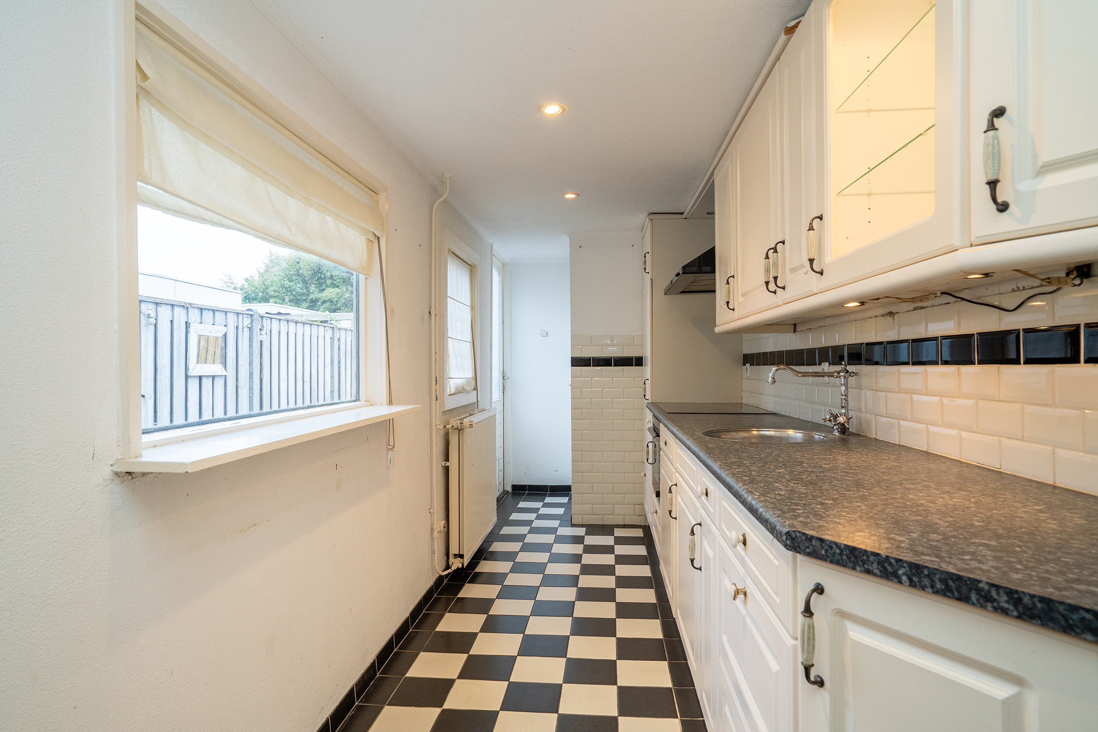 Aan de achterzijde van de woning bevindt zich de gesloten keuken, uitgevoerd in een lichte kleurstelling. Vanuit de keuken is er toegang tot het separate toilet én de achtertuin.