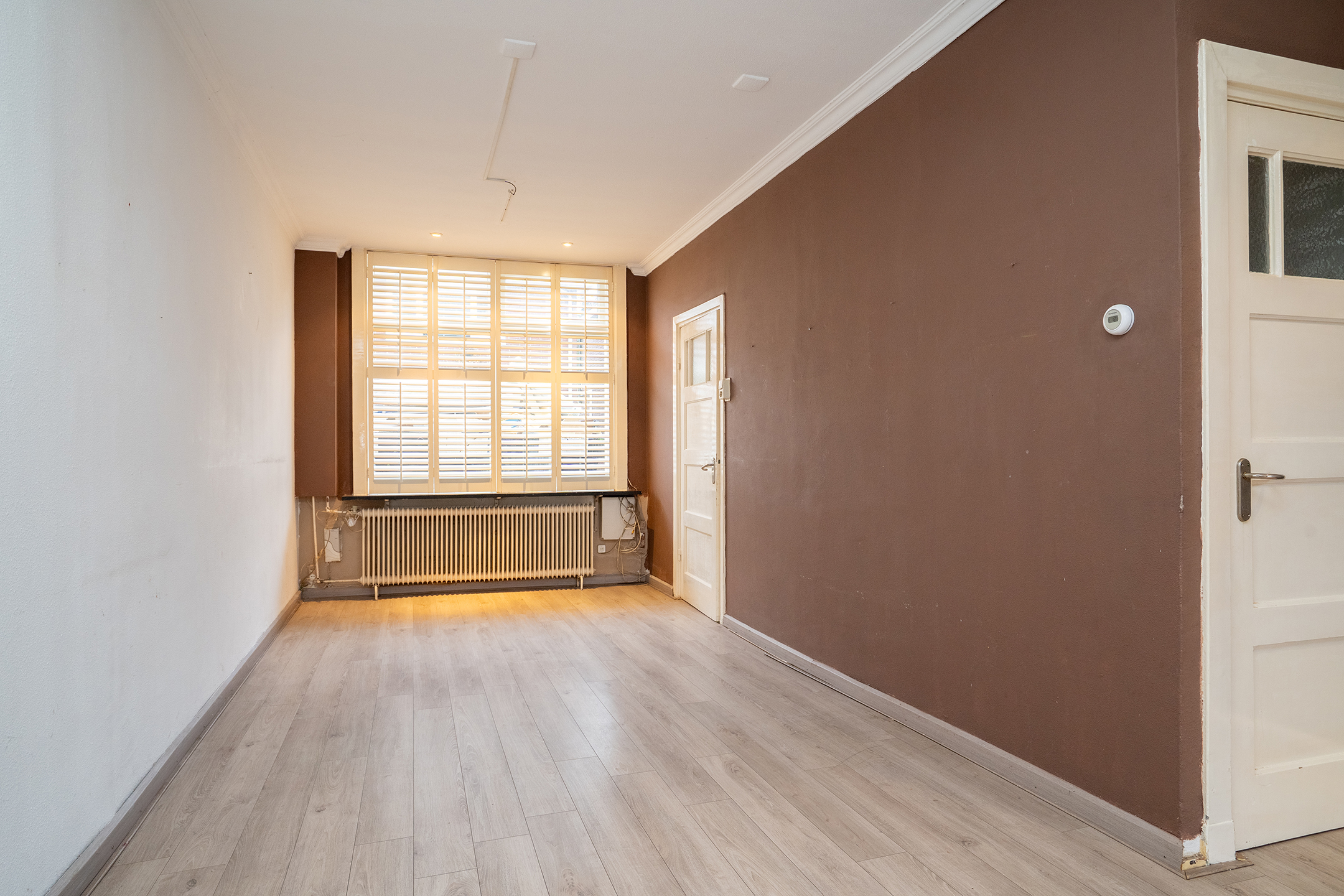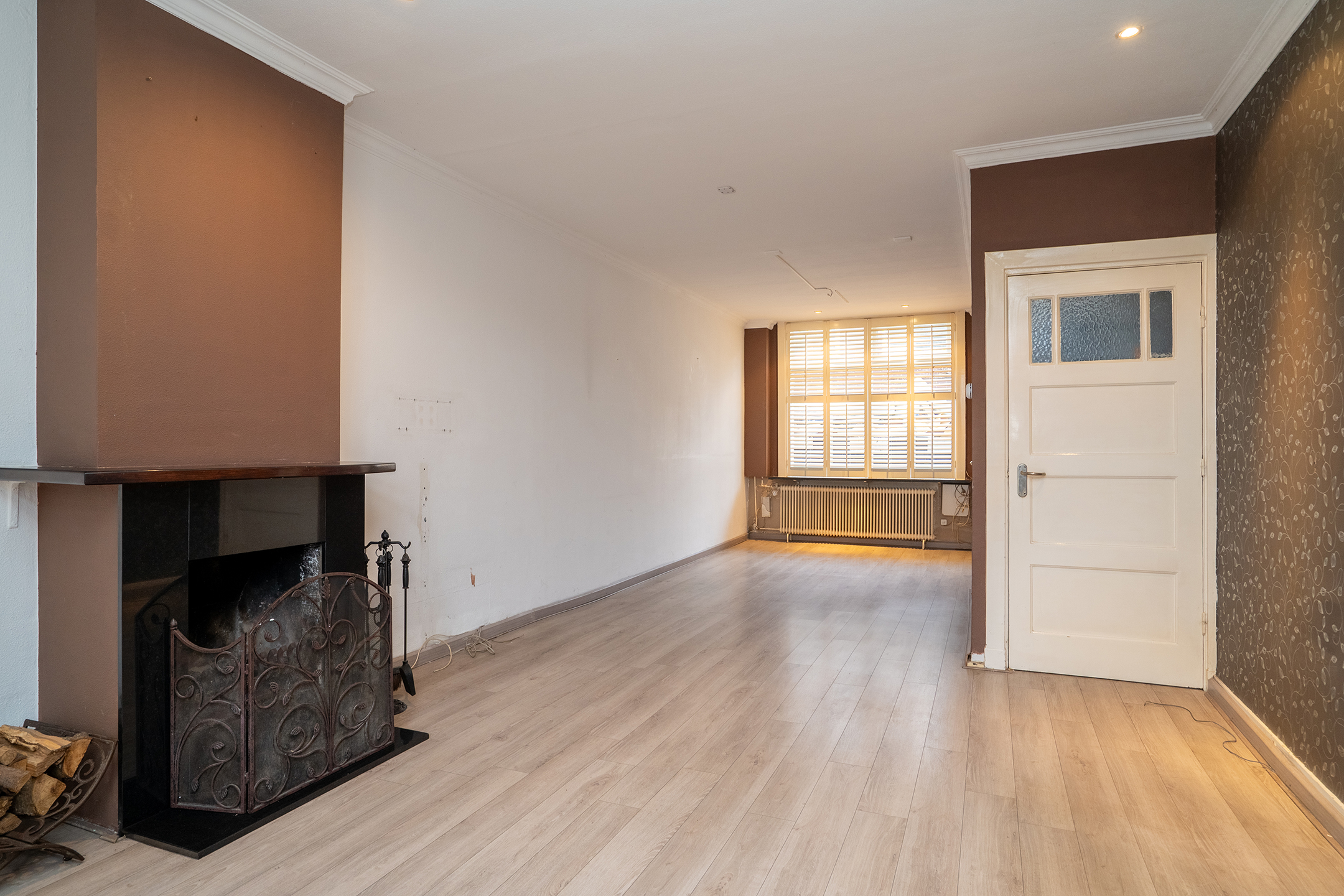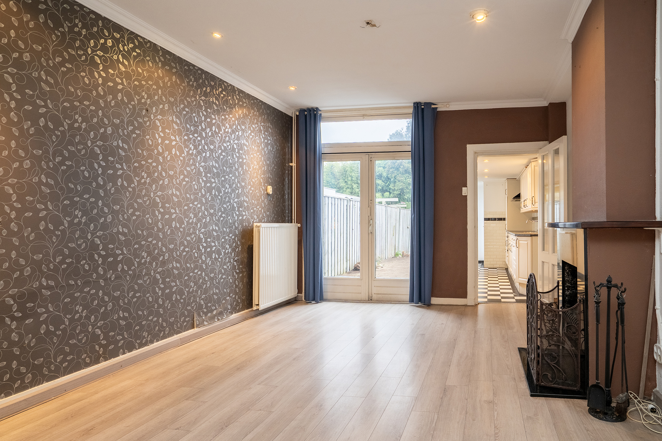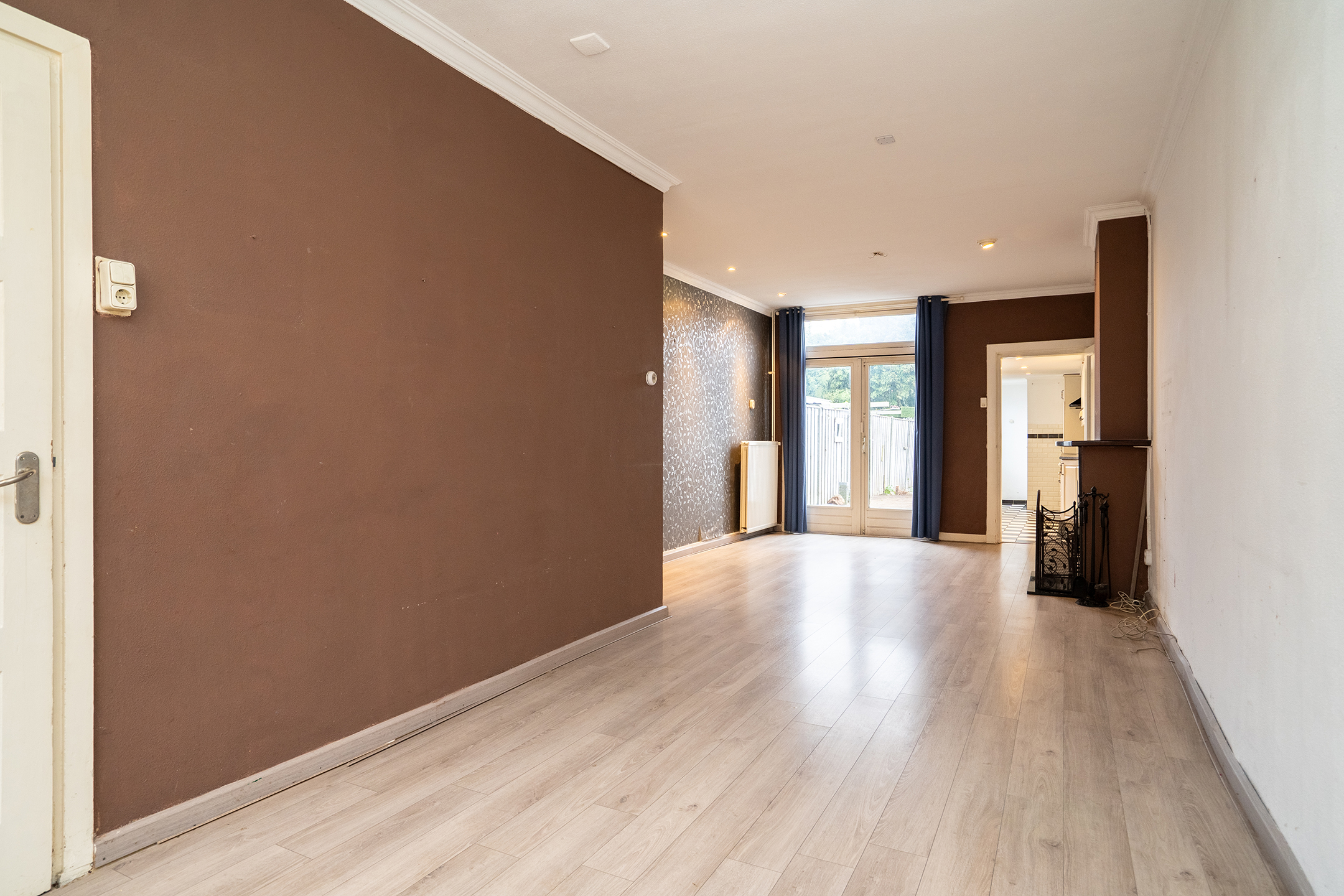 De doorzonwoonkamer beschikt over ramen aan zowel de voor- als achterzijde, wat zorgt voor een prettige lichtinval. Aan de achterzijde geven openslaande deuren toegang tot de tuin, waardoor binnen en buiten op een fijne manier met elkaar worden verbonden.