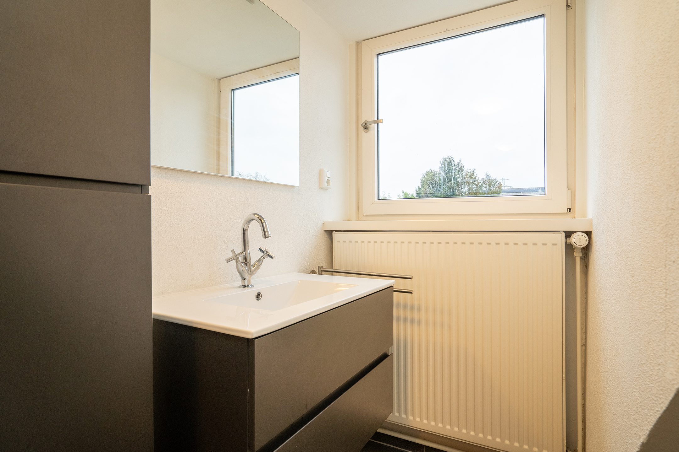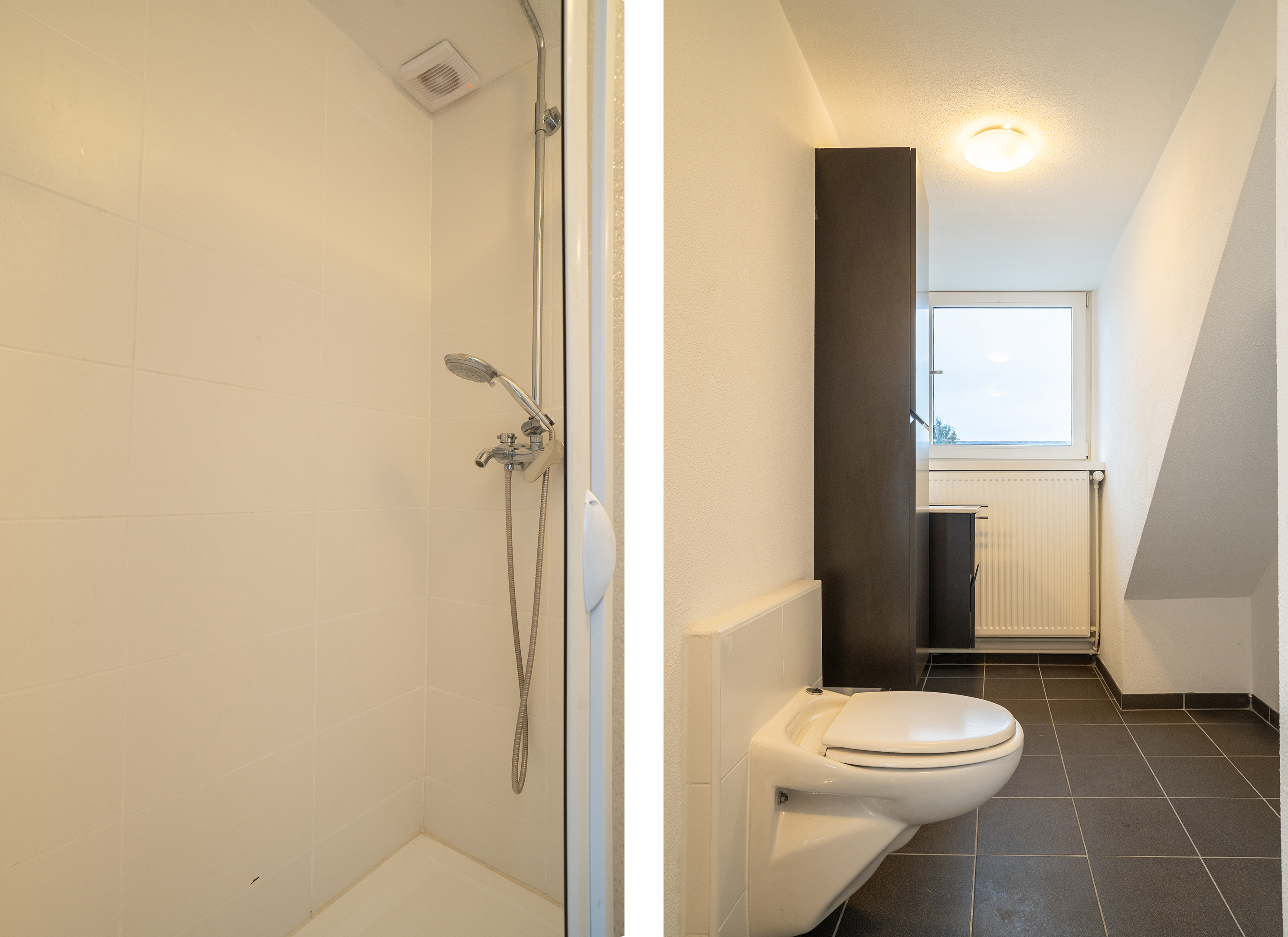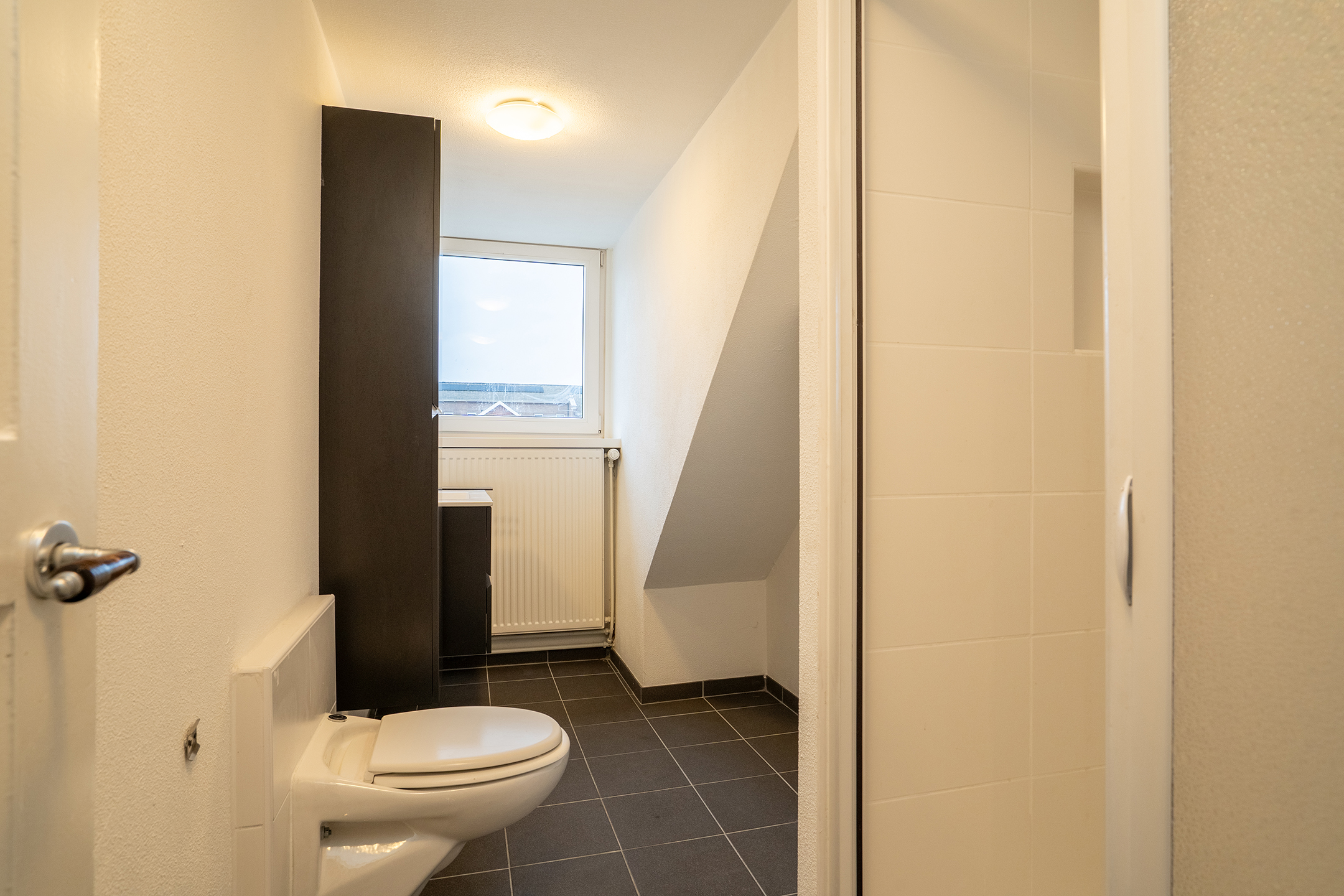 De badkamer is praktisch ingericht en voorzien van een douche, toilet, wastafelmeubel, radiator en een raam voor natuurlijke ventilatie en daglicht.