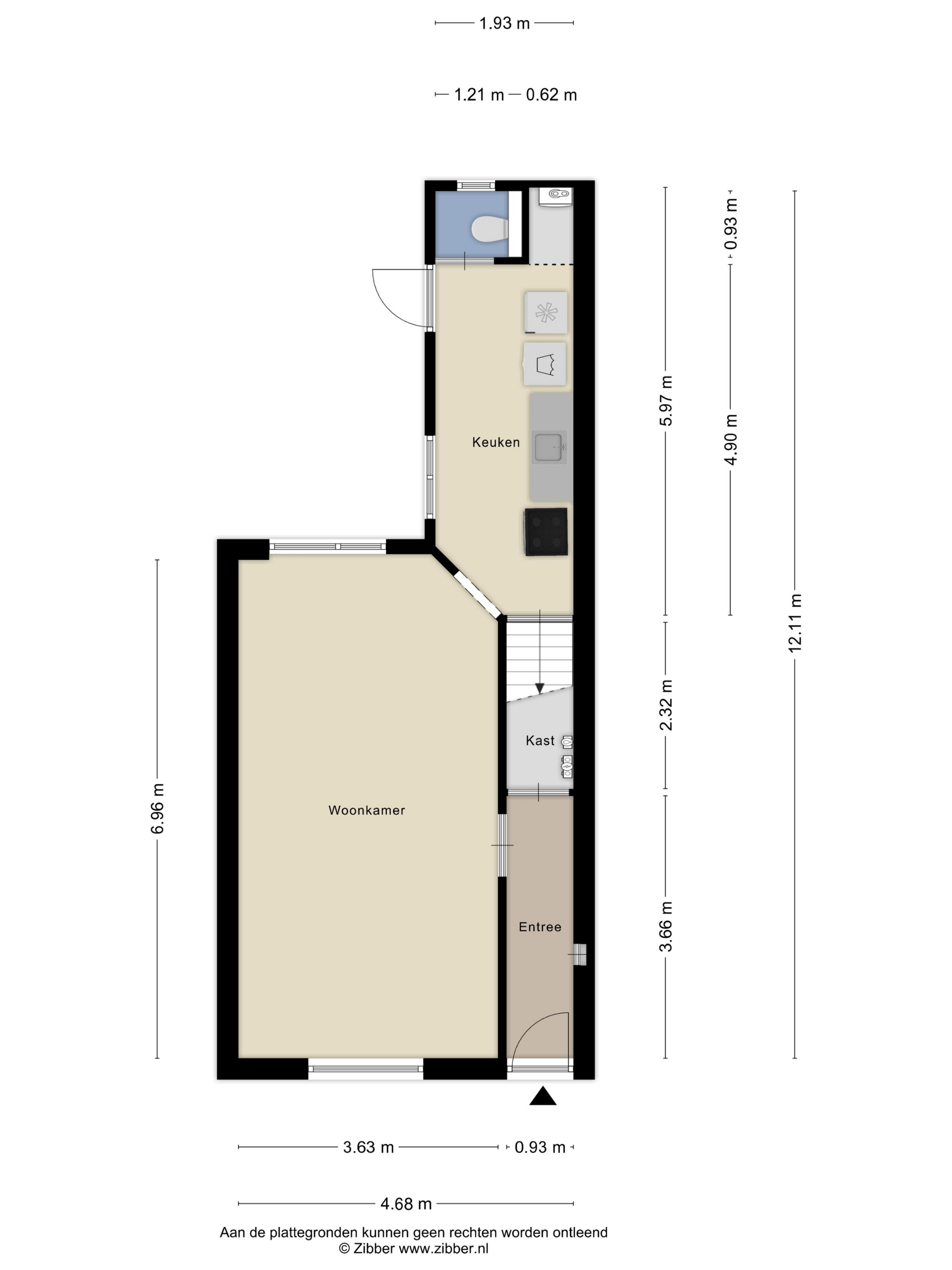 Via een deur in de keuken is een achterportaal bereikbaar, waar zich het toilet en de cv-ketel bevinden.