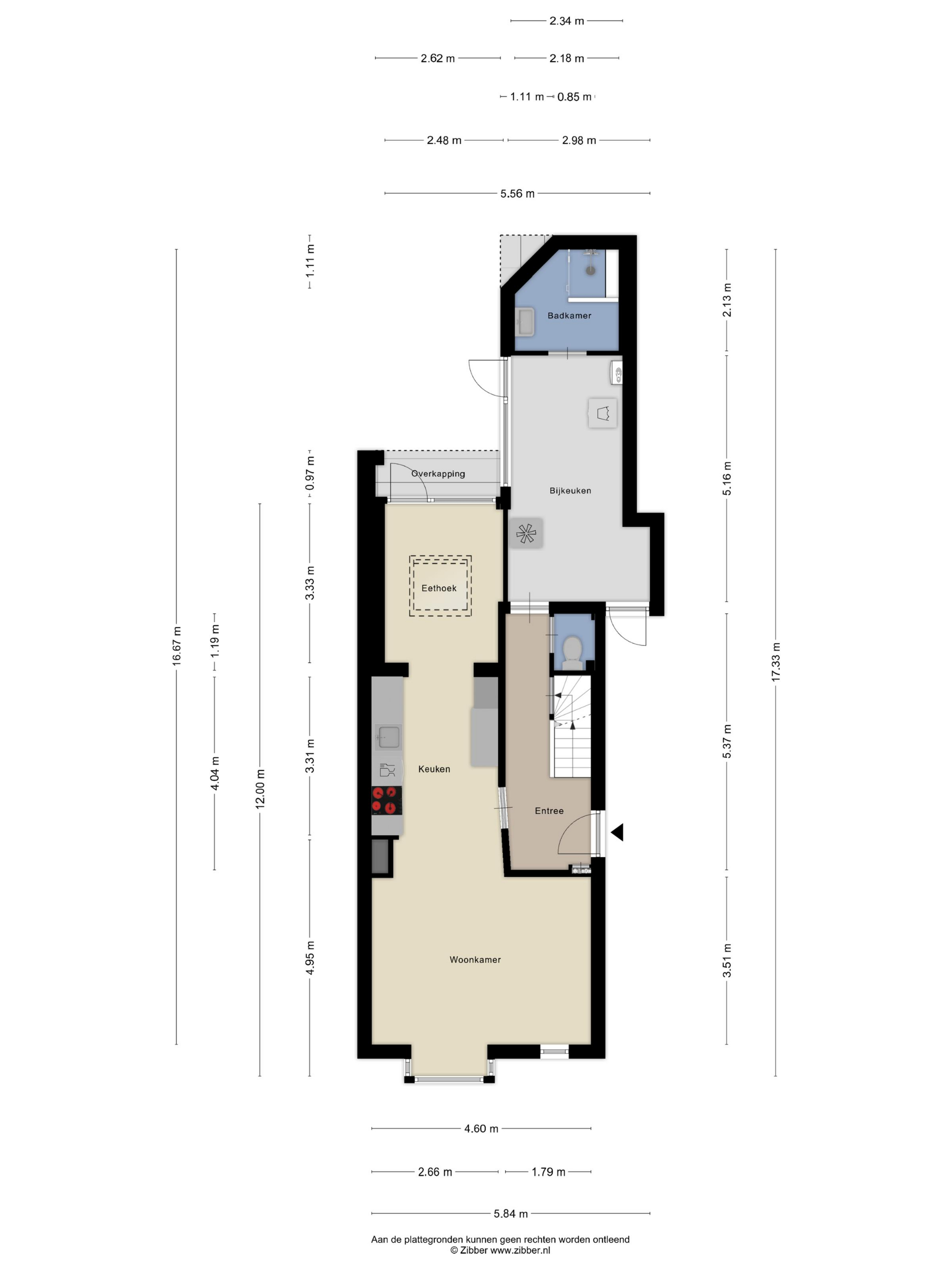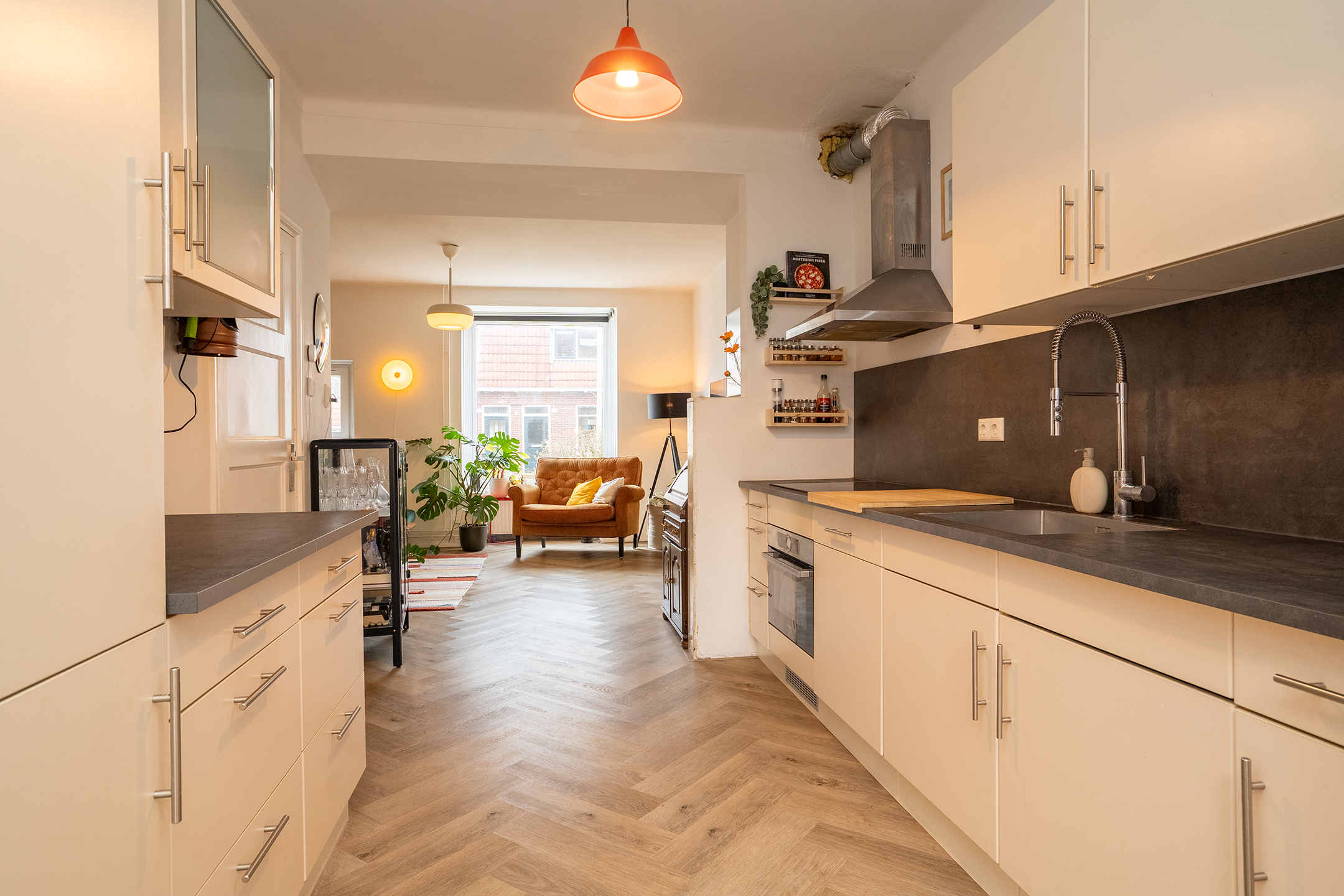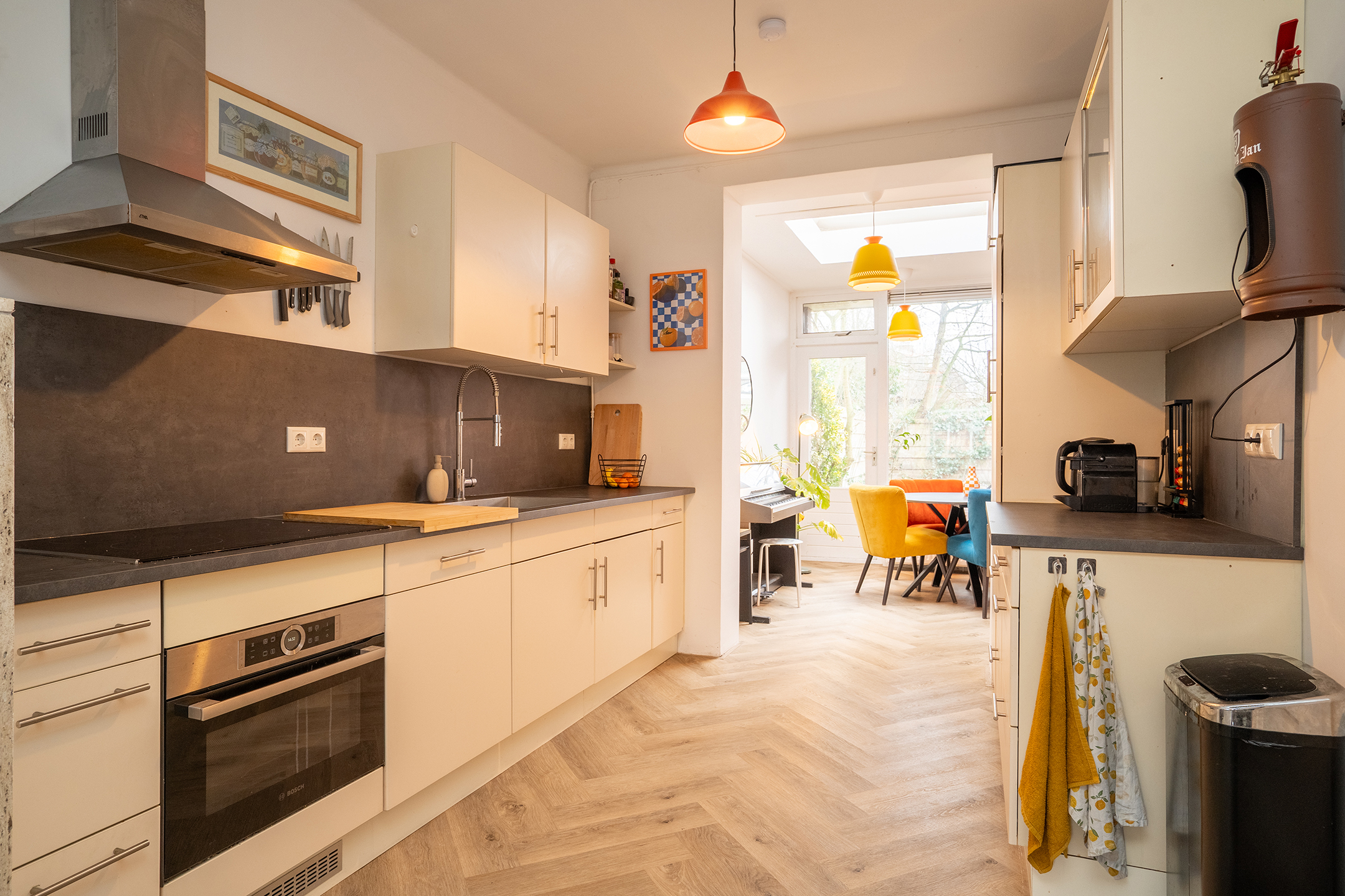Via de entree kom je in de sfeervolle woonkamer, waar het daglicht rijkelijk naar binnen valt en de warme afwerking direct een thuisgevoel geeft. De open indeling zorgt voor een prettige verbinding tussen zitten, eten en koken. De keuken is praktisch ingericht en grenst aan de eetkamer, die dankzij de lichtkoepel en toegang tot de tuin een heerlijke plek vormt voor lange diners en gezellige avonden. In de ruime bijkeuken bevindt zich de opstelplaats voor de wasmachine en de wasdroger en tevens de CV opstelling. De achtergelegen badkamer beschikt over een ruime douche en een wastafel.