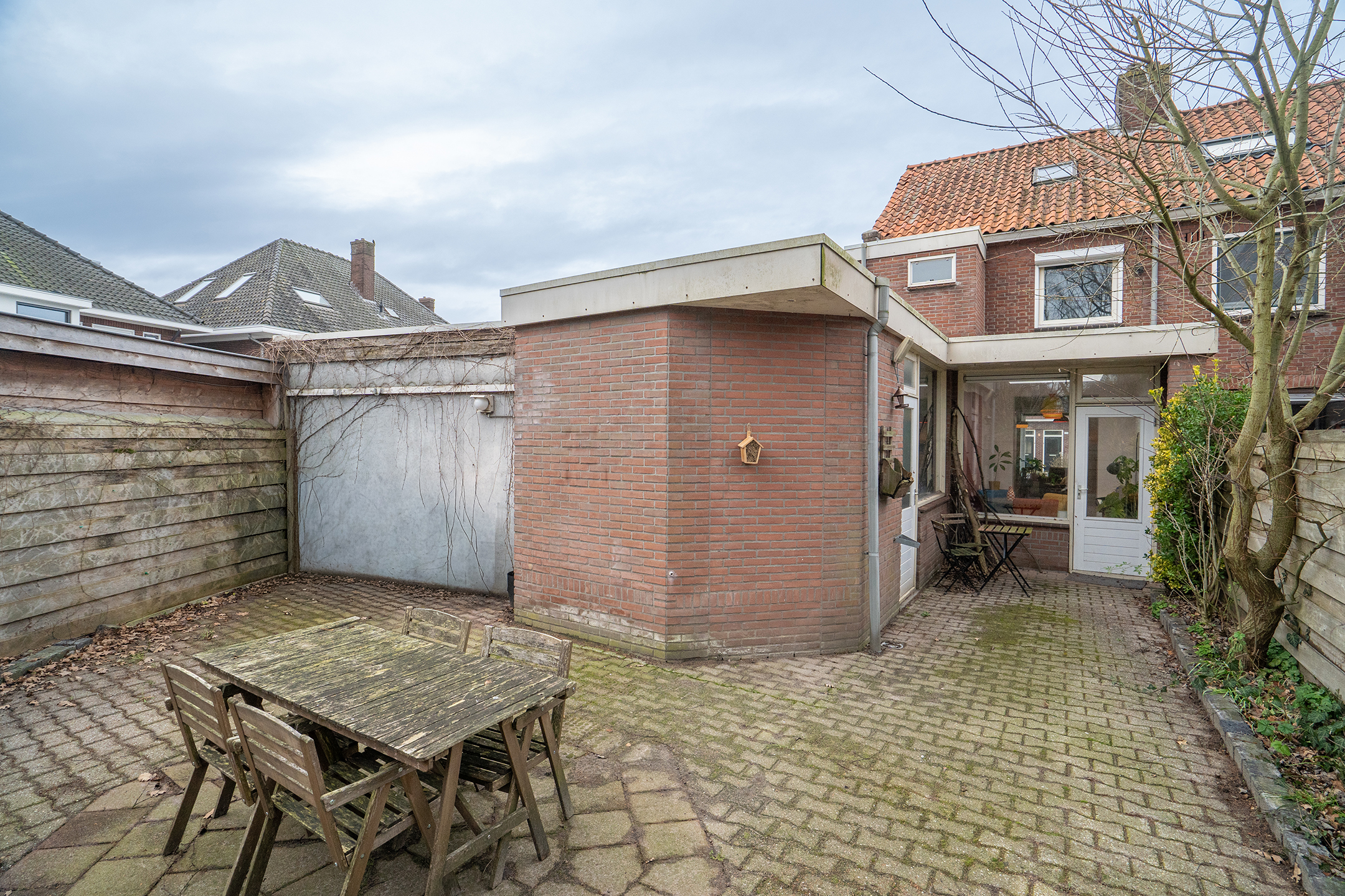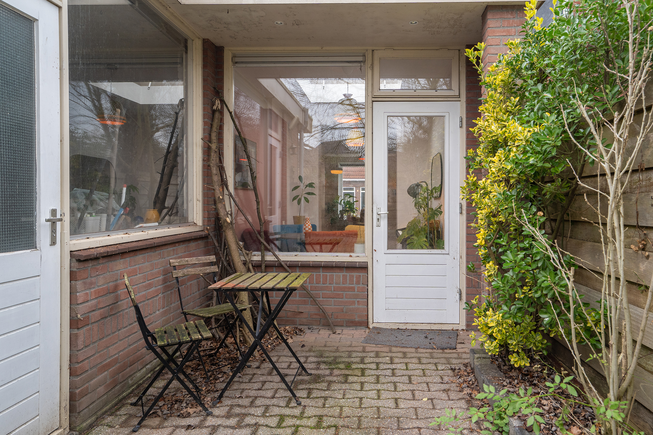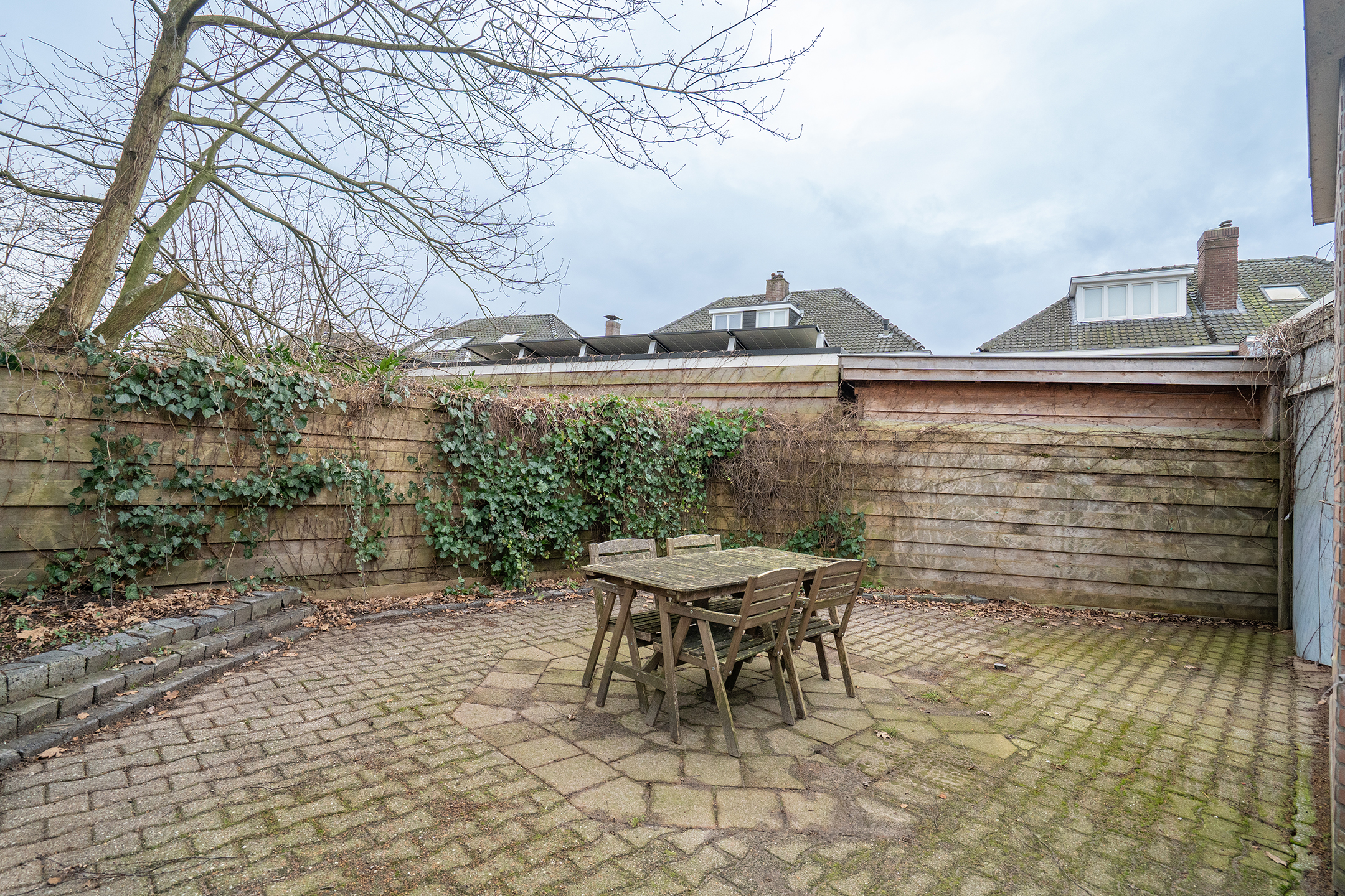 De achtertuin bereik van je vanuit de eetkamer of de bijkeuken: een beschutte buitenruimte met voldoende privacy, ideaal om in alle rust te ontspannen of samen buiten te eten.