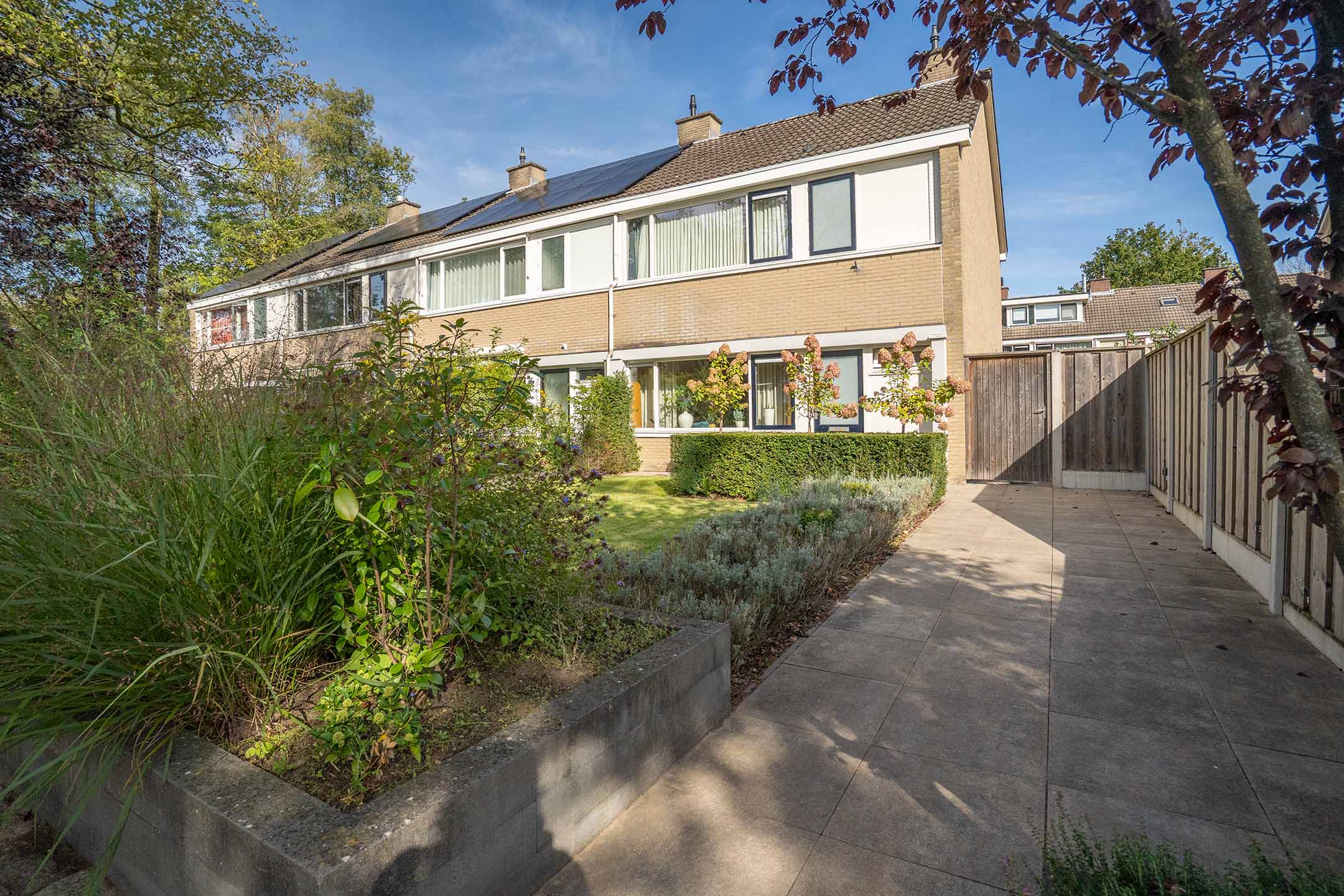 Tuinen: Bij deze woning is de voortuin en achtertuin evenveel van belang. Voor zit je beschut en op het zuiden en achter zit je open en met prachtig zicht over de vijver, waar je gedurende alle jaargetijden kan genieten.