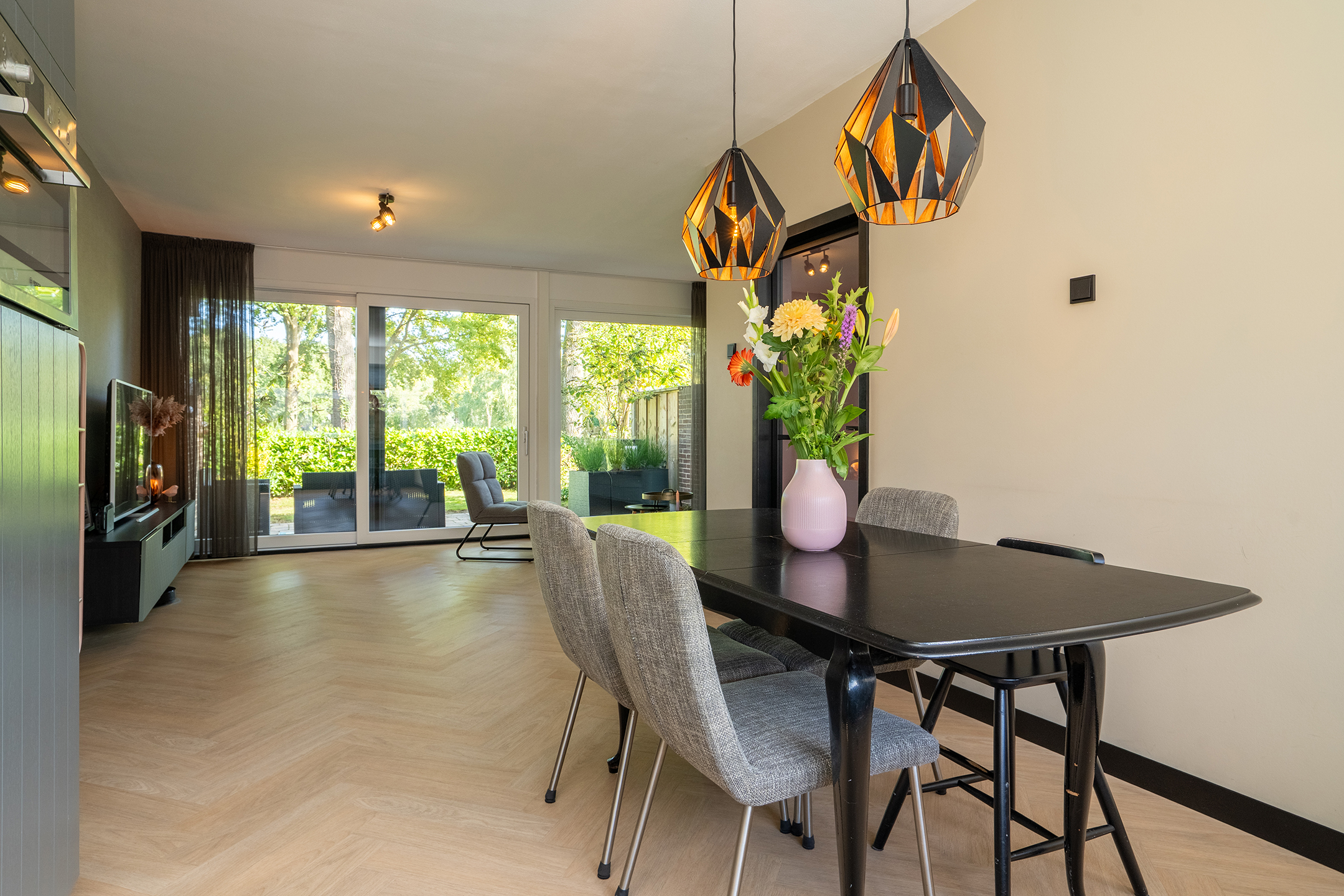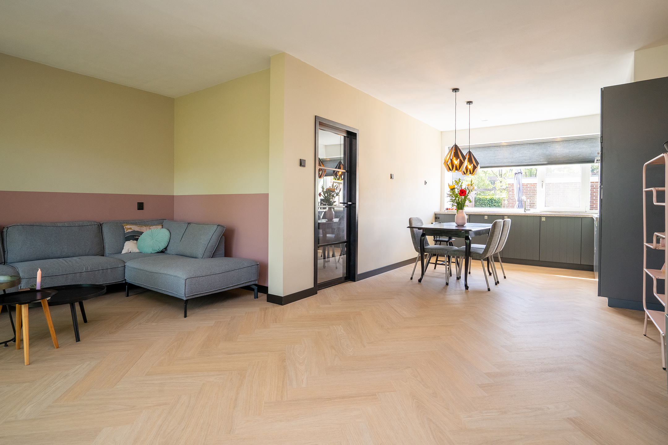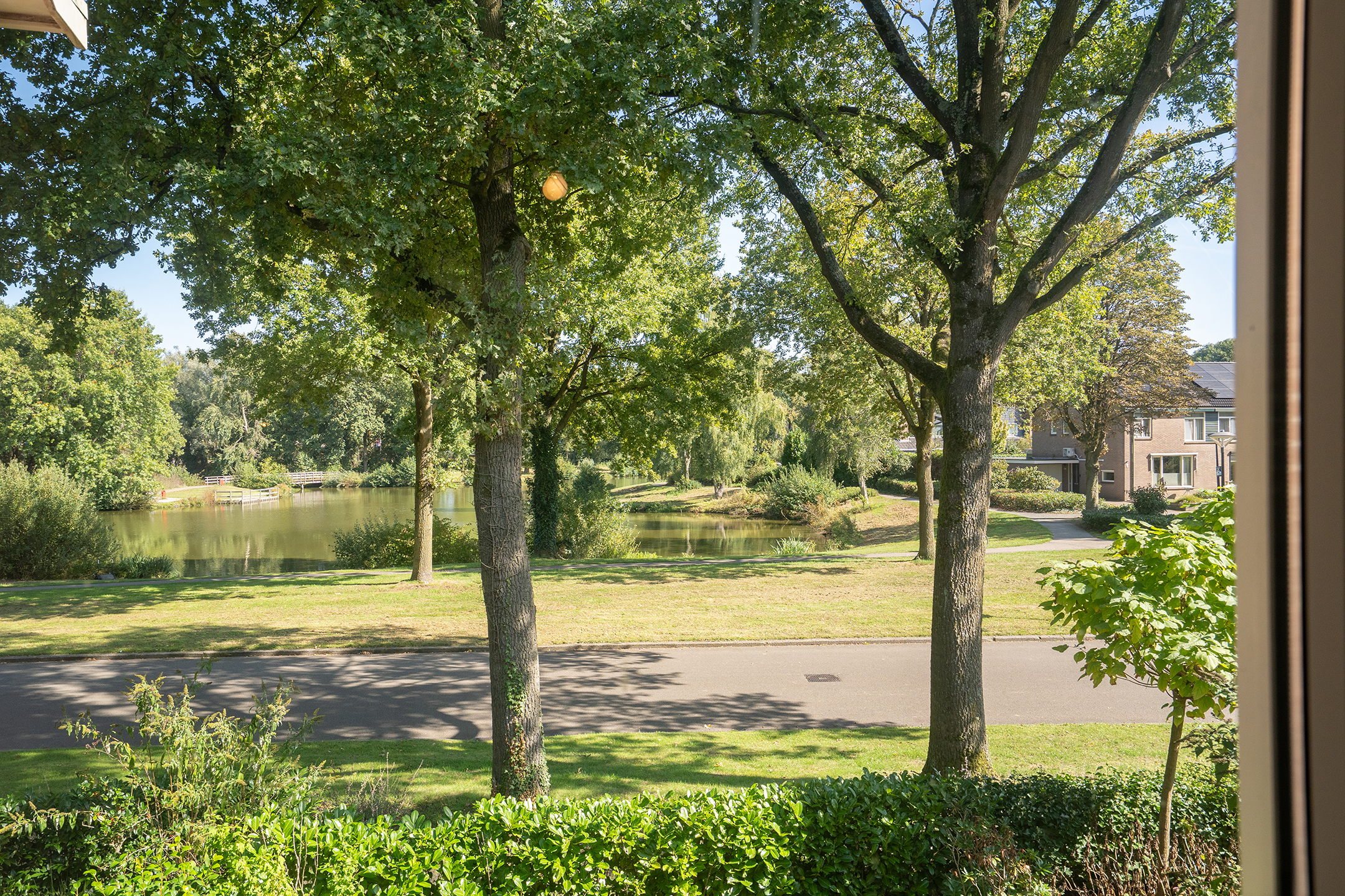 Via de afgesloten voortuin, kom je via de ingerichte voortuin de voordeur binnen, hal met toilet, bergkast en trapopgang, ruime hoekkeuken v.v. diverse inbouwapparatuur en plek voor een eettafel. De woonkamer, v.v. visgraat pvc vloer en vloerverwarming is gelegen op de achterzijde en heeft een prachtig uitzicht over de vijver.