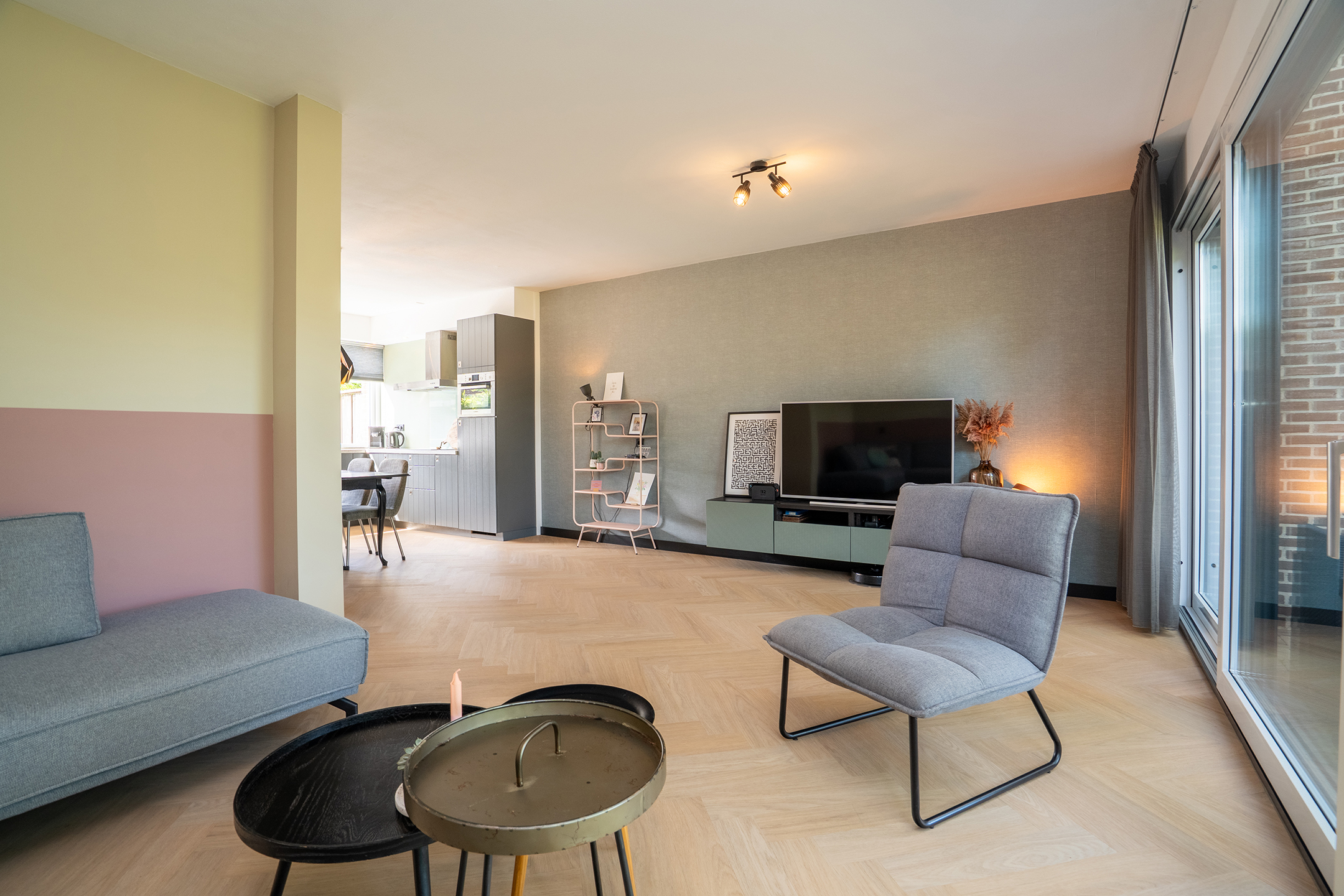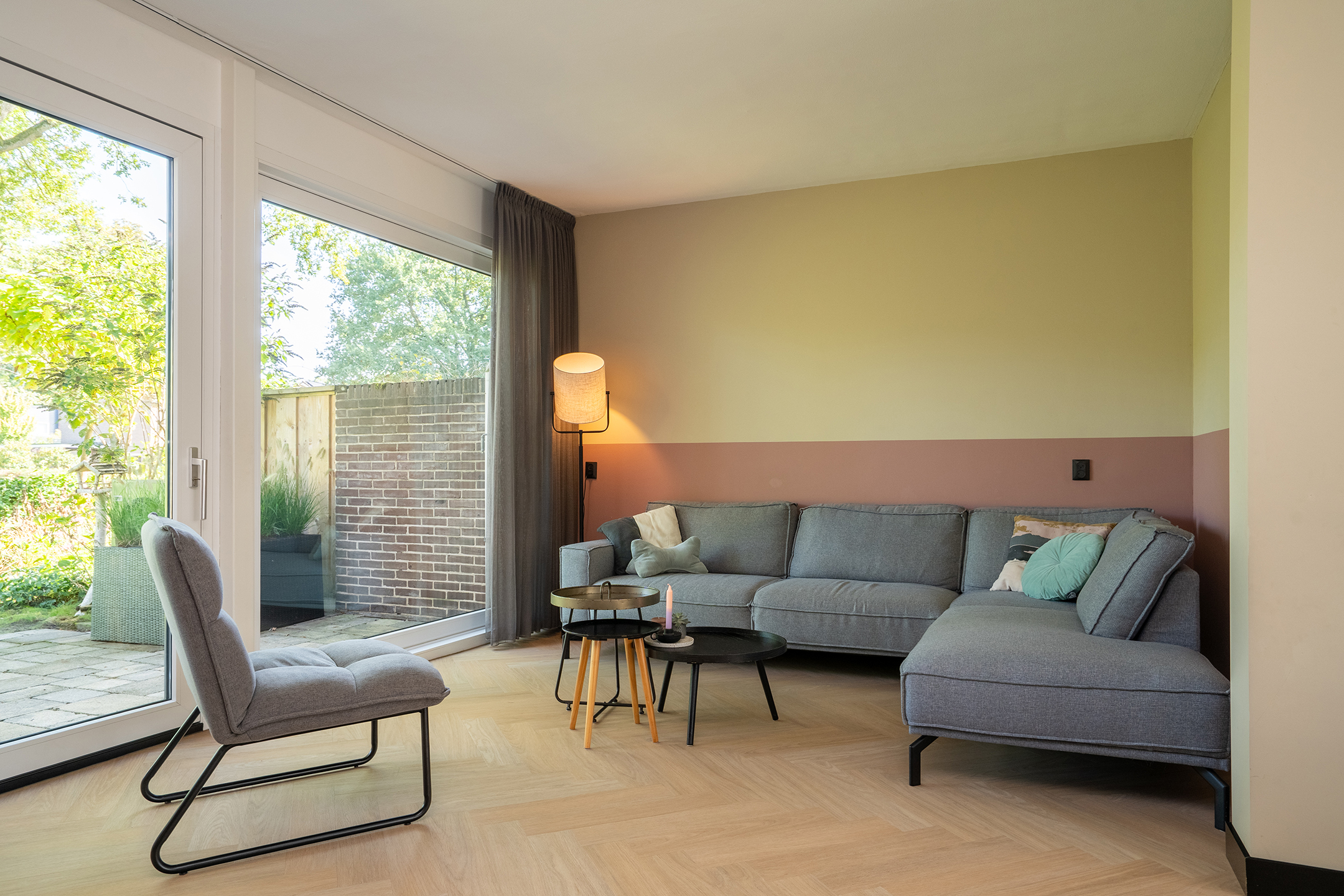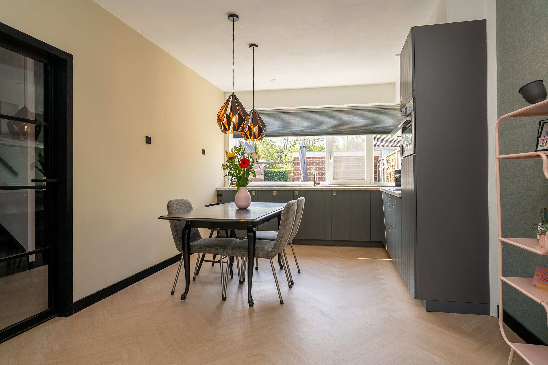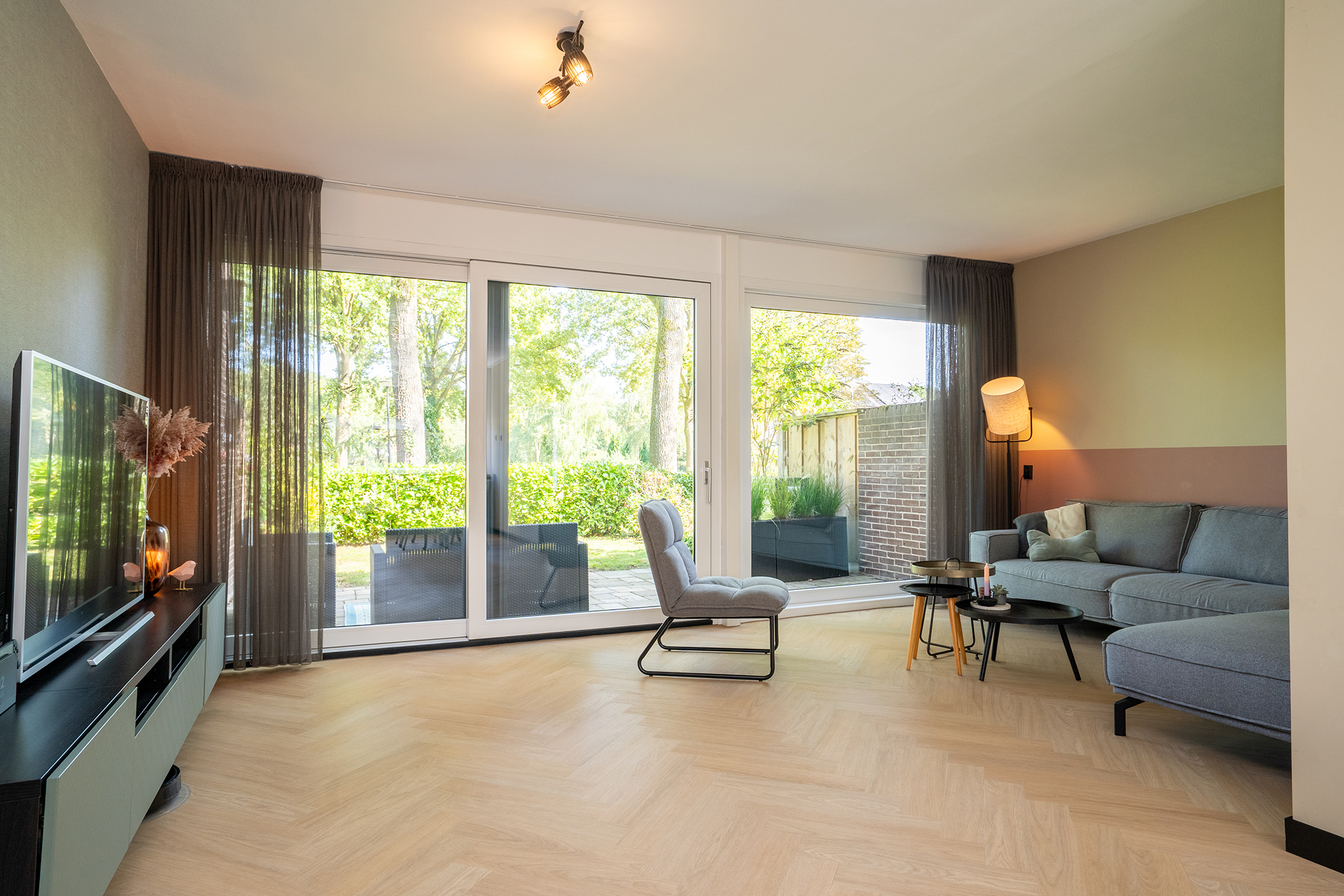 Via de afgesloten voortuin, kom je via de ingerichte voortuin de voordeur binnen, hal met toilet, bergkast en trapopgang, ruime hoekkeuken v.v. diverse inbouwapparatuur en plek voor een eettafel. De woonkamer, v.v. visgraat pvc vloer en vloerverwarming is gelegen op de achterzijde en heeft een prachtig uitzicht over de vijver.