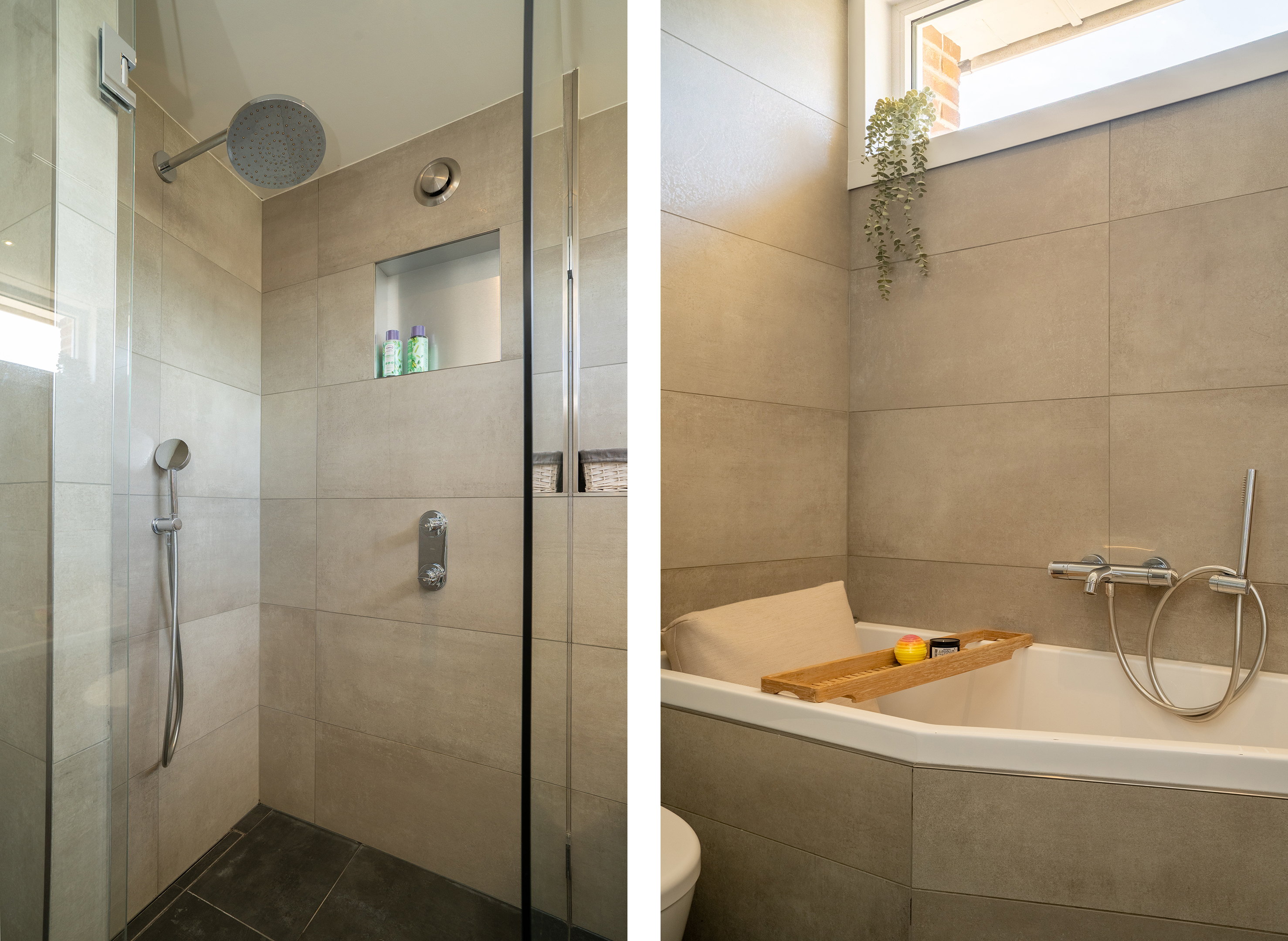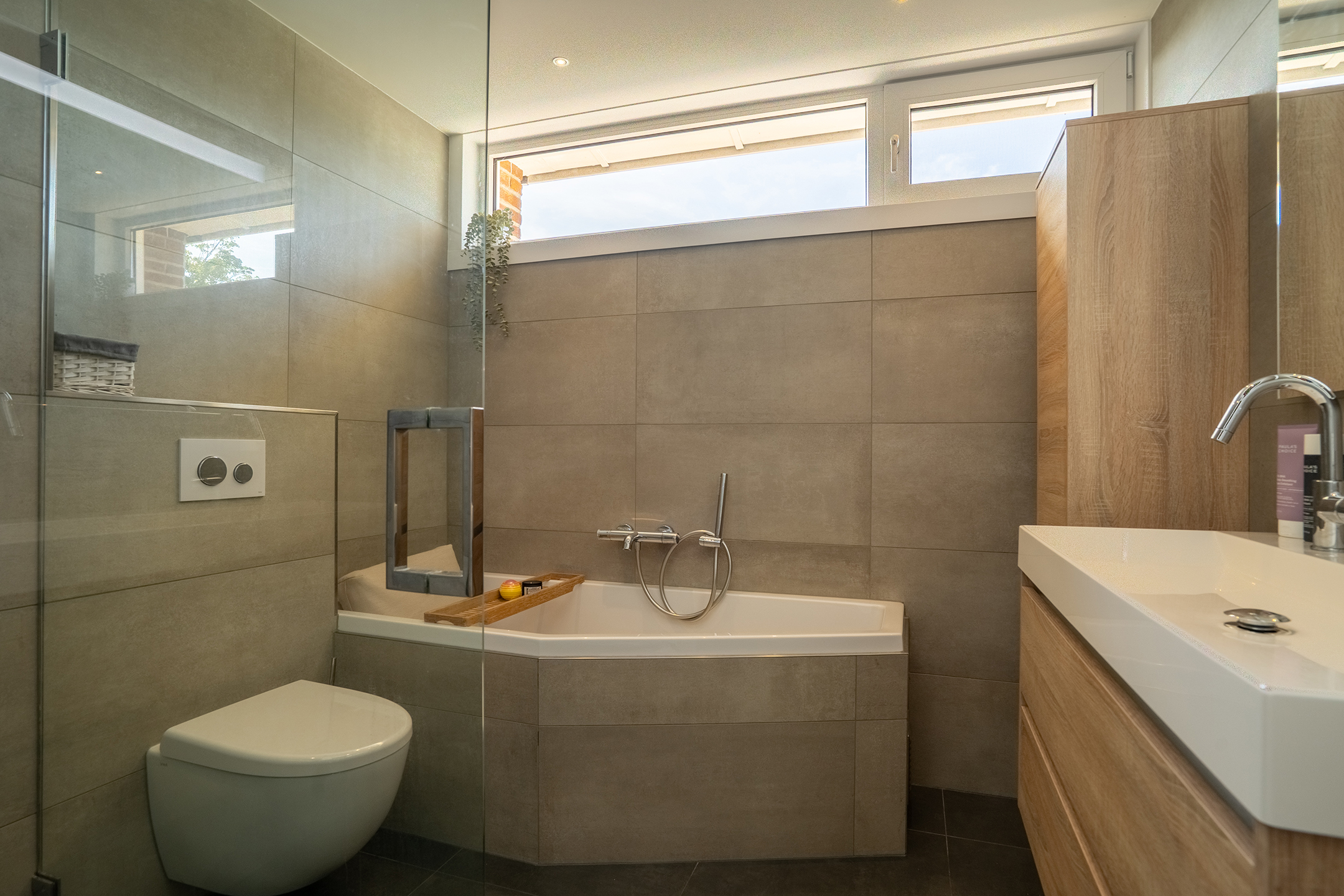 1e Verdieping: Overloop, drie slaapkamers en vergrote luxe badkamer, waardoor een ligbad (whirlpool) en een aparte douche gerealiseerd zijn, naast een tweede toilet en grote wastafel.
