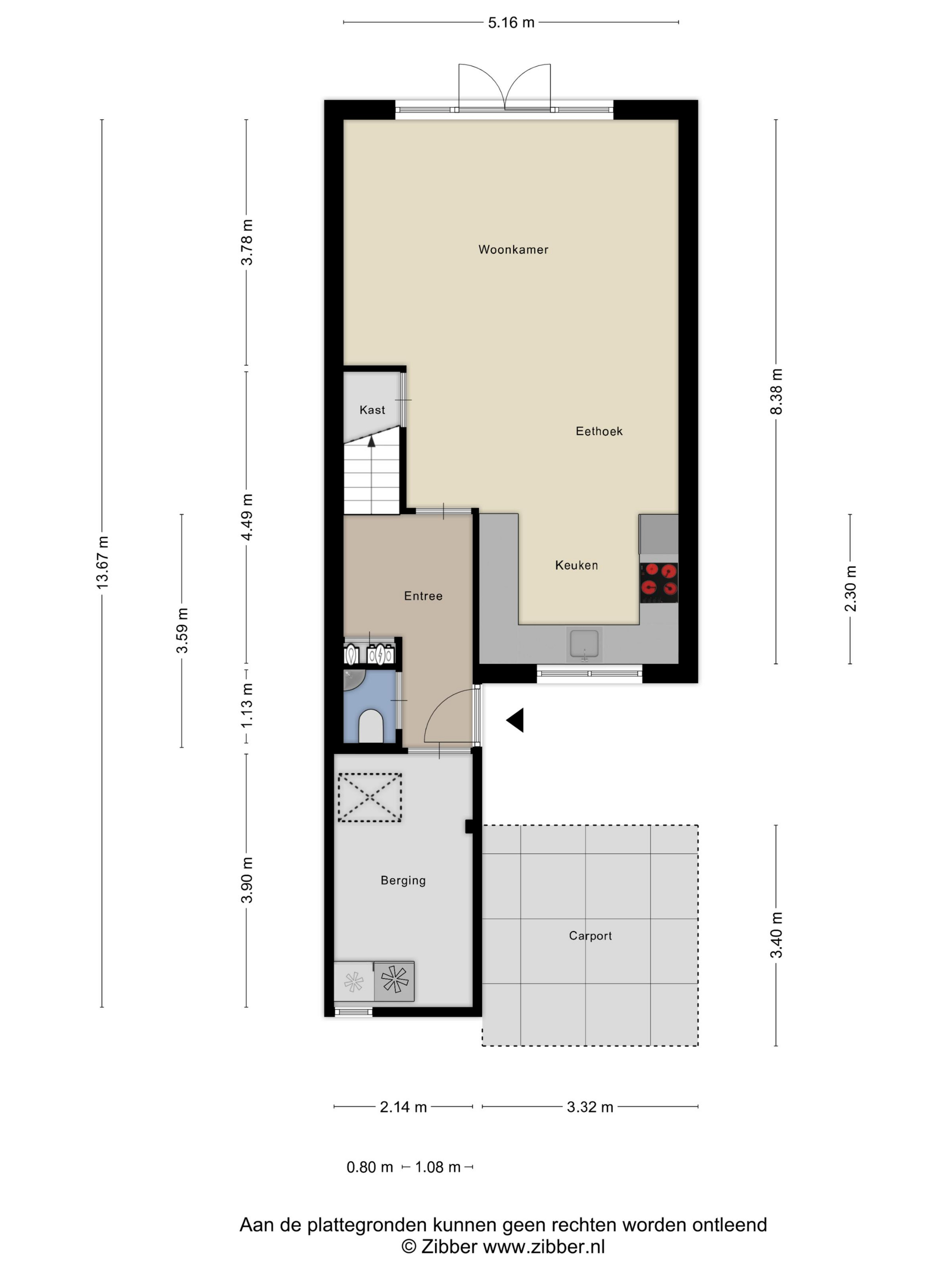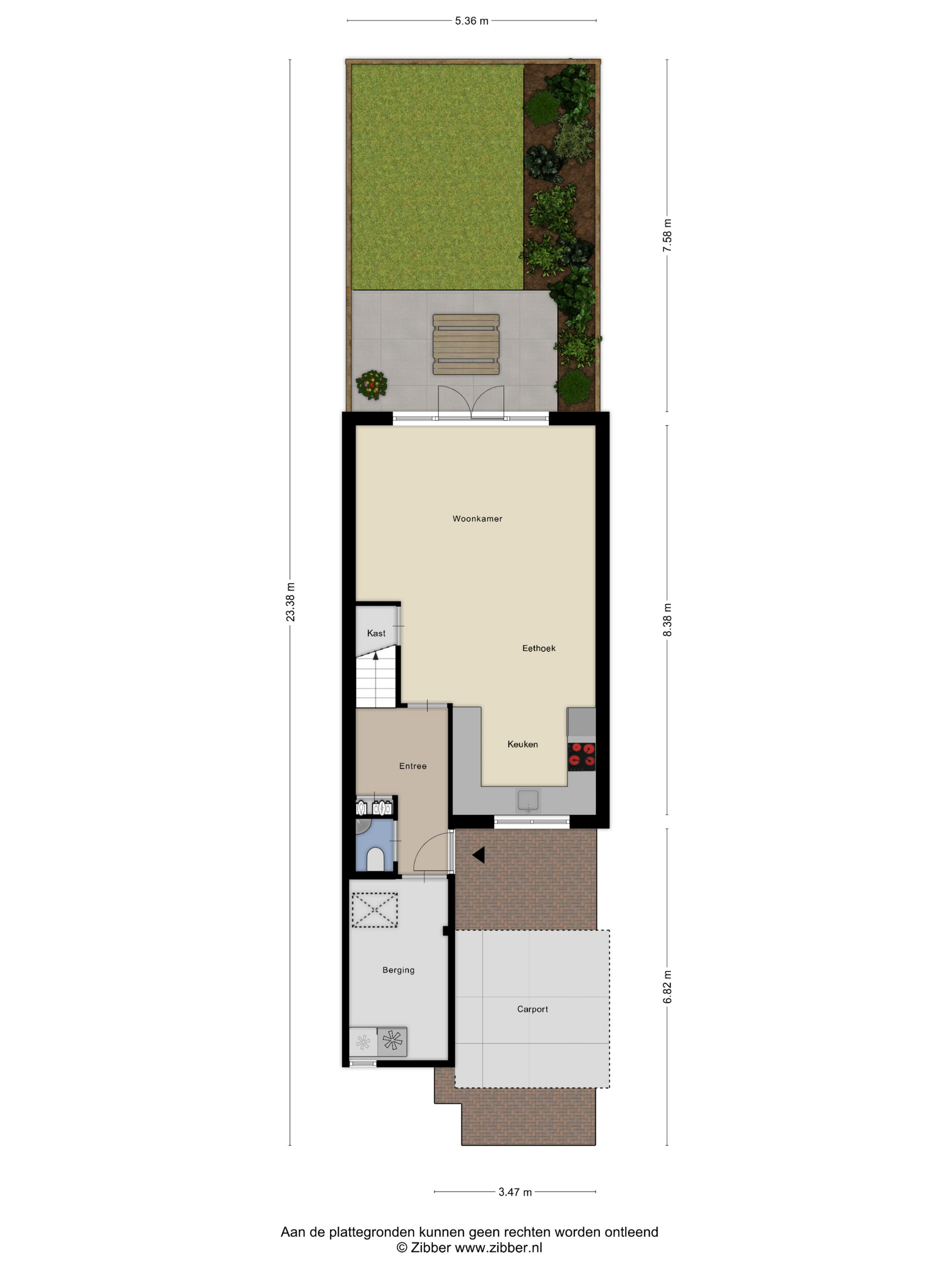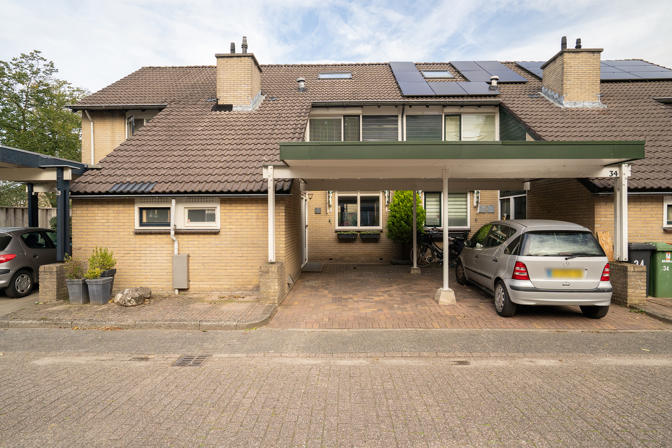 Begane grond: Via de eigen oprit met carport naar de zij-entree, hal met trapopgang, binnen doorgang naar de berging, toegang tot het toilet en de woonkamer. De tuingerichte woonkamer heeft dubbele tuindeuren en is luxe ingericht, net als de aansluitende keuken, welke is v.v. diverse inbouwapparatuur.