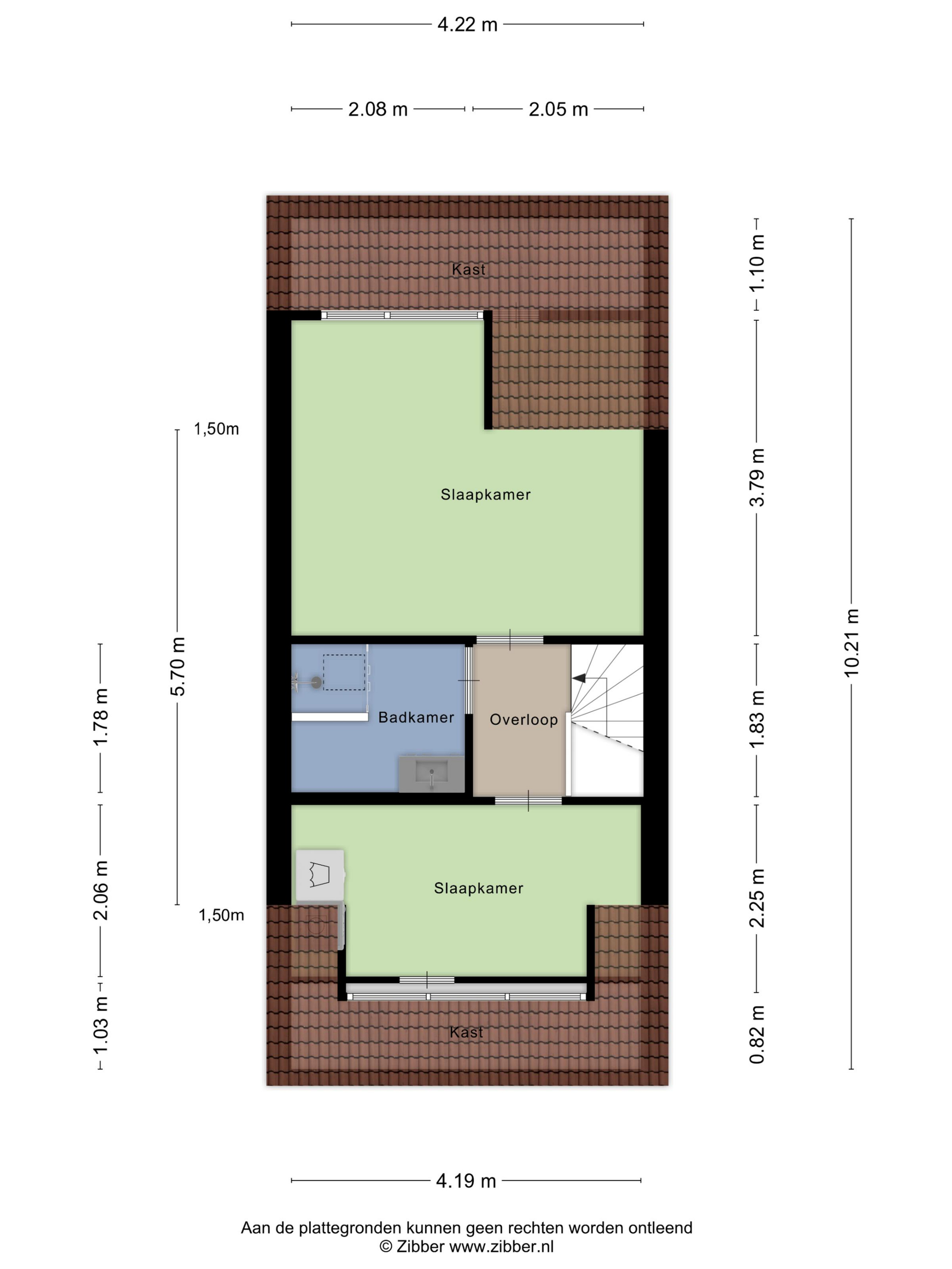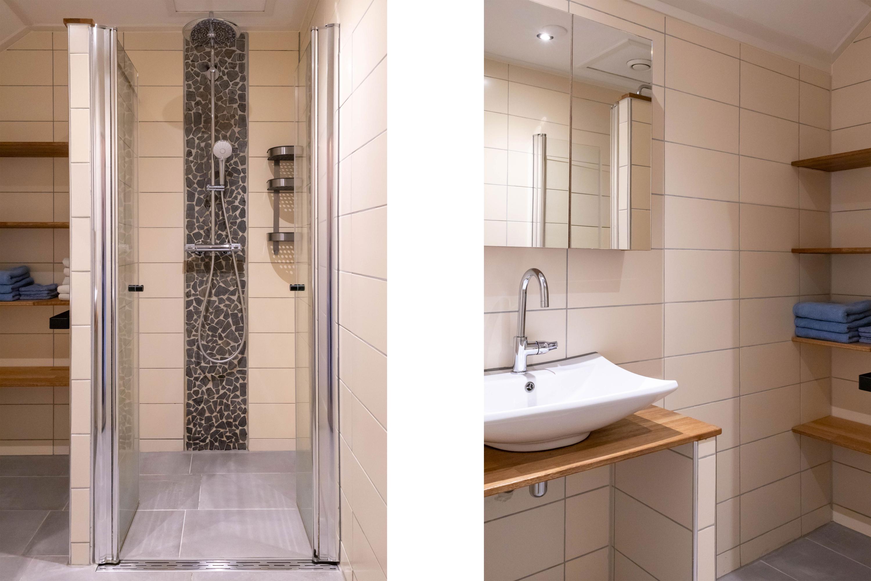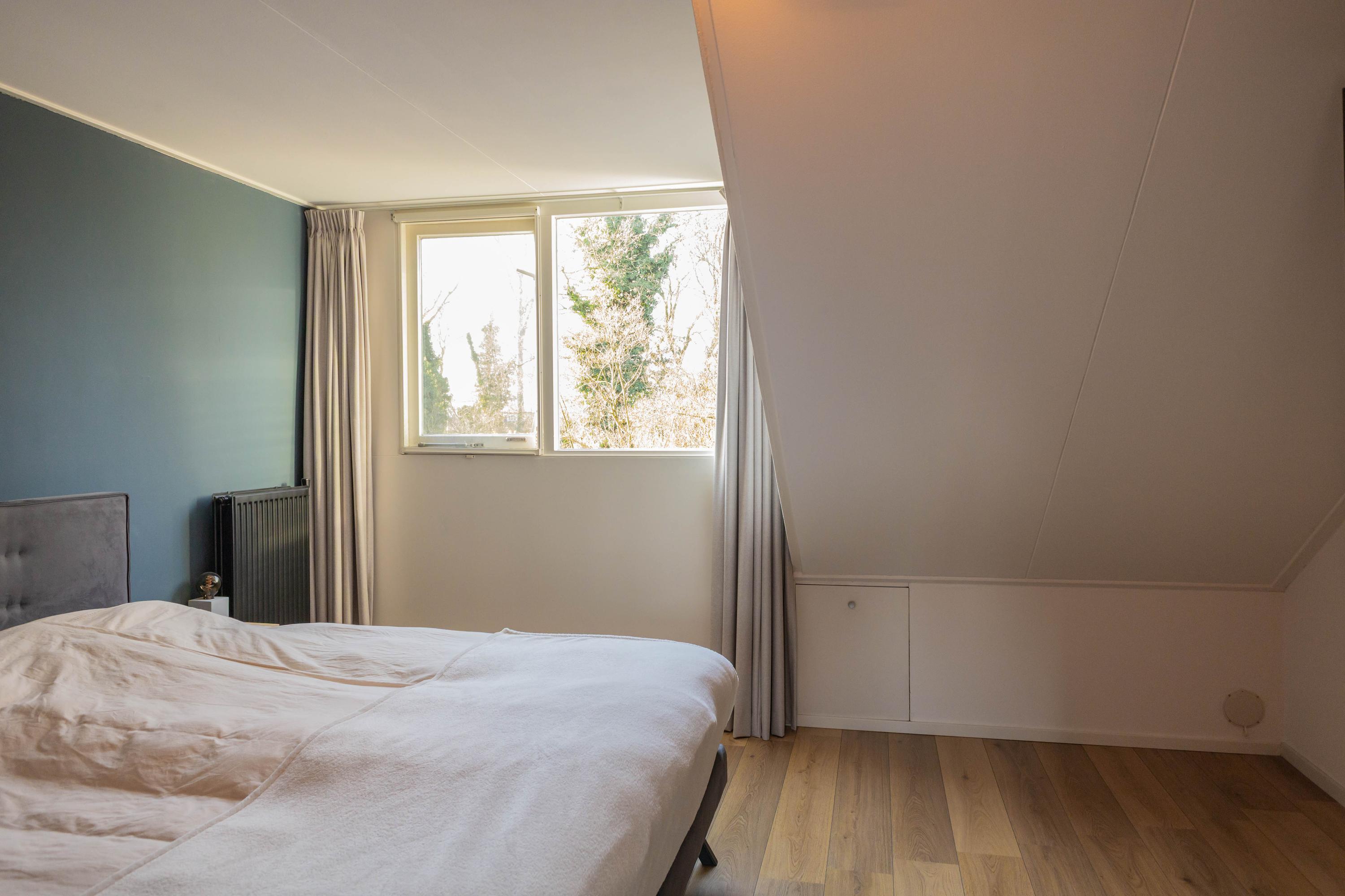 1e Verdieping: Overloop, badkamer v.v. een douche en een wastafelmeubel, een grote slaapkamer en een kleinere, welke tevens in gebruik is als waskamer en stookruimte.