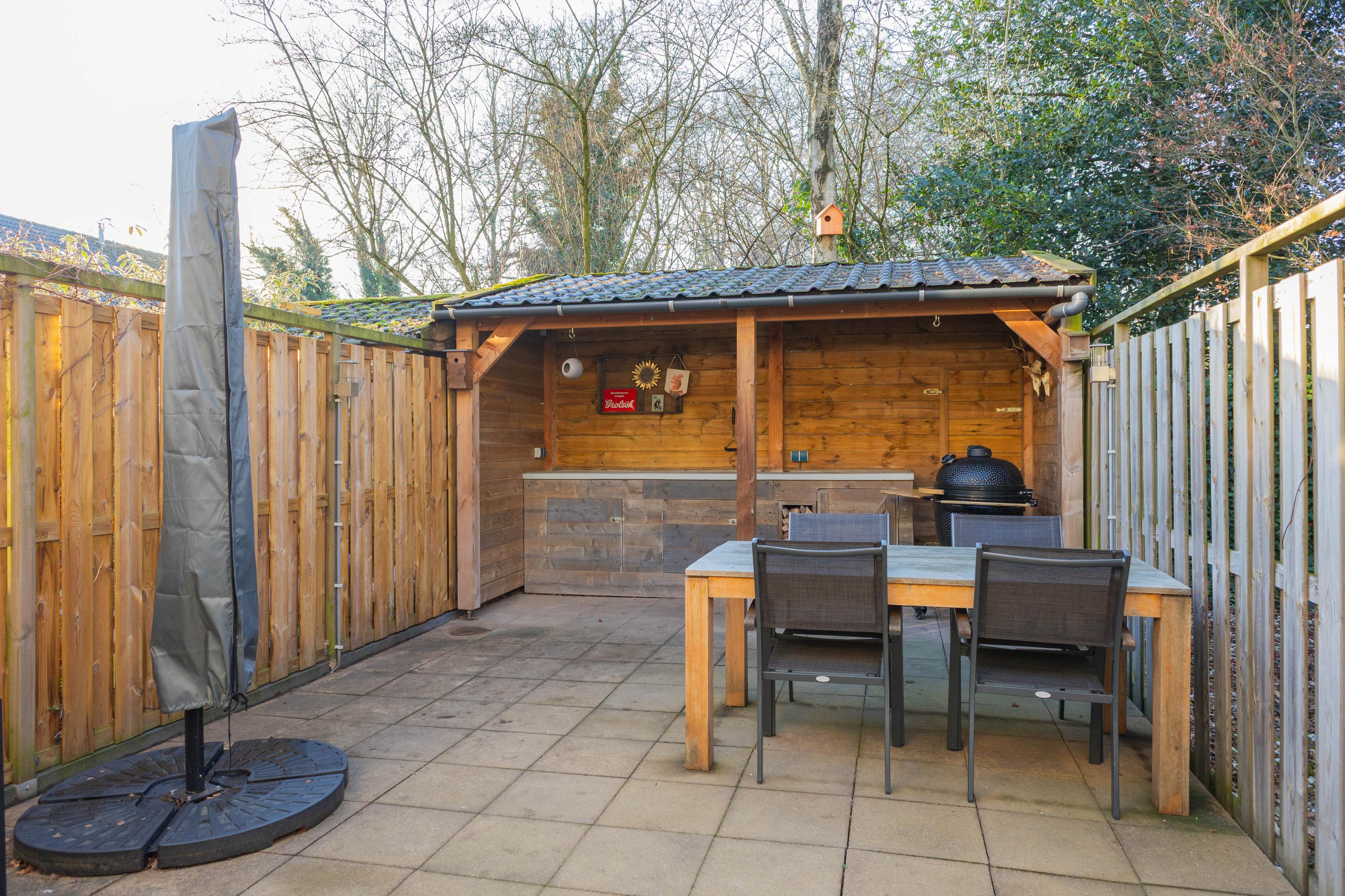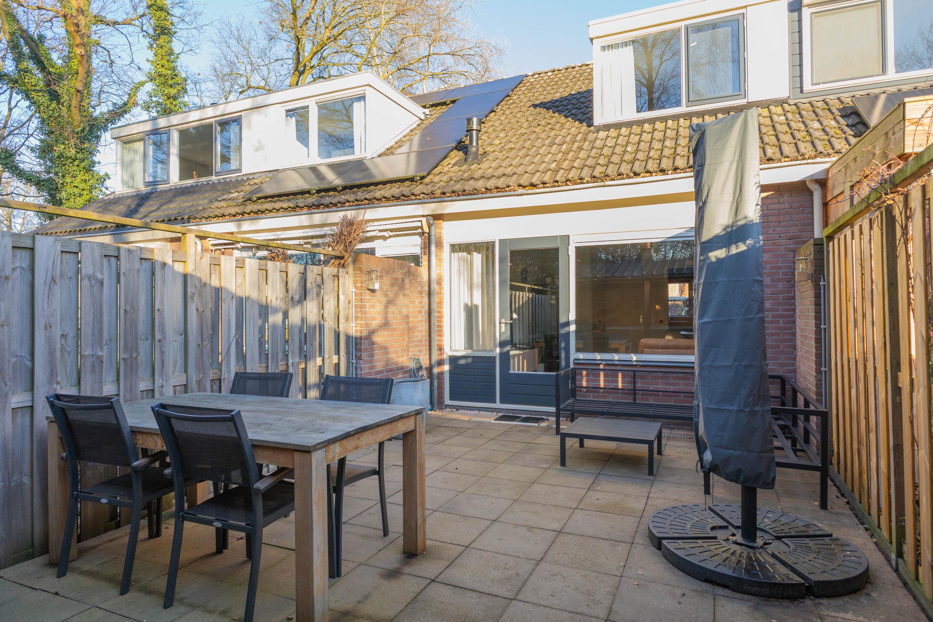 Tuin: Deze is op het zuidwesten gelegen, waarbij zonnepanelen een prima rendement kunnen opleveren. Het is onderhoudsarm en v.v. een kleine overkapping. Later is daarachter grond aangekocht, waardoor de overkapping vergroot kan worden.