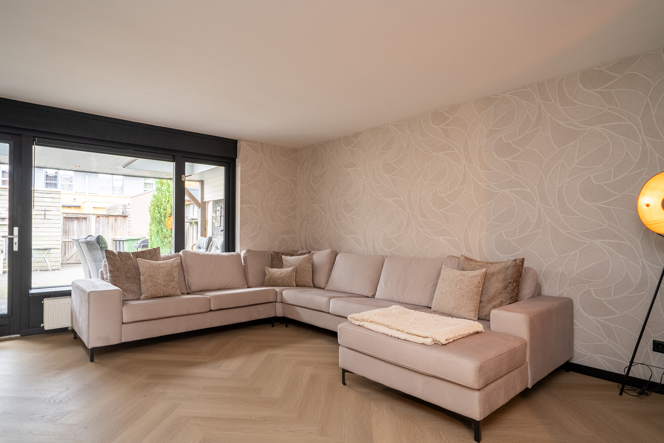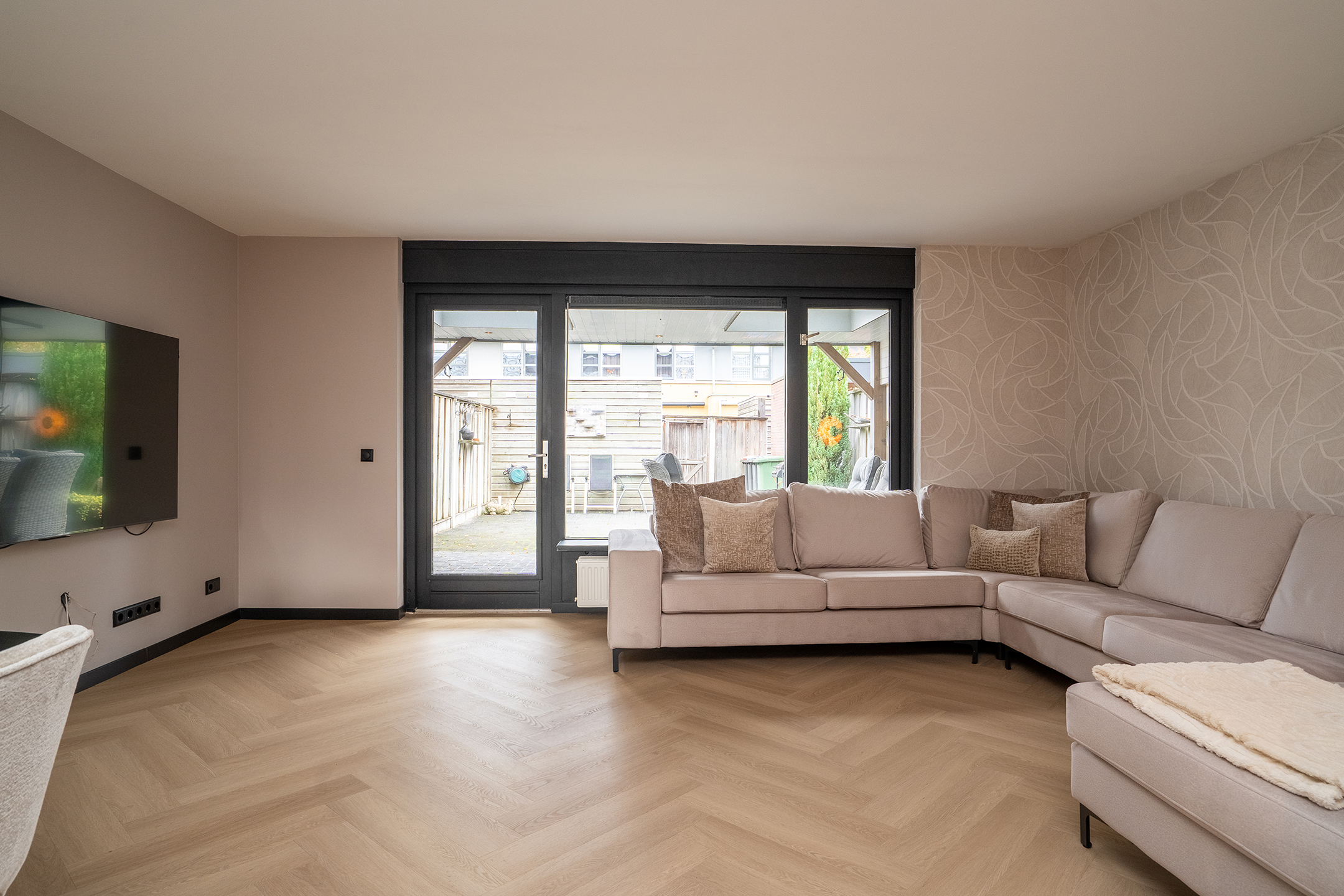 De ruime woonkamer is licht en eigentijds, met grote raampartijen en een deur naar de tuin.