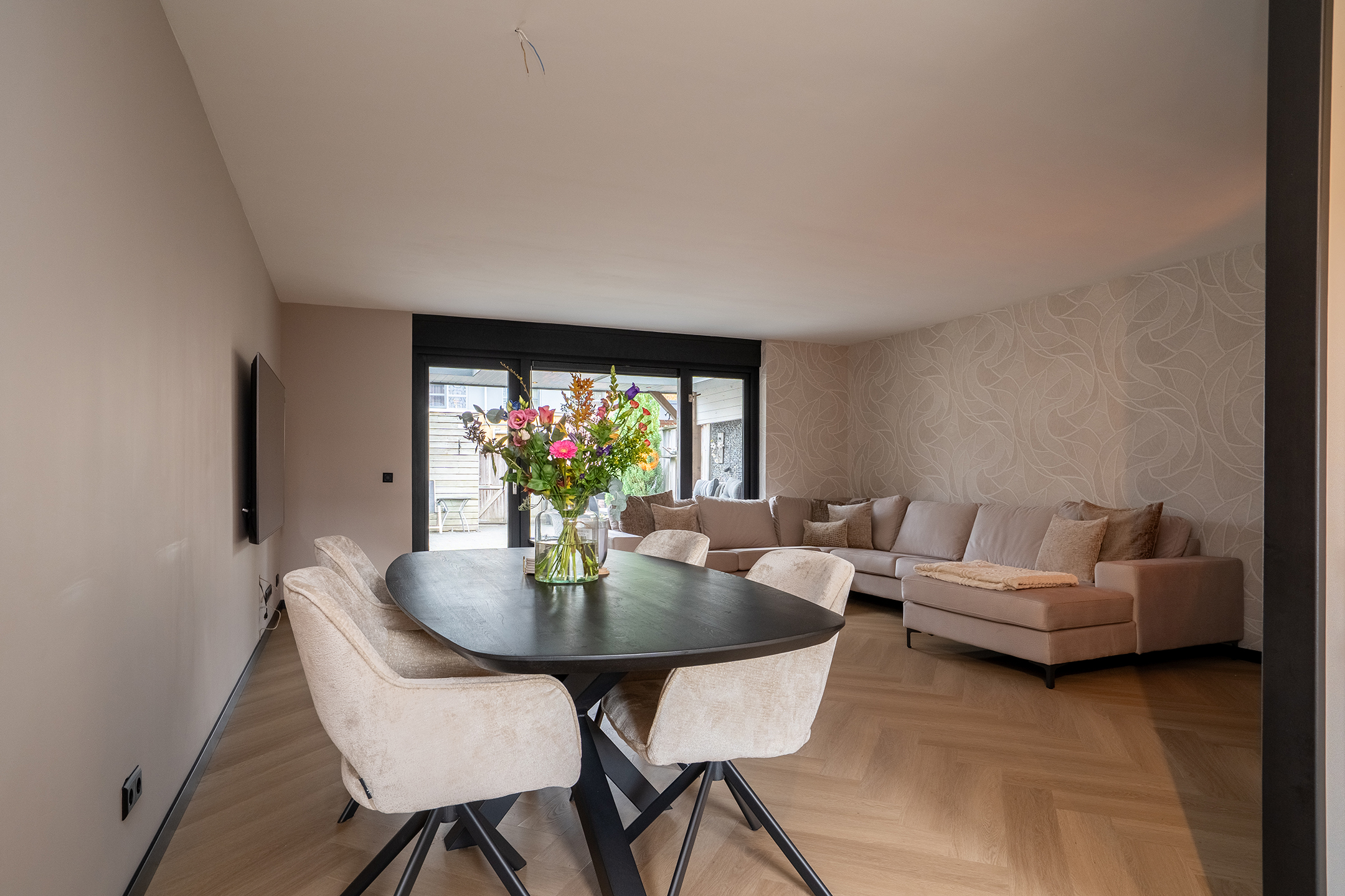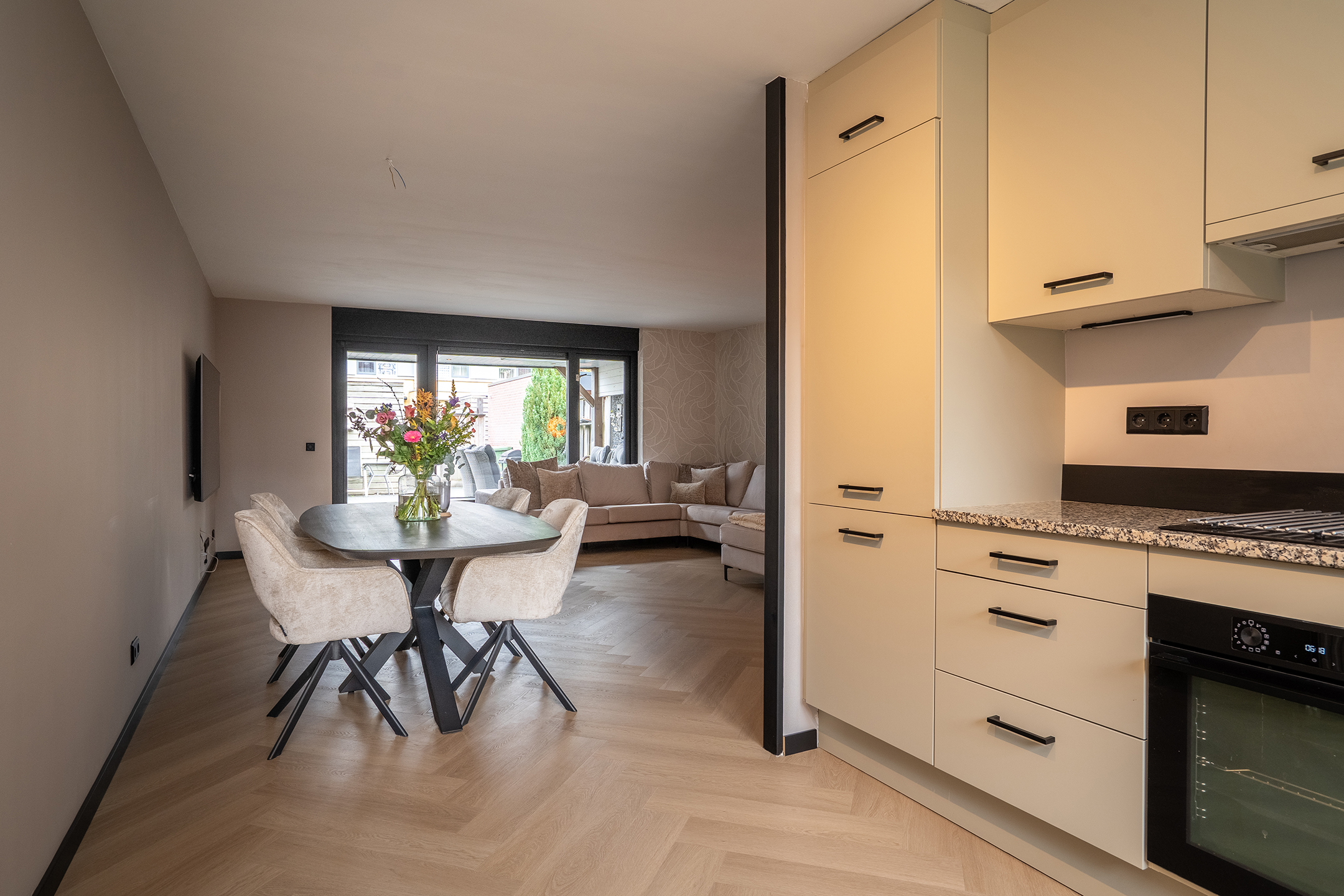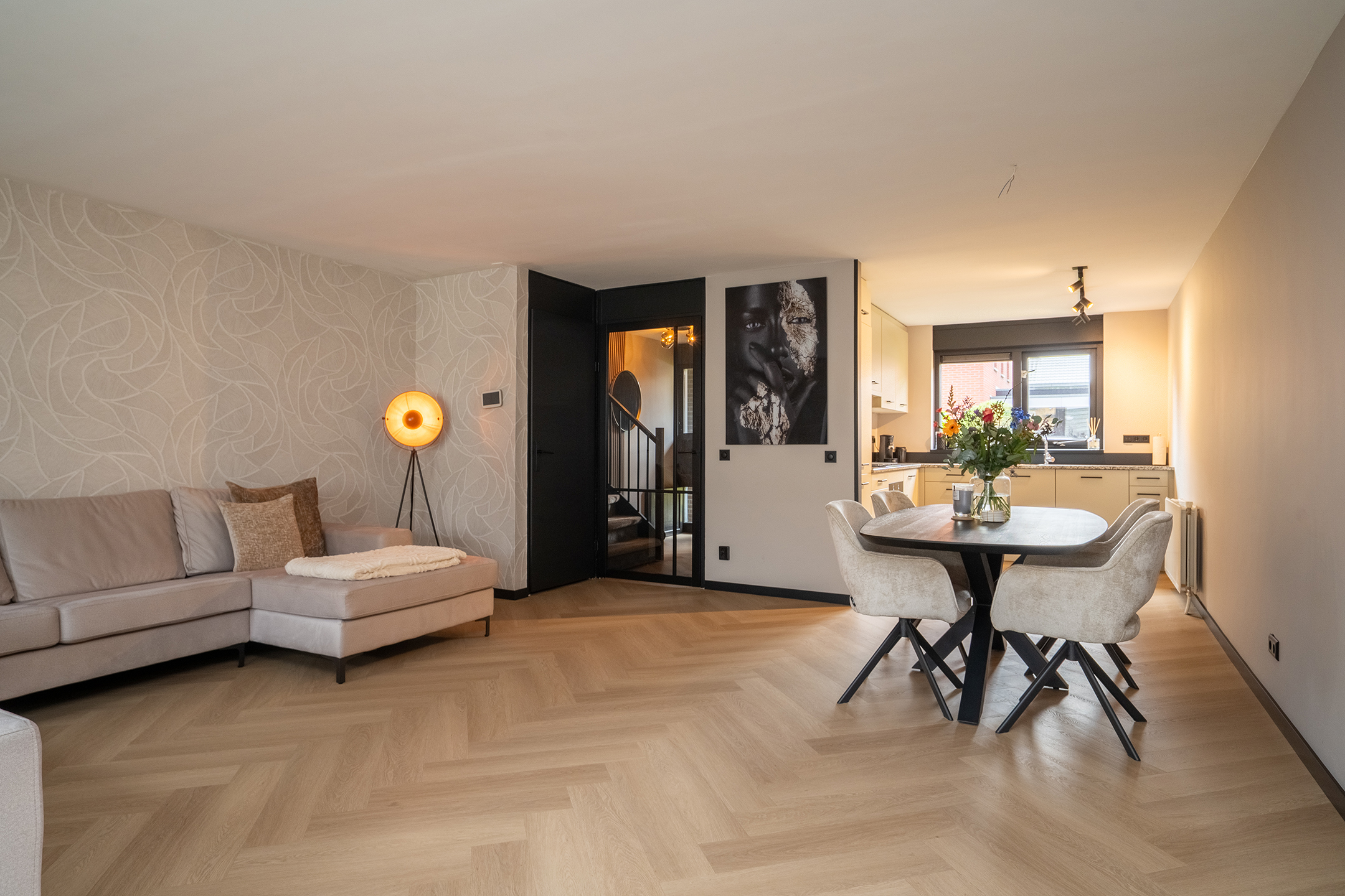 De inrichting is strak maar warm, met neutrale tinten en zwarte accenten die zorgen voor een moderne uitstraling. Dankzij de praktische indeling is er voldoende ruimte voor zowel een gezellige zithoek als een ruime eethoek.