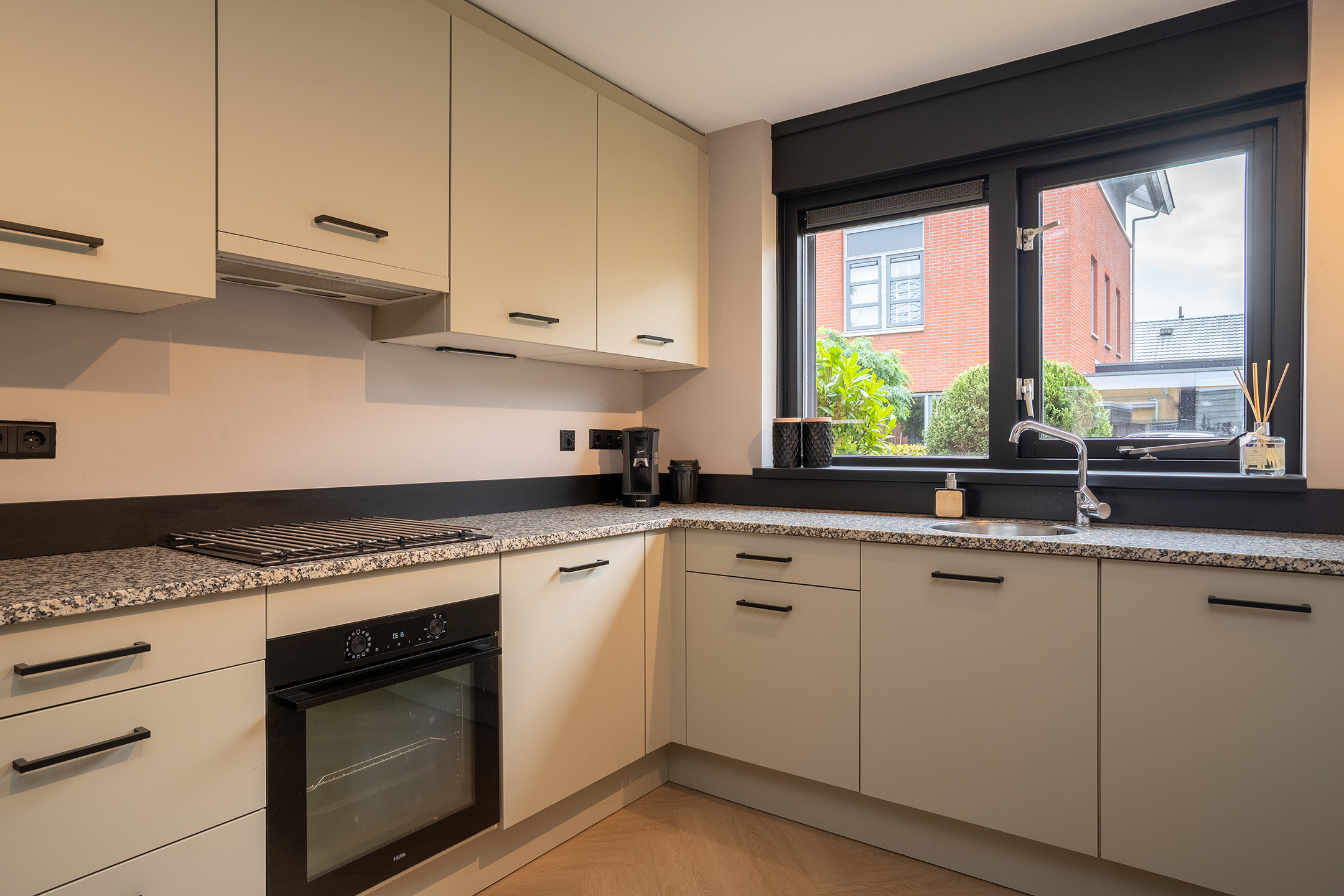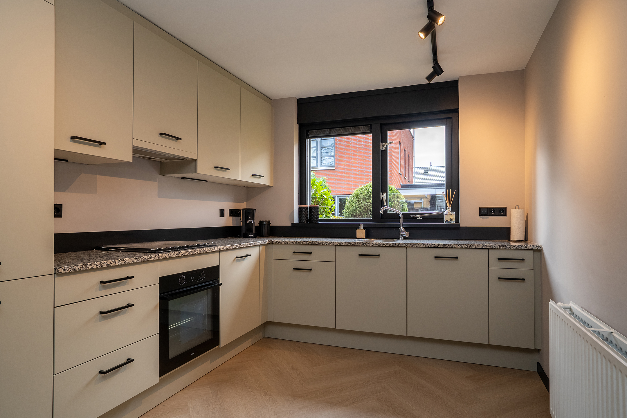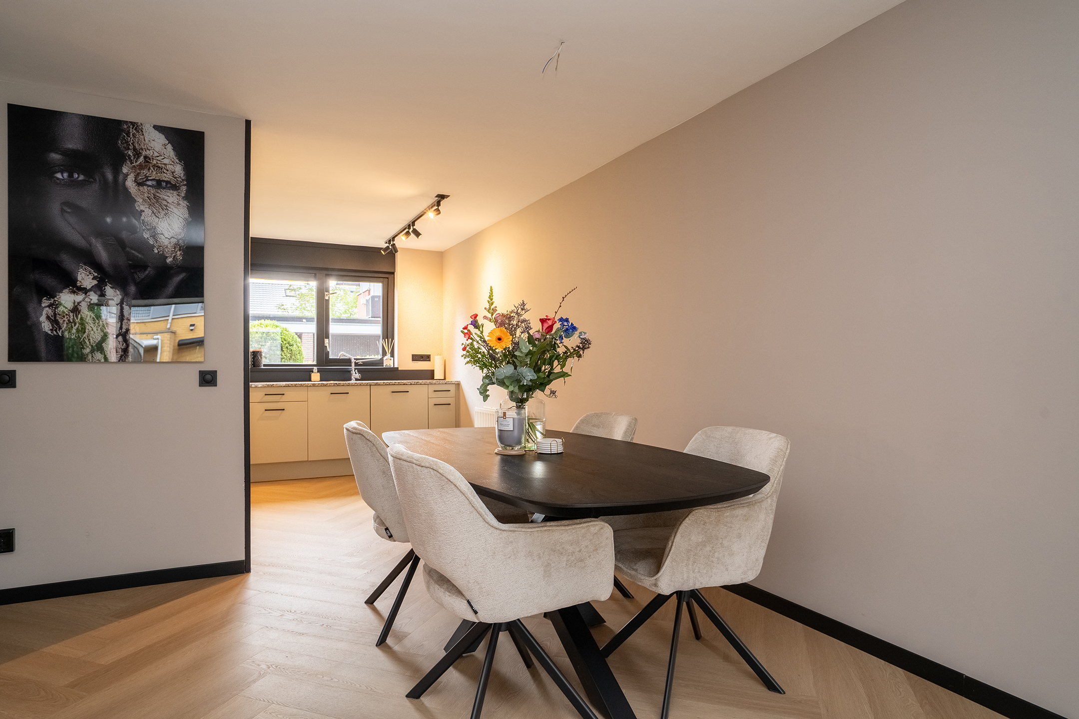De inrichting is strak maar warm, met neutrale tinten en zwarte accenten die zorgen voor een moderne uitstraling. Dankzij de praktische indeling is er voldoende ruimte voor zowel een gezellige zithoek als een ruime eethoek.