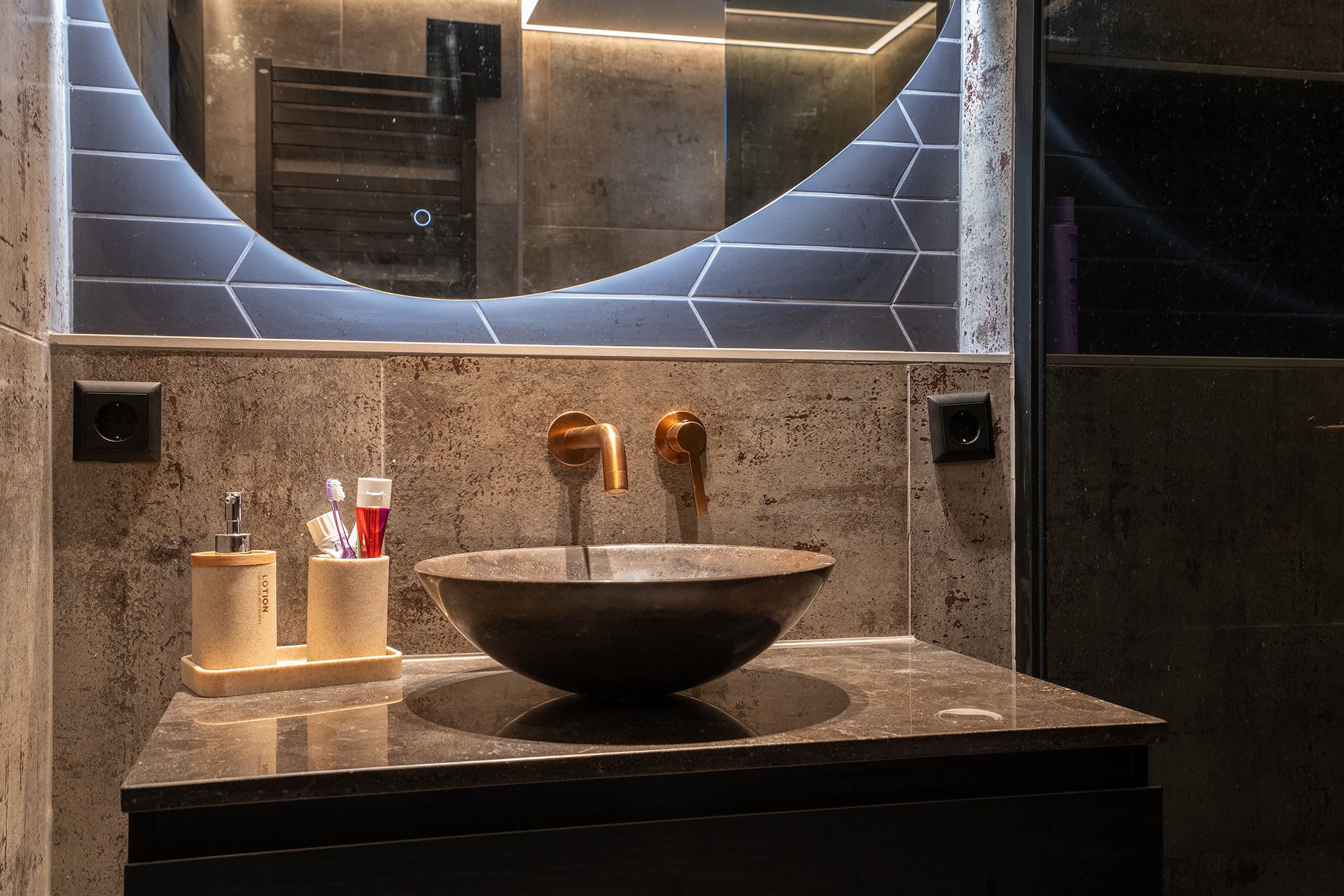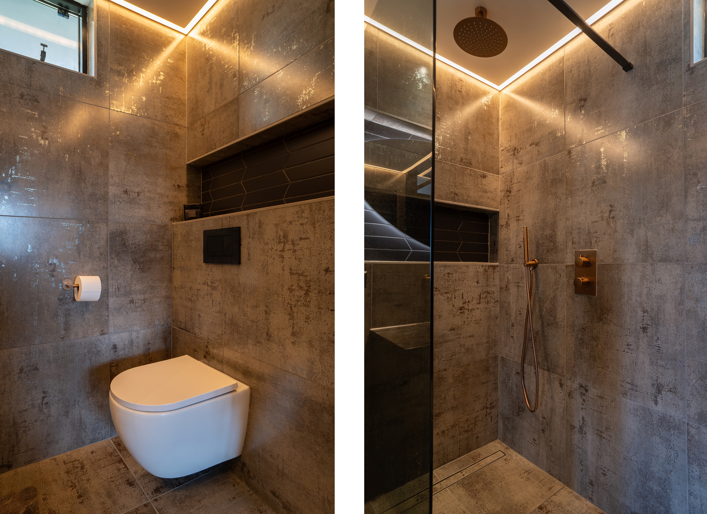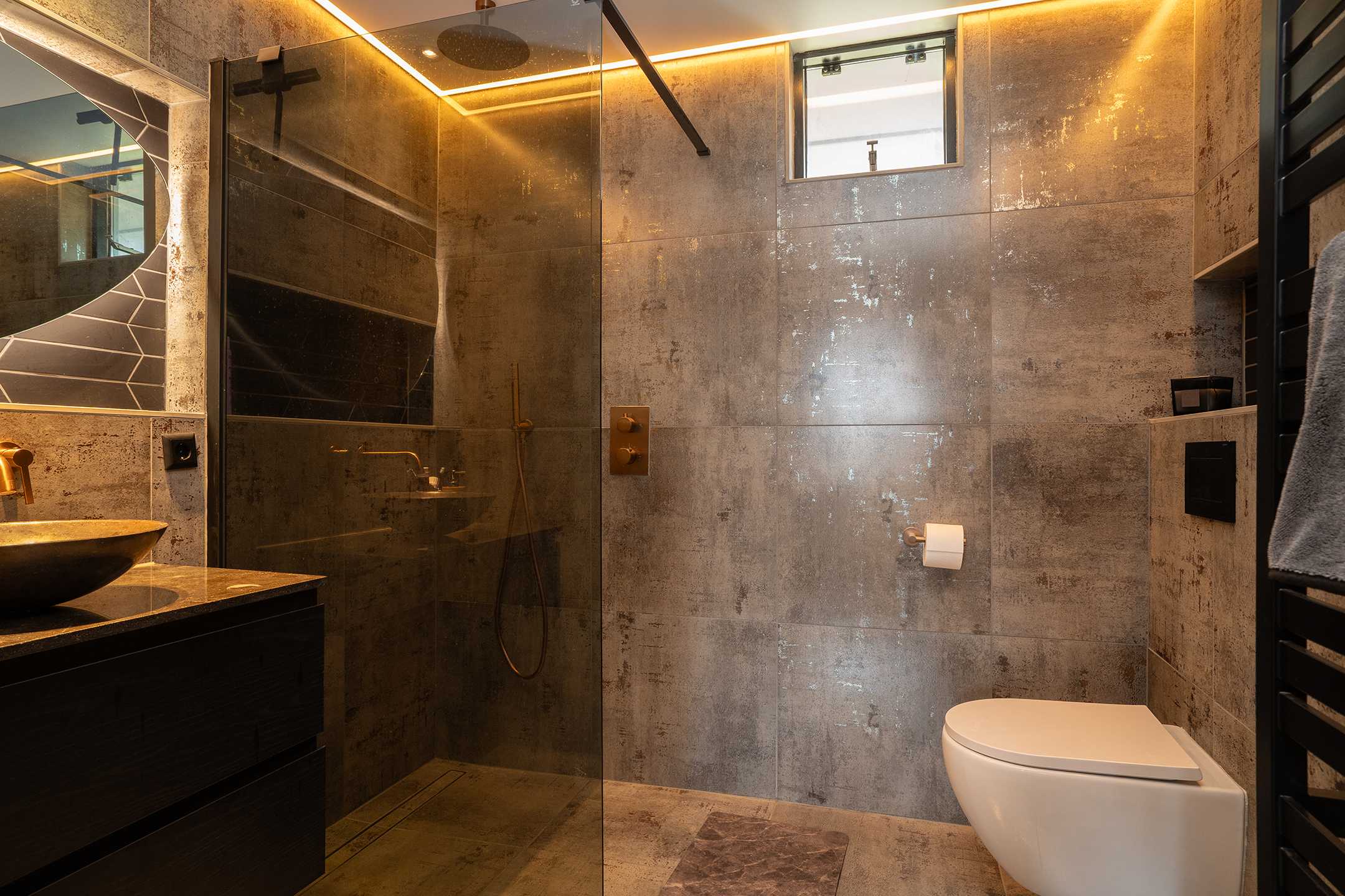 De in 2025 volledig vernieuwde badkamer straalt luxe en comfort uit. Deze is praktisch ingedeeld en uitgerust met een inloopdouche met bronzen regendouche en handdouche, een stijlvol wastafelmeubel met waskom en bijpassende bronzen inbouwkraan, en een toilet. De warme tinten, het moderne tegelwerk en de sfeervolle verlichting maken dit een ruimte waar design en ontspanning perfect samenkomen.