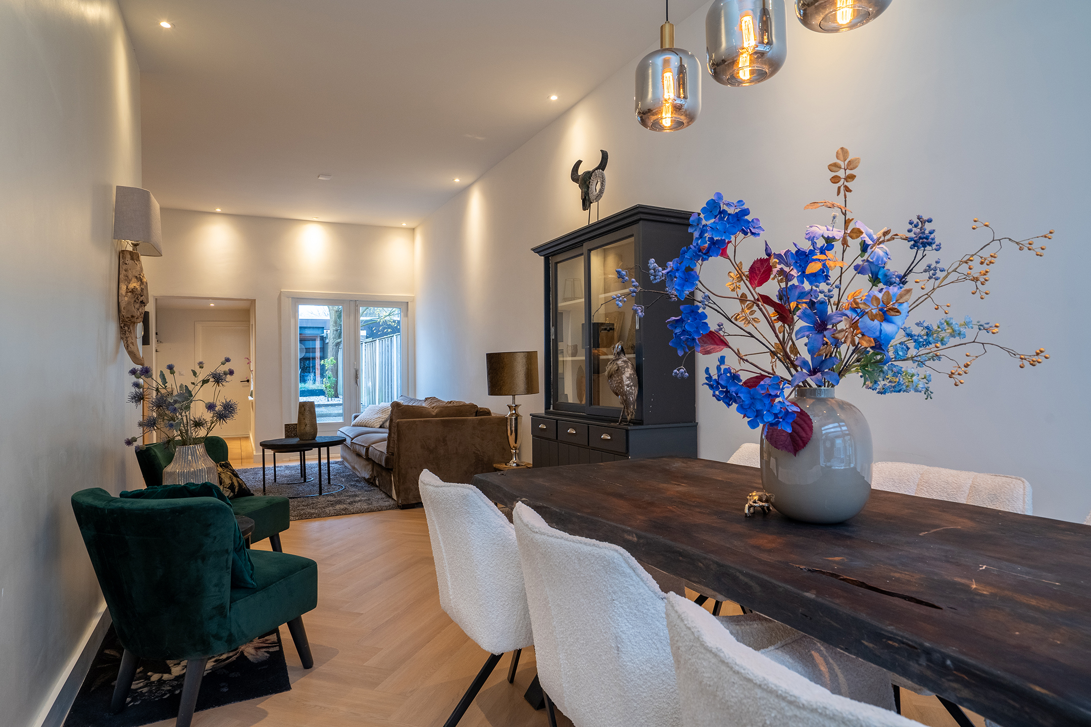 Begane grond: Entree, hal met trapopgang. Ruime en lichte doorzonwoonkamer voorzien van comfortabele vloerverwarming en openslaande tuindeuren. Aangrenzend bevindt zich de dichte, luxe uitgevoerde keuken, eveneens met vloerverwarming. Vanuit de keuken is de bijkeuken bereikbaar, evenals het moderne toilet.