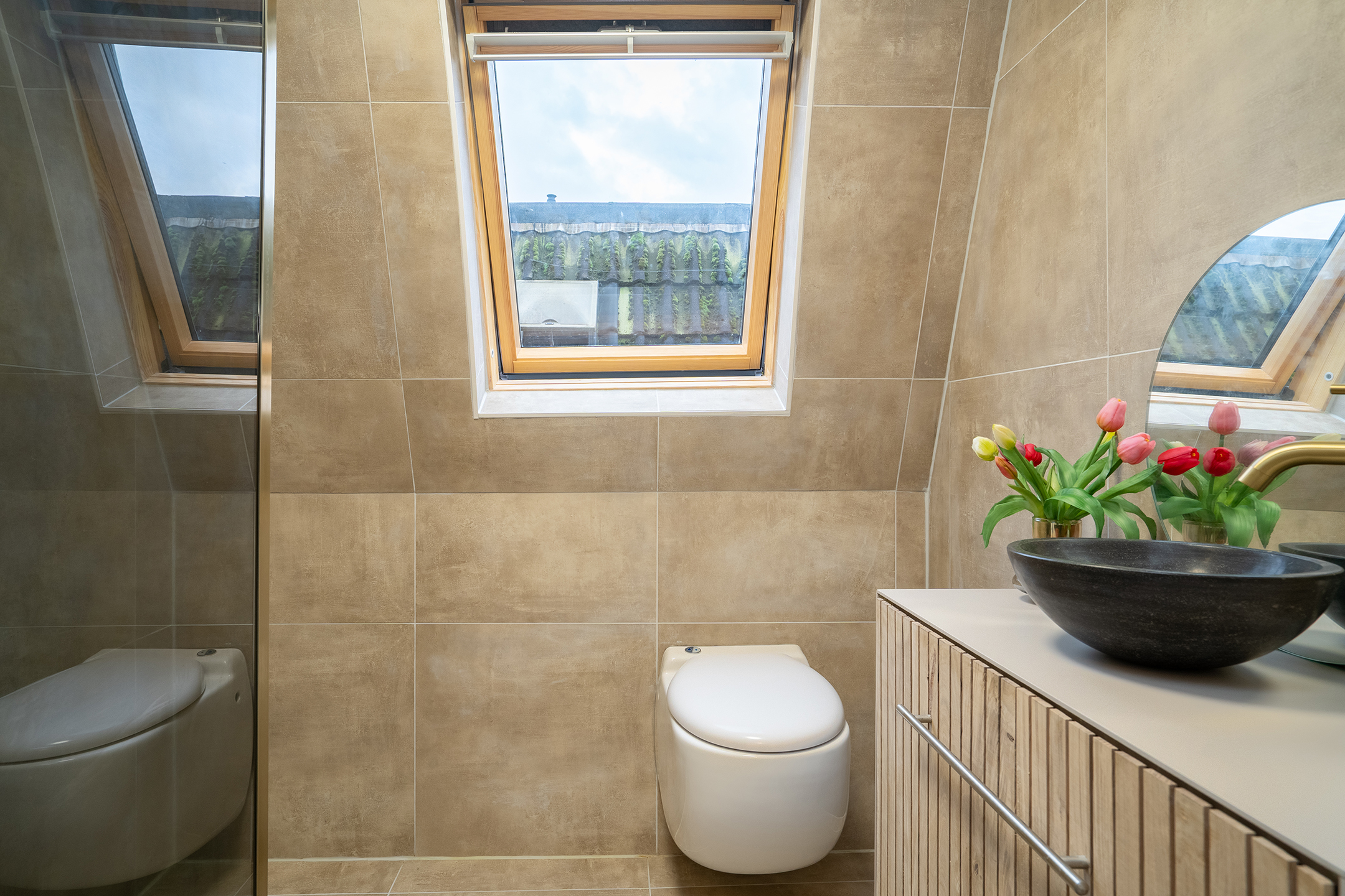 Eerste verdieping: Overloop met toegang tot twee royale slaapkamers. De luxe badkamer is compleet uitgevoerd met een stijlvol wastafelmeubel, een tweede toilet en een ruime inloopdouche.
