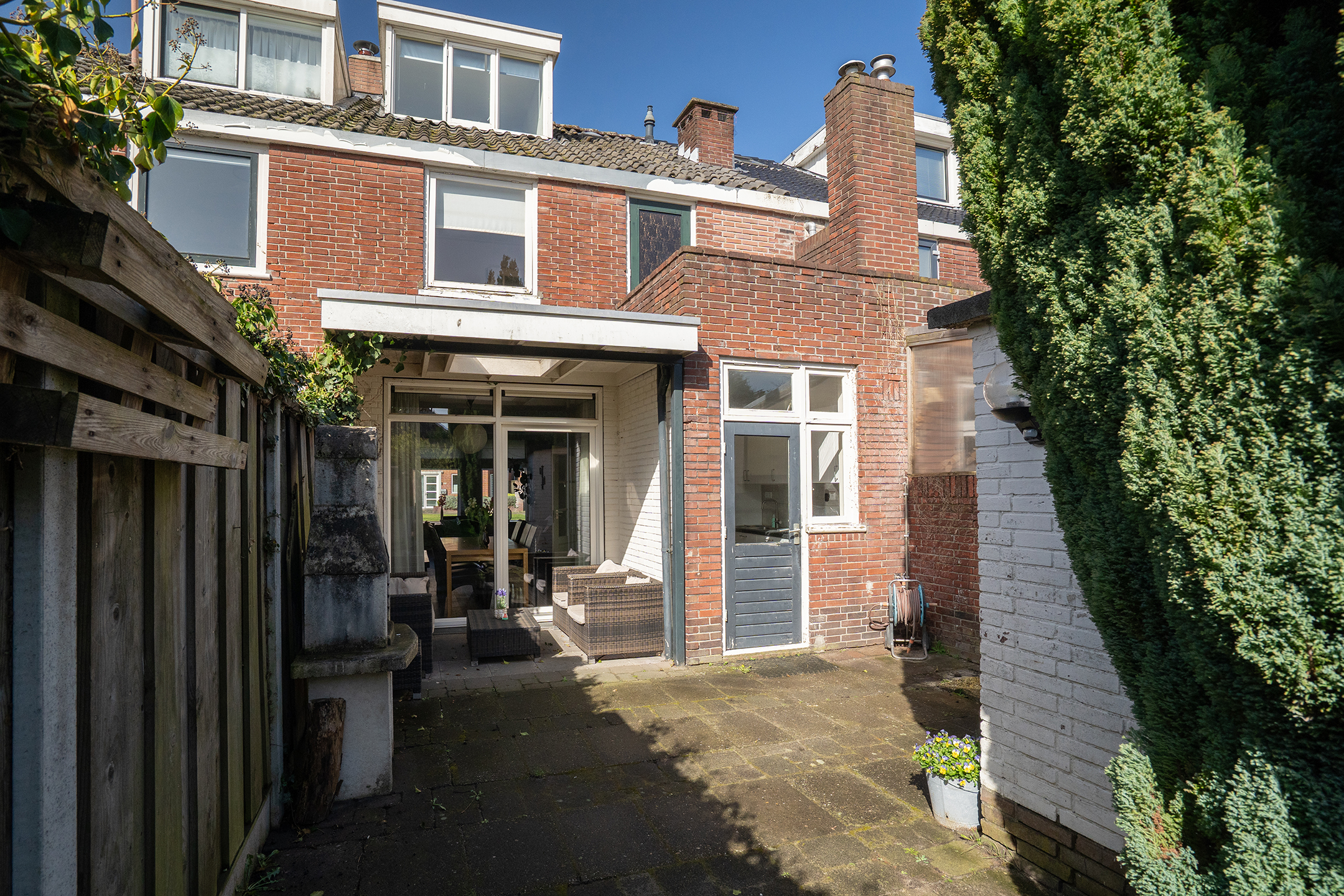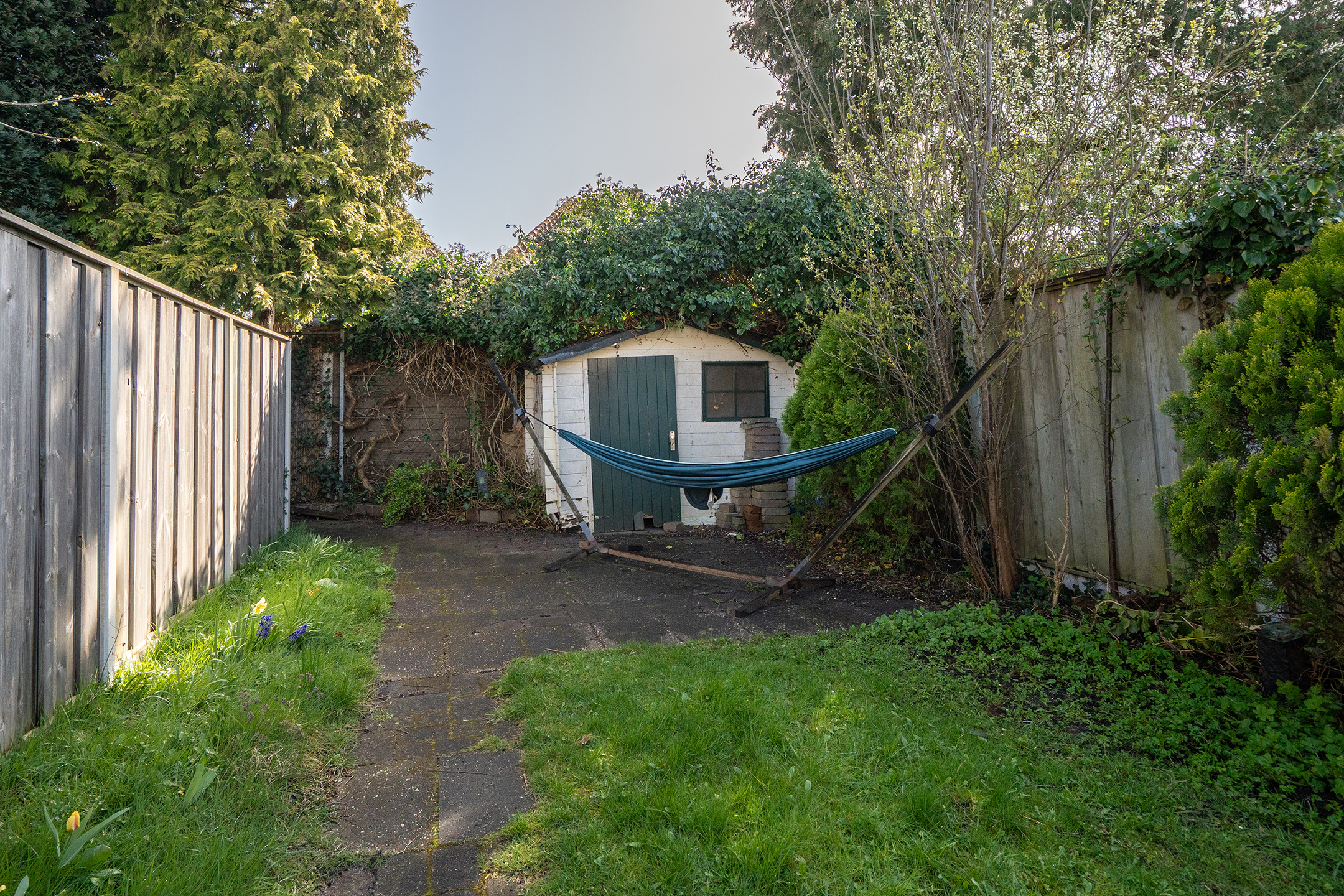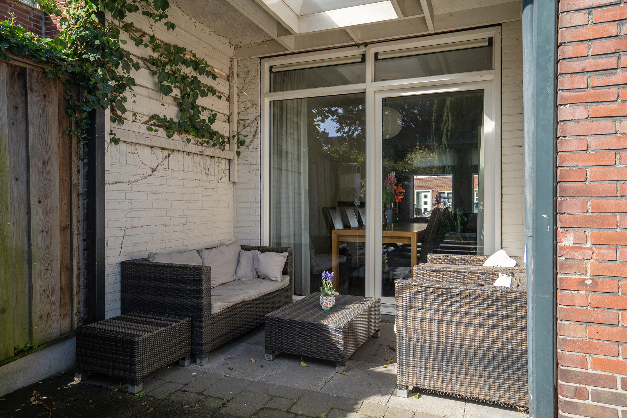 Buiten: de woning beschikt over een diepe achtertuin met een gunstige zonligging op het zuidoosten. De tuin is ingericht met meerdere terrassen en groen, waardoor er altijd een fijne plek in de zon of schaduw te vinden is. Er is een stenen berging met elektra aanwezig voor het stallen van fietsen en het opbergen van gereedschap en tuinmeubilair.