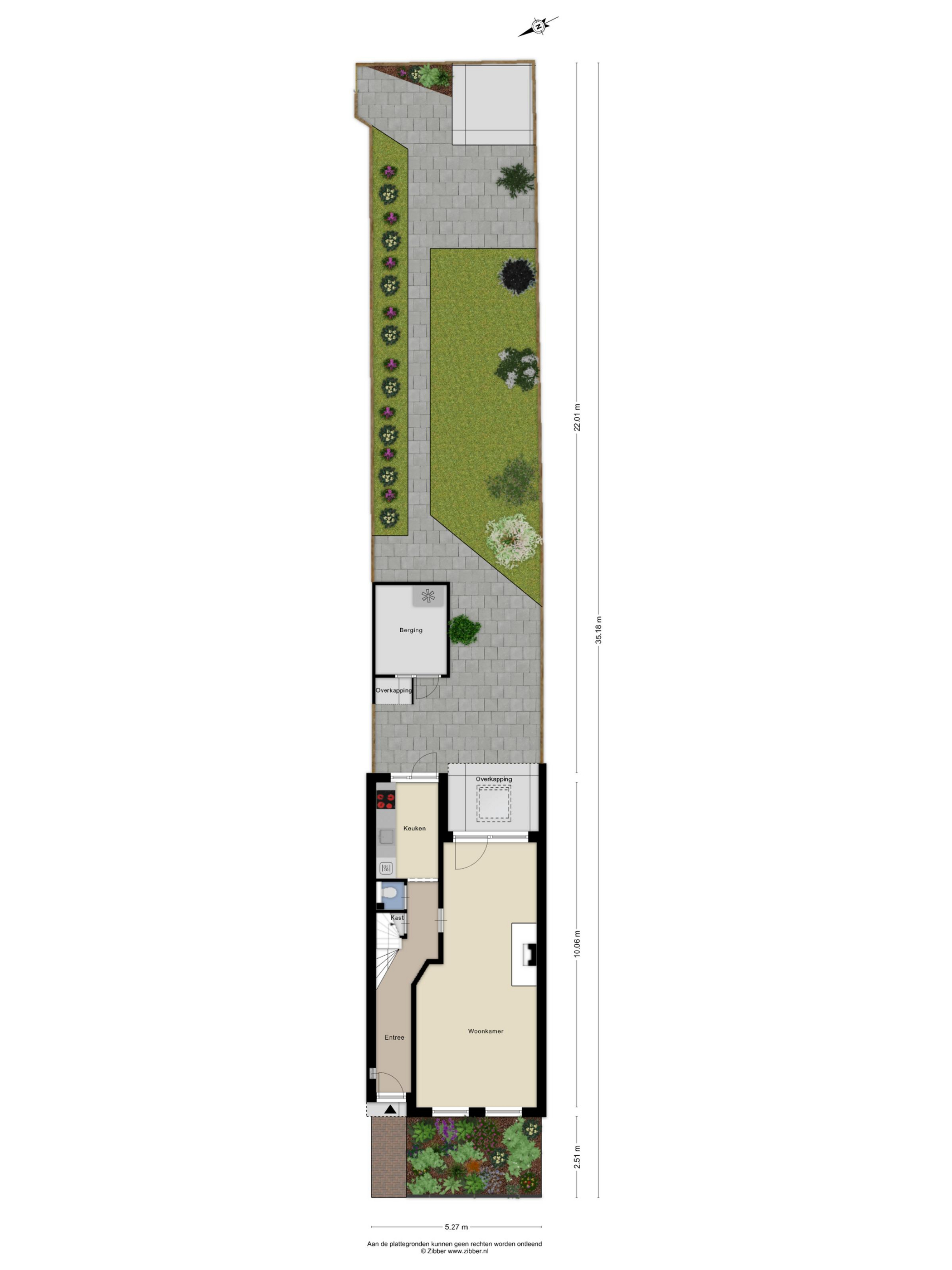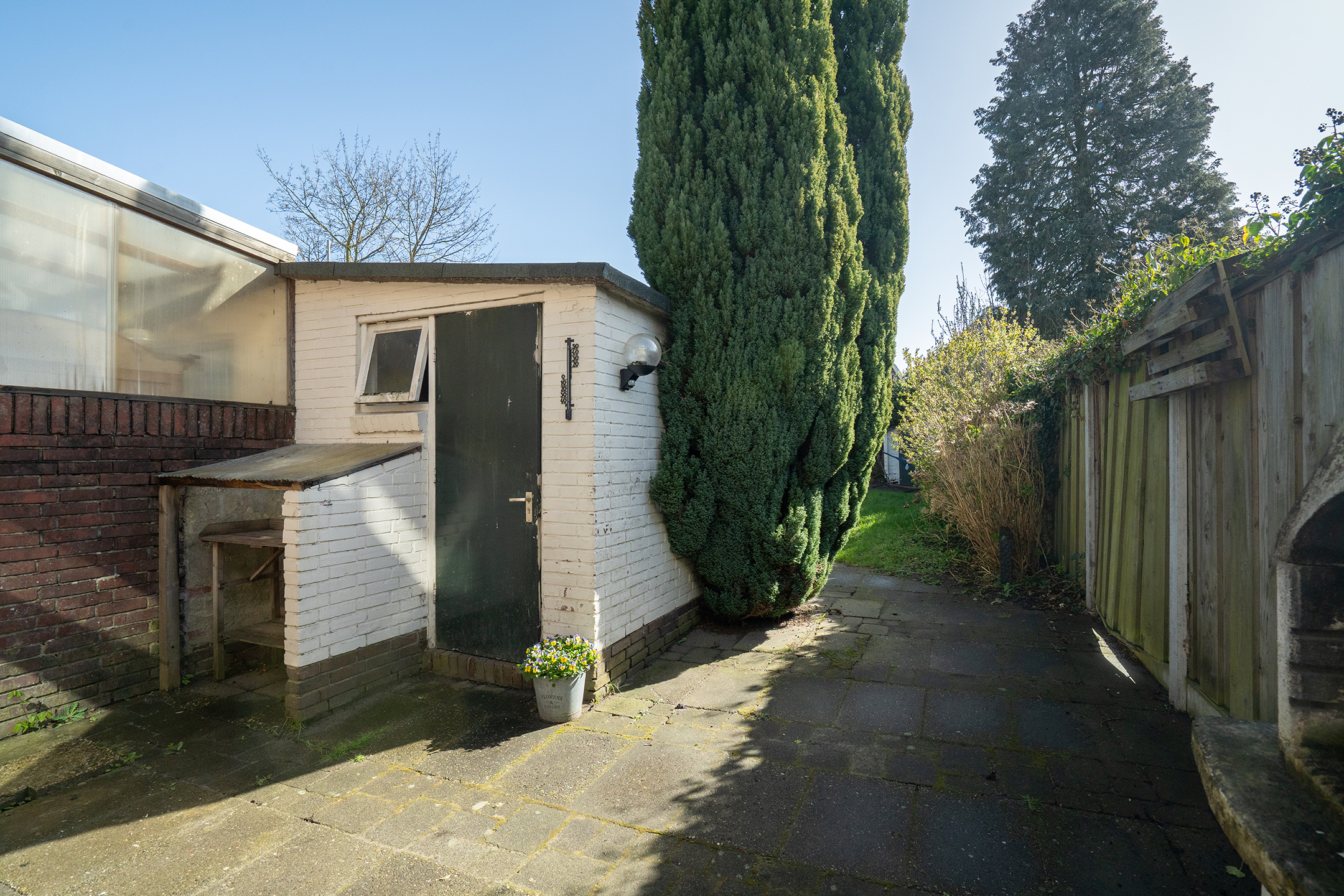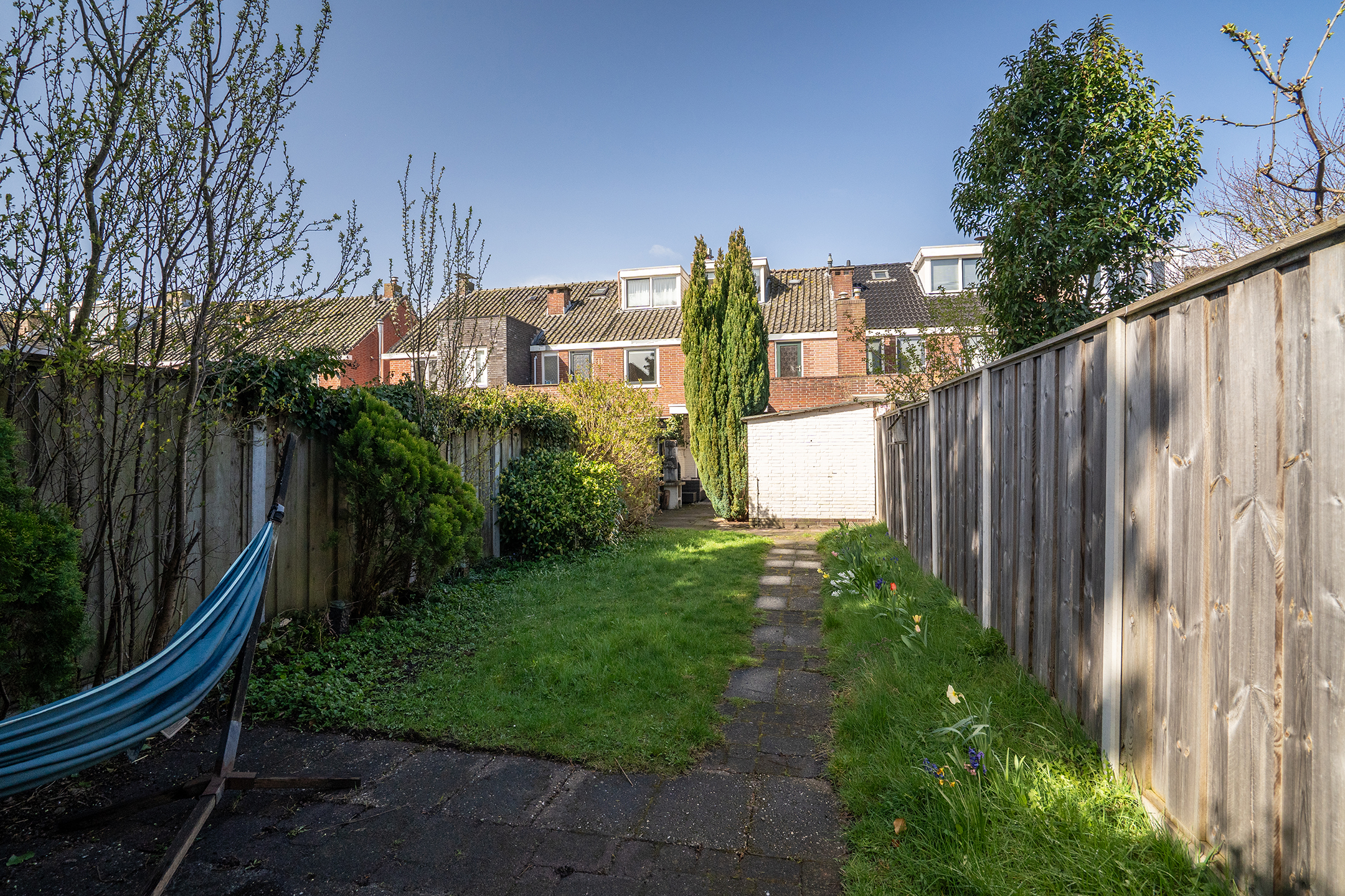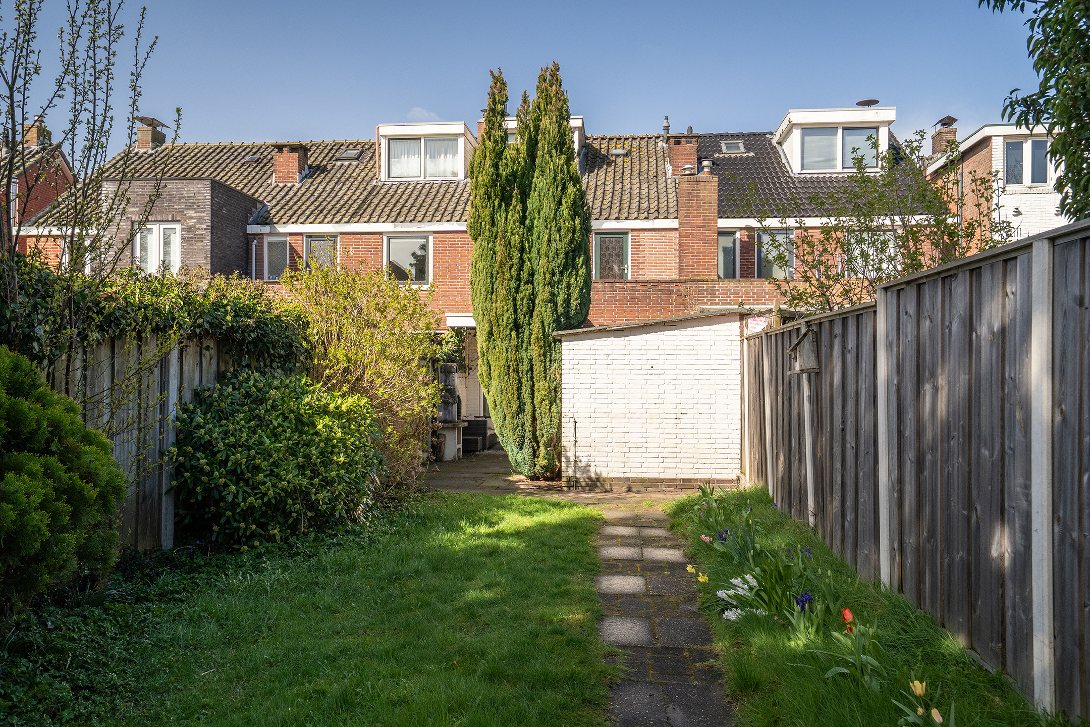Buiten: de woning beschikt over een diepe achtertuin met een gunstige zonligging op het zuidoosten. De tuin is ingericht met meerdere terrassen en groen, waardoor er altijd een fijne plek in de zon of schaduw te vinden is. Er is een stenen berging met elektra aanwezig voor het stallen van fietsen en het opbergen van gereedschap en tuinmeubilair.
