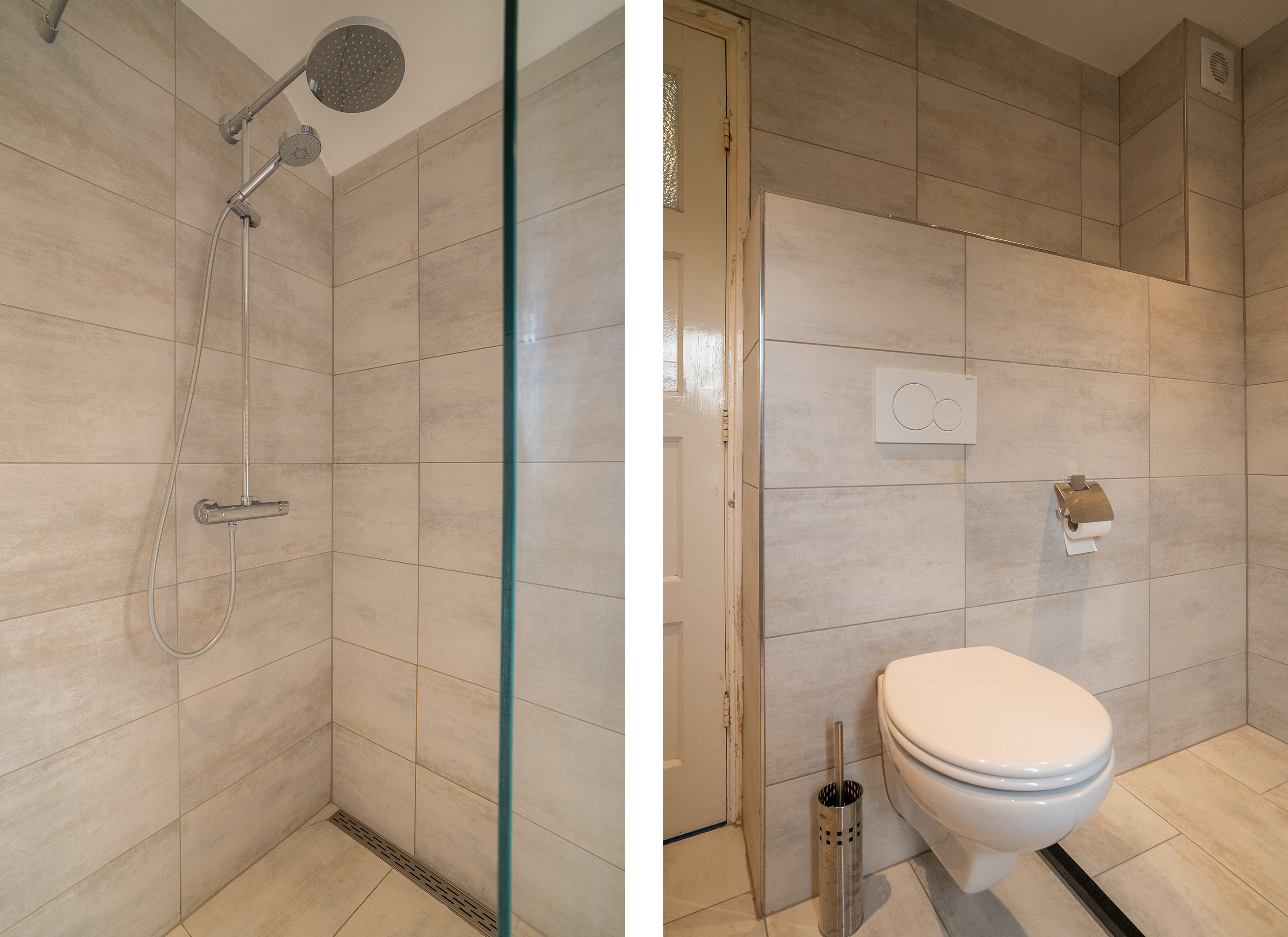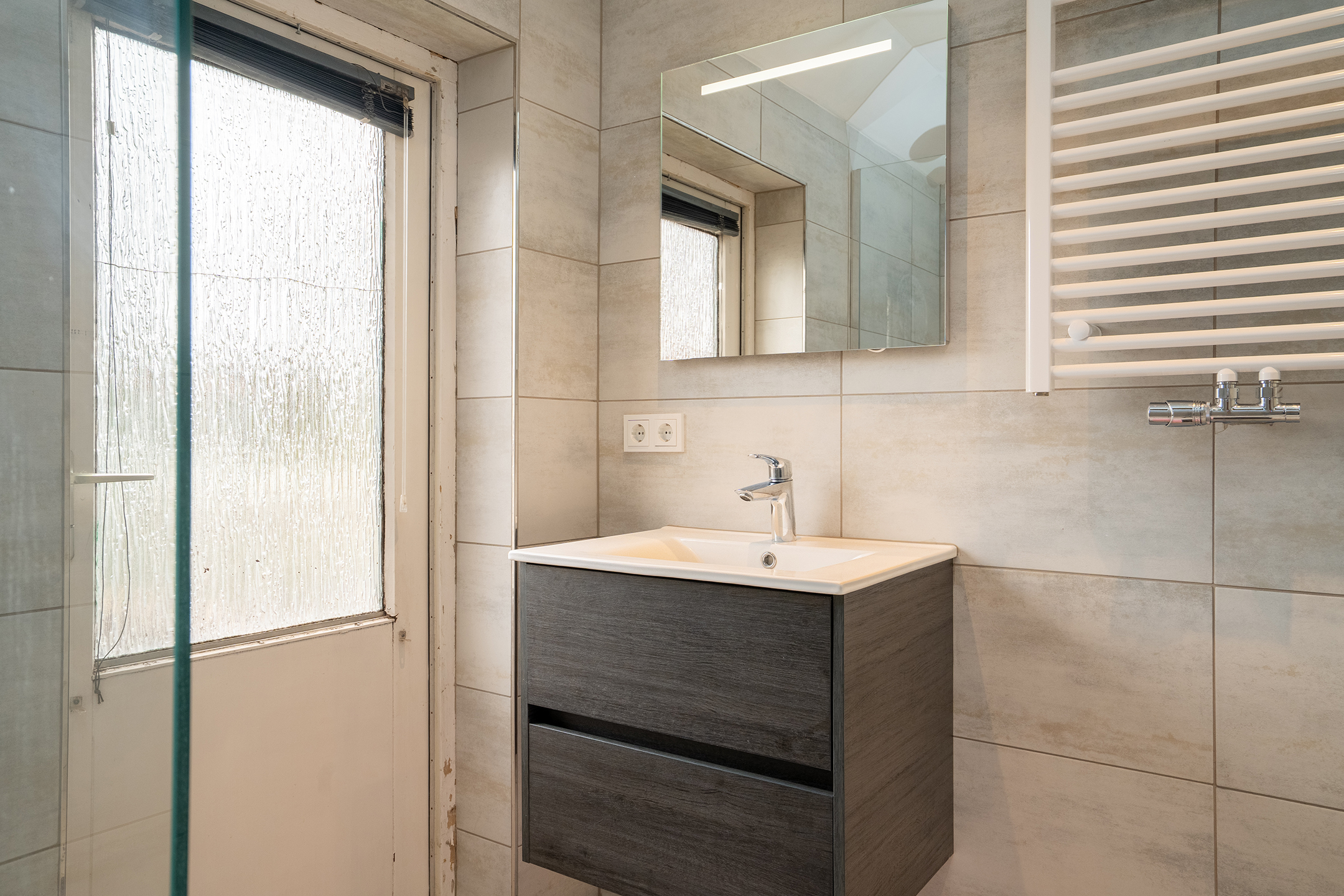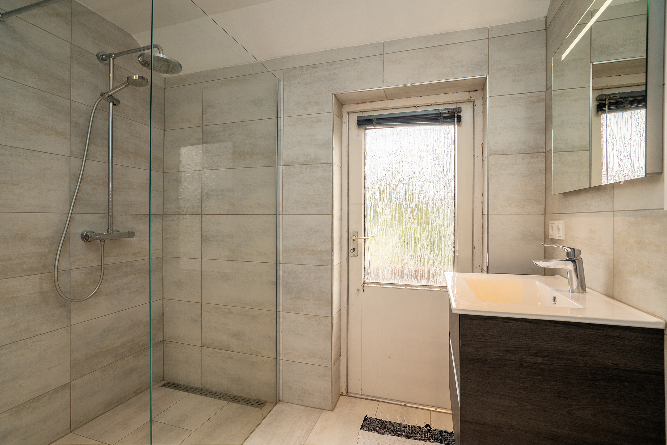 Eerste verdieping: overloop met toegang tot drie slaapkamers en de badkamer. De badkamer is in 2025 vernieuwd en uitgevoerd met een ruime inloopdouche, tweede toilet en wastafelmeubel. Vanuit de badkamer is er toegang tot het kleine balkon aan de achterzijde, wat zorgt voor extra buitenruimte en ventilatiemogelijkheden.