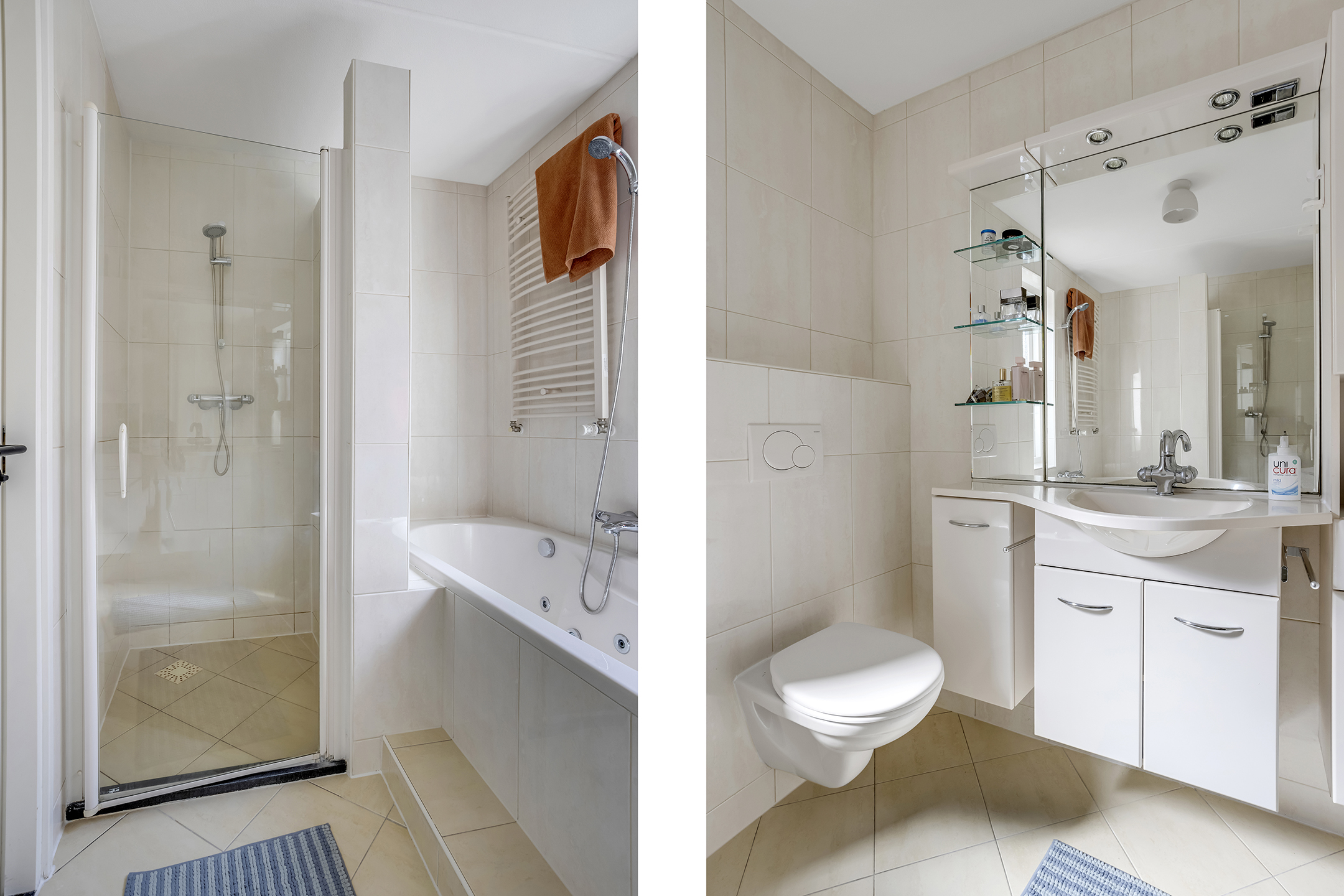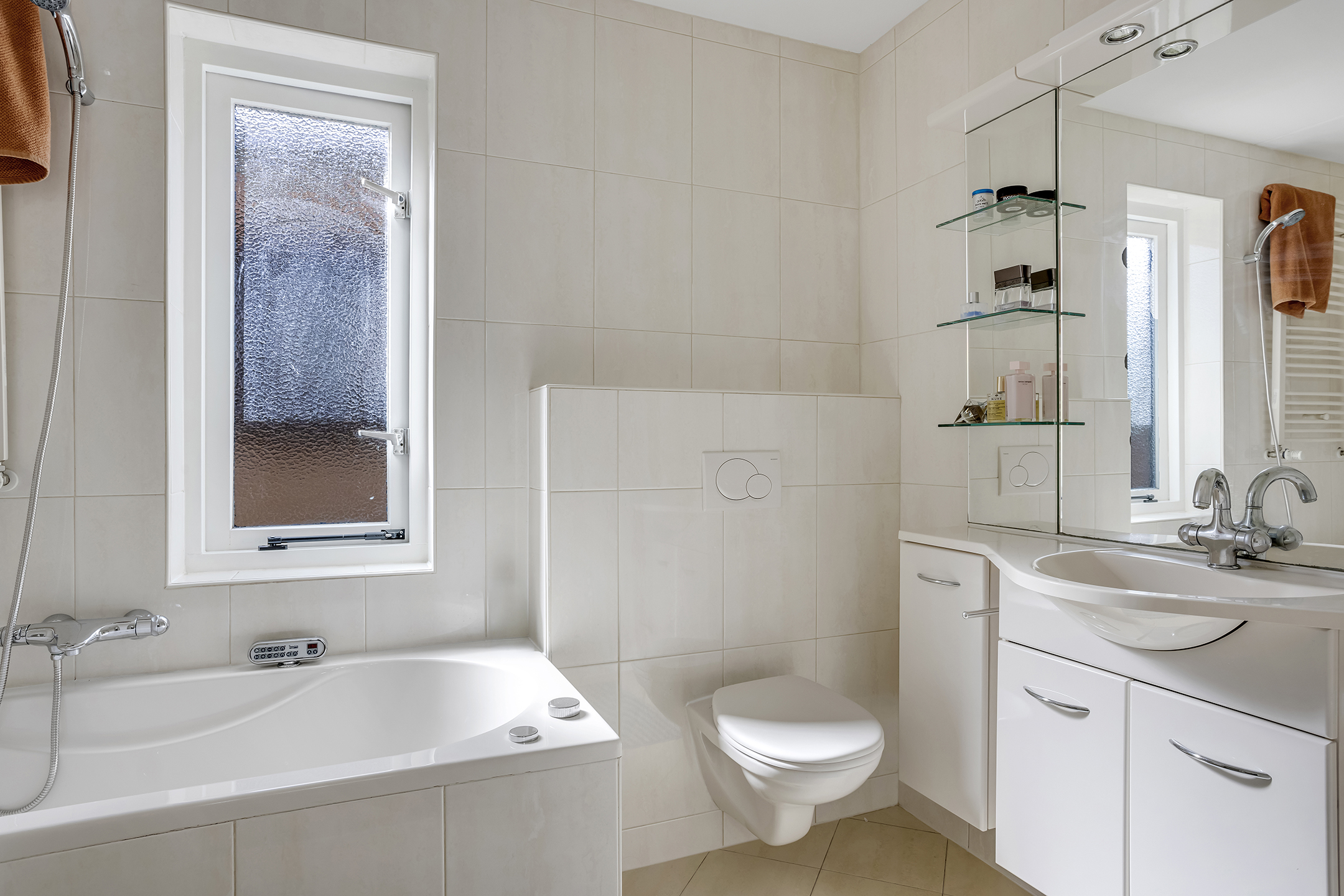 1e Verdieping: Overloop met toegang tot twee royale slaapkamers en de stookruimte (CV-opstelling). De complete badkamer is uitgerust met een ligbad inclusief jacuzzi-functie, een aparte doucheruimte, een tweede toilet en een wastafelmeubel.