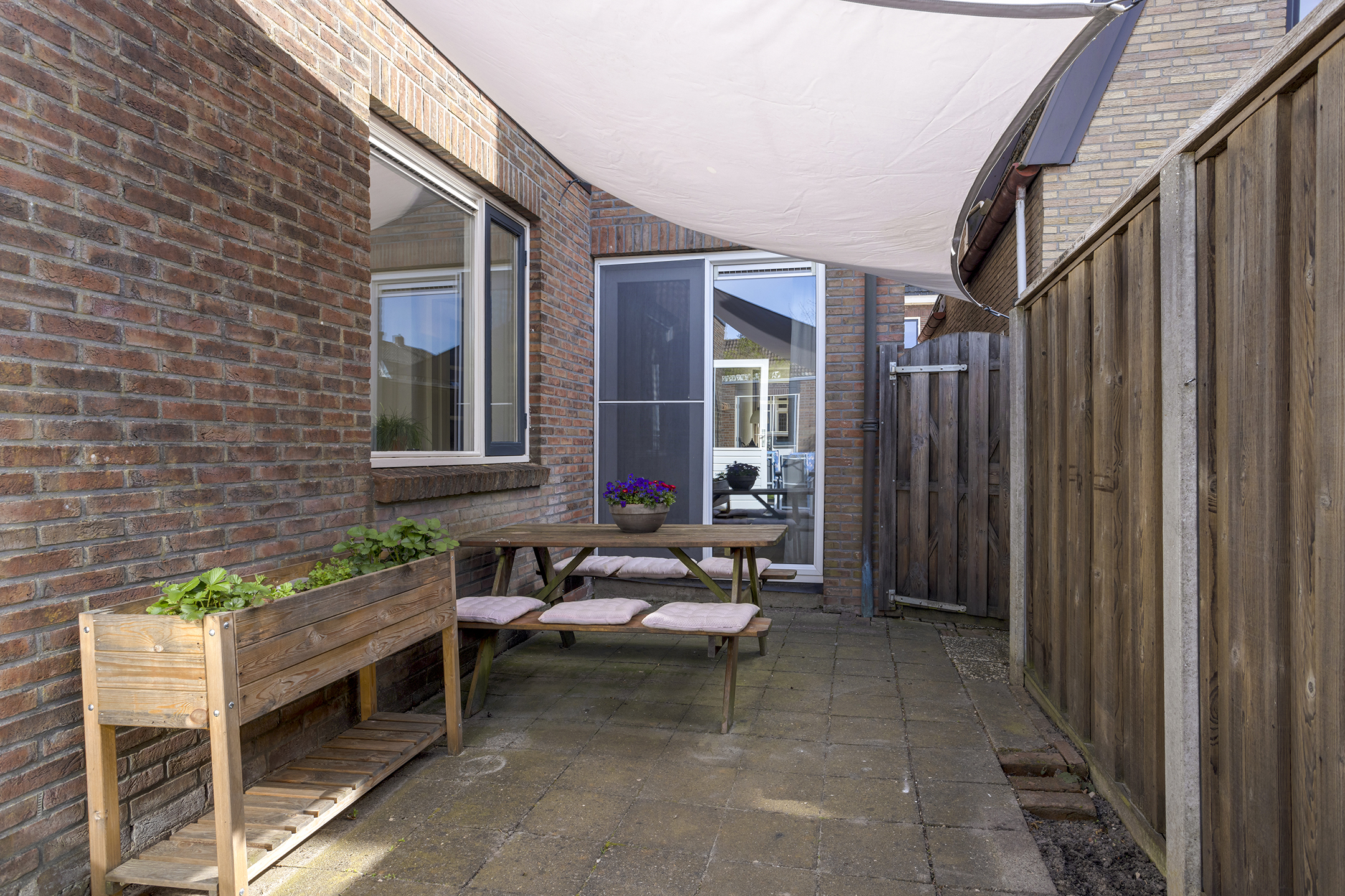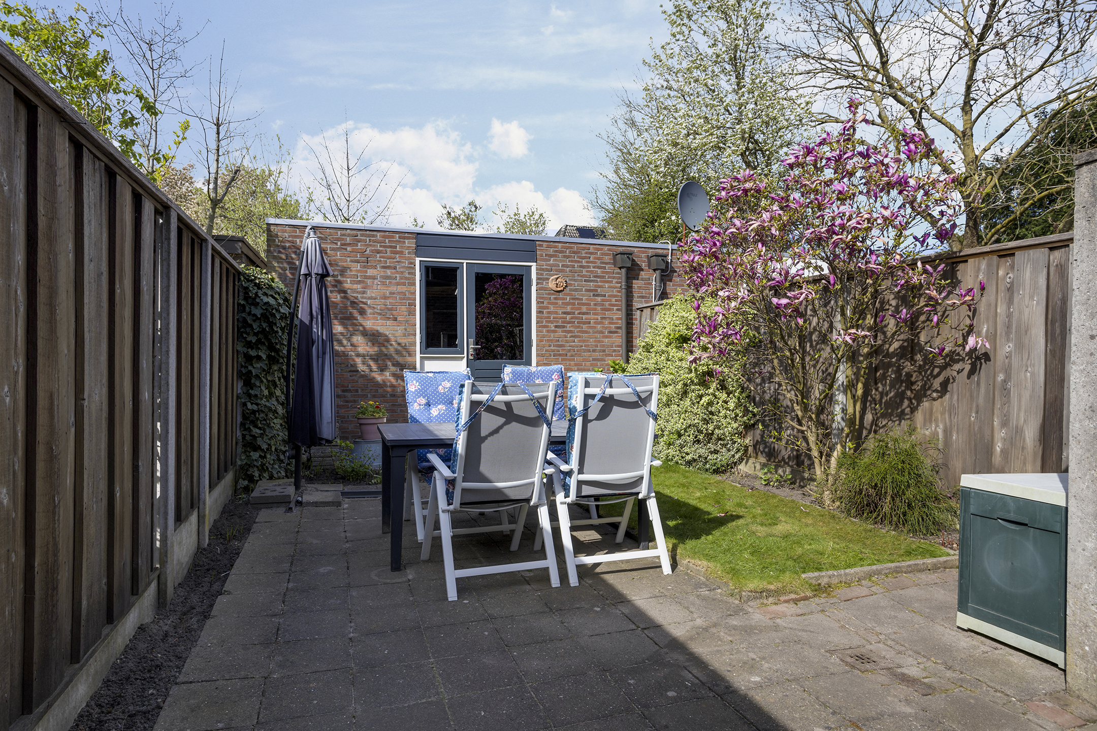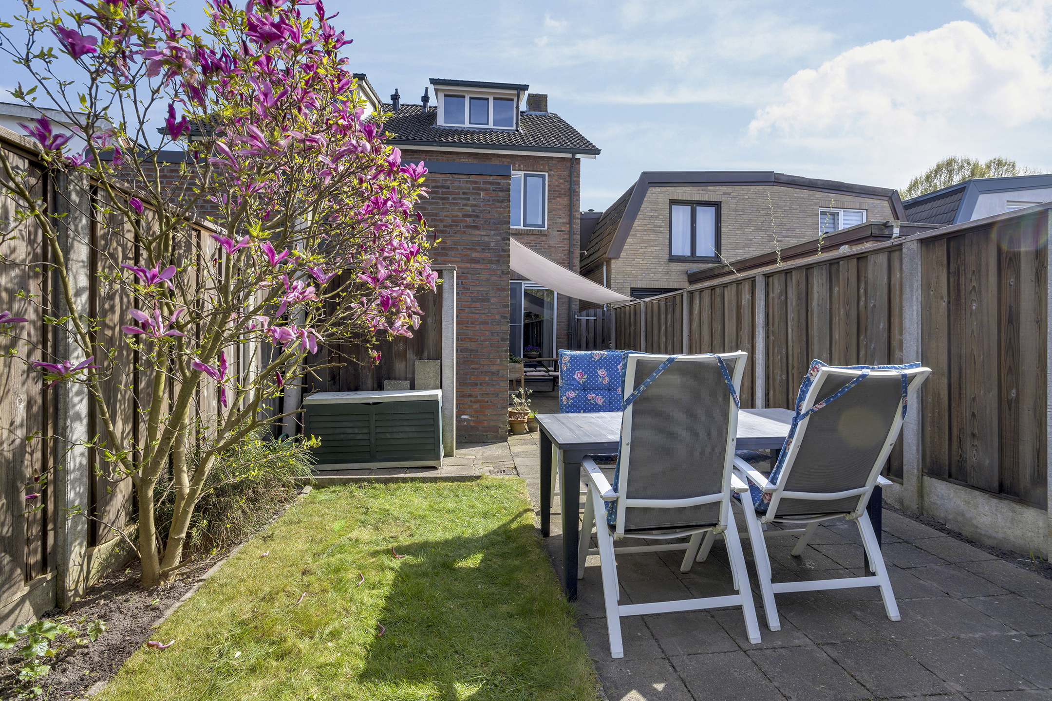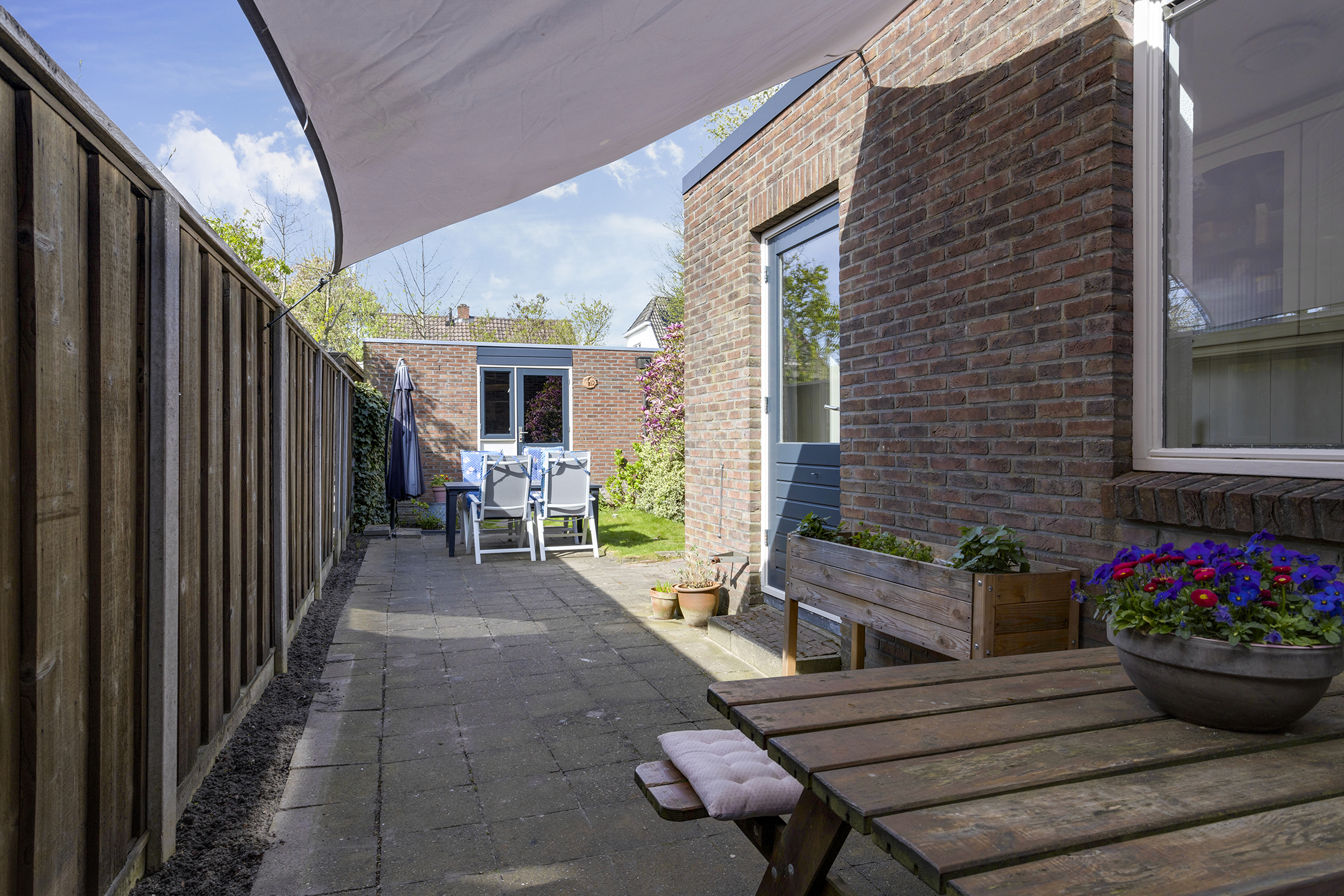 De achtertuin is op het noorden gelegen, maar door de gunstige afmetingen geniet je hier toch volop van de zon. De tuin is via een eigen achterom langs het huis bereikbaar. Achterin staat een ruime, vrijstaande stenen schuur, perfect voor de hobbyist.