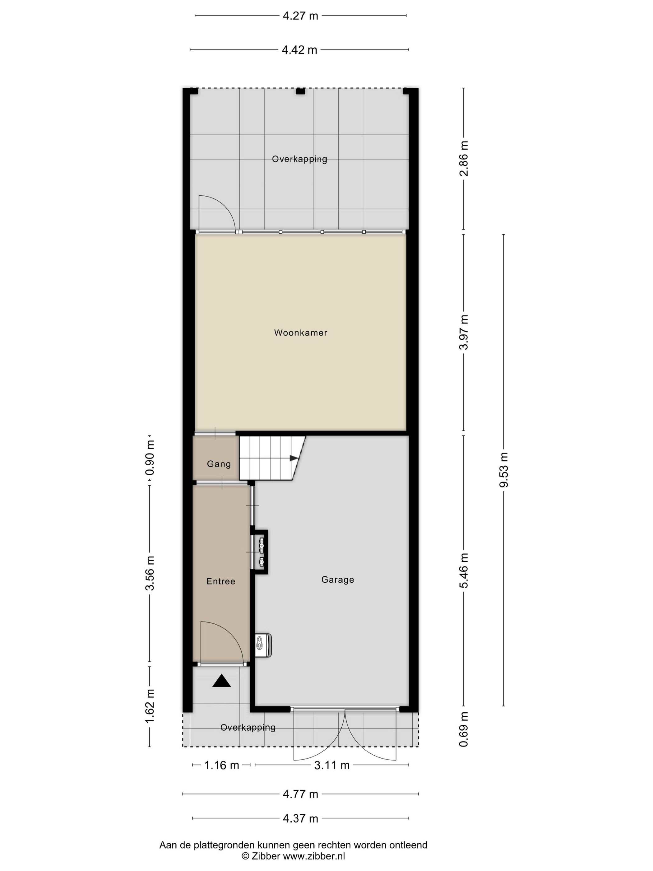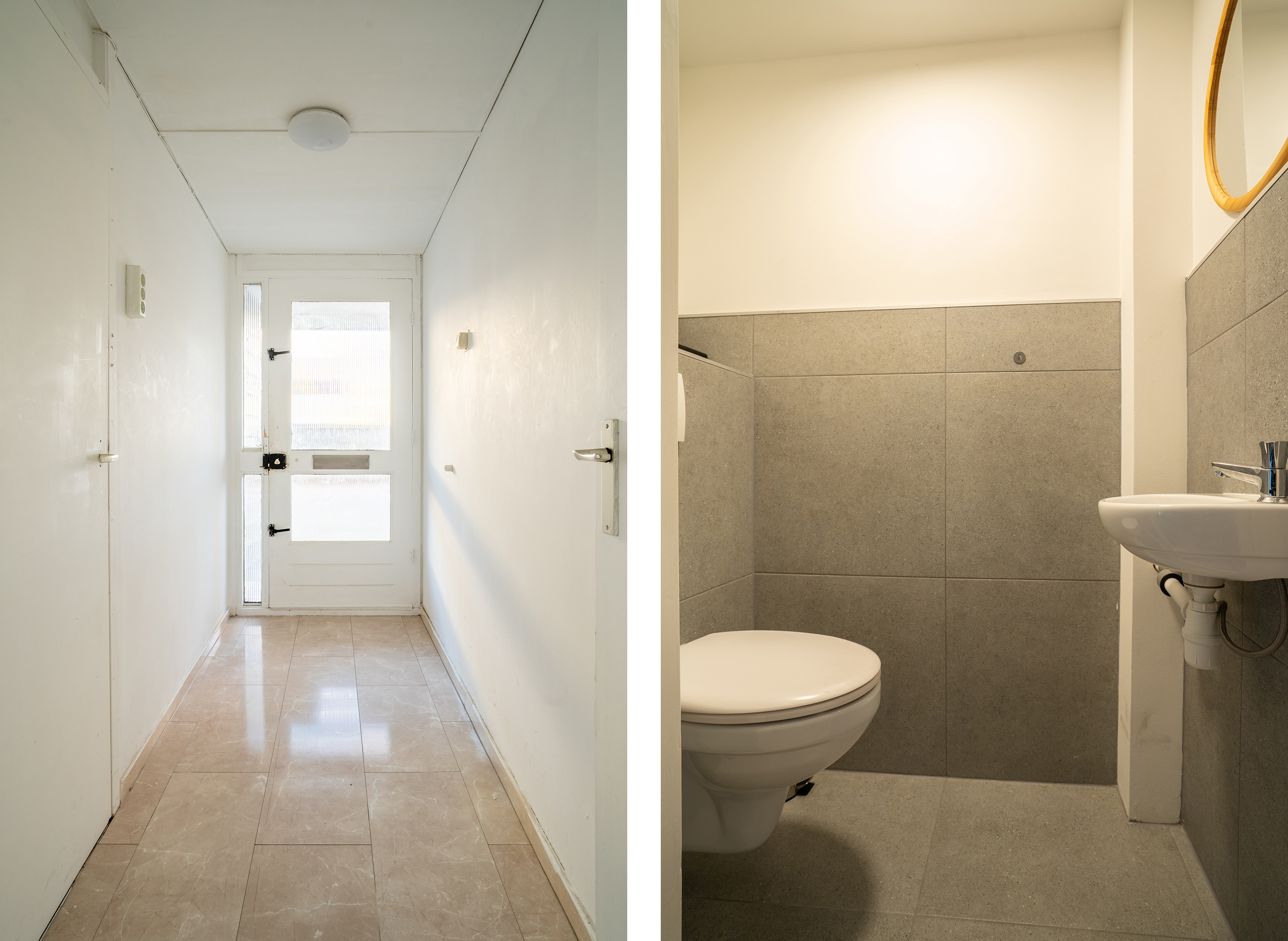 Begane grond: Bij binnenkomst kom je in de ruime entreehal, voorzien van de meterkast en de trapopgang. Vanuit hier heb je toegang tot de garage, ideaal voor fietsen, opslag of een hobbyruimte. De hal leidt door naar de royale hobby/woonkamer, die uitkomt op een overkapping aan de achterzijde. Deze overkapping is perfect als tweede zithoek, en biedt direct toegang tot de tuin. De woonkamer is licht en sfeervol dankzij de grote raampartijen.