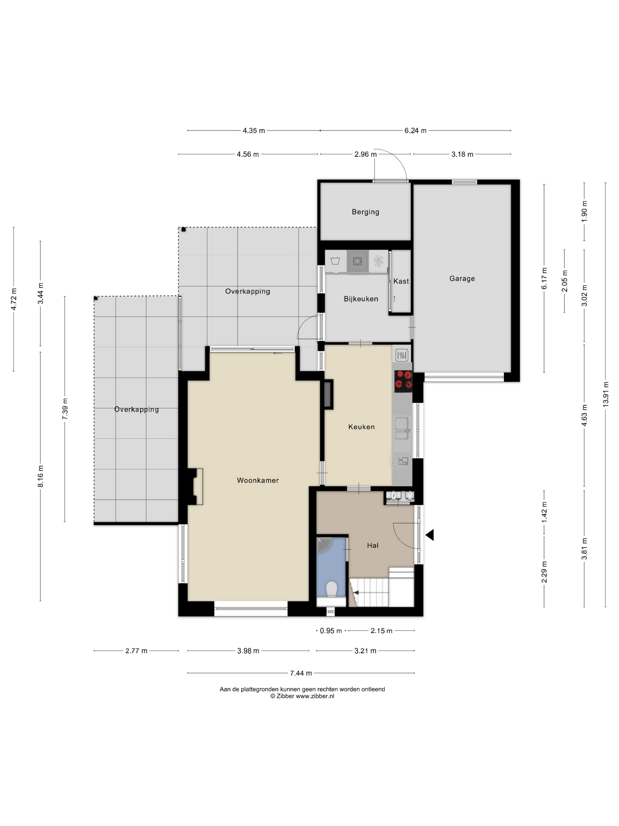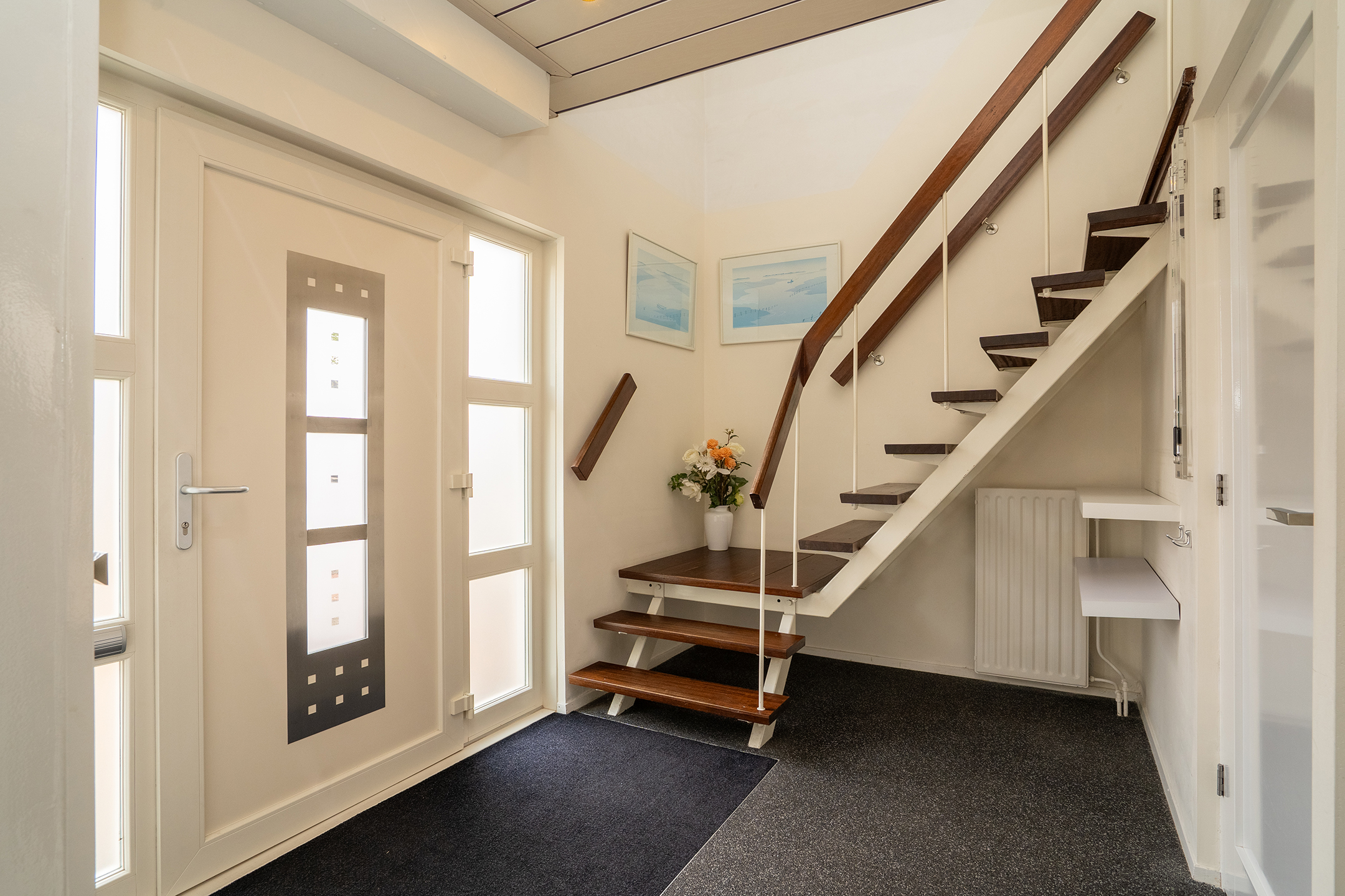 Begane grond: Via de ruime oprit bereik je de voordeur van de woning. In de hal bevinden zich het toilet, de meterkast, garderobe en de trapopgang naar de verdiepingen. Vanuit de hal heb je toegang tot de keuken.