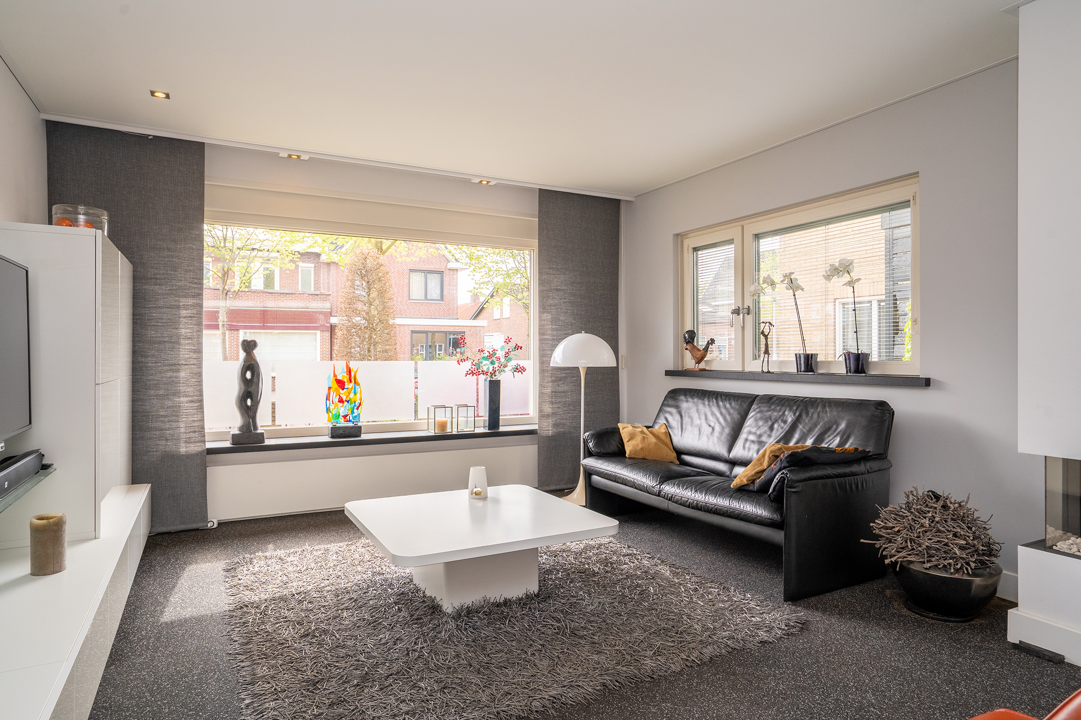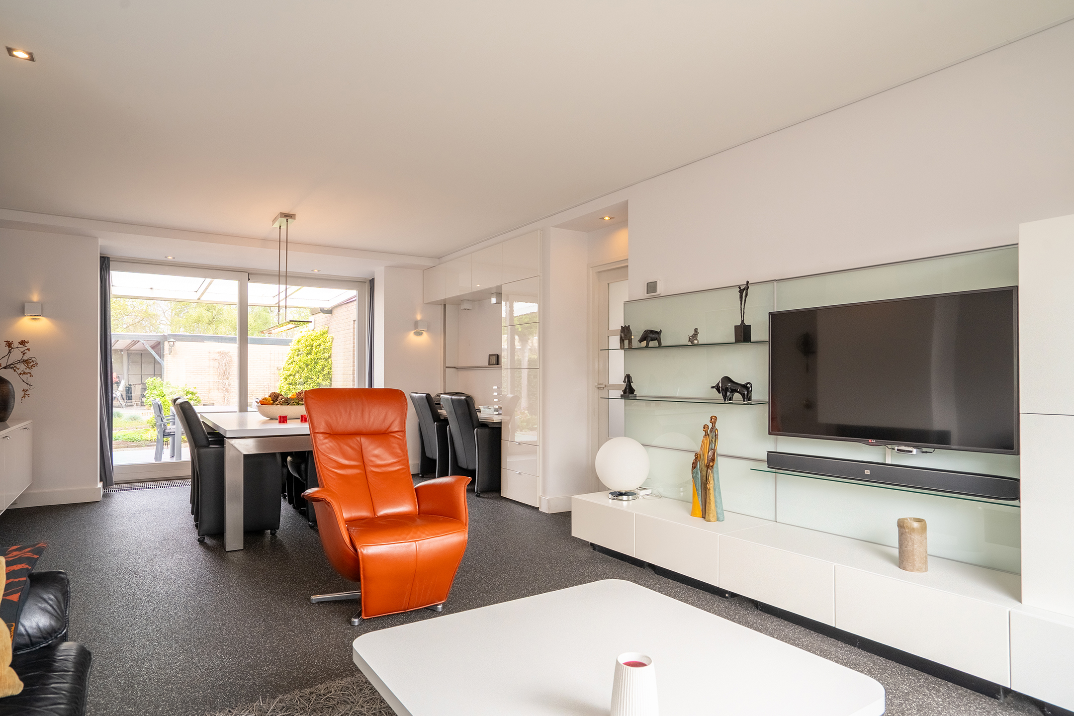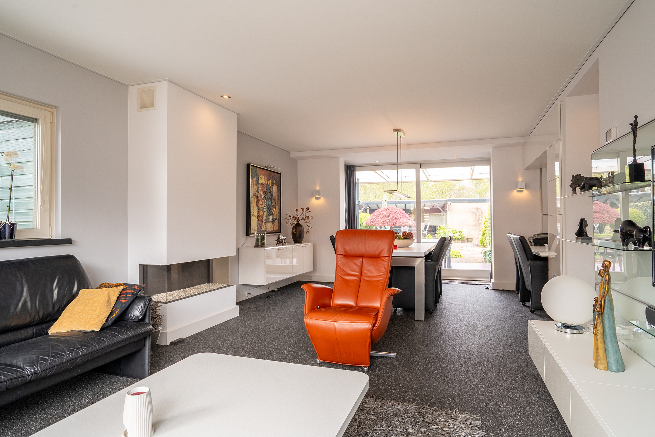 De ruime en lichte woonkamer is bereikbaar via de keuken en kenmerkt zich door de grote raampartijen, wat zorgt voor een aangename lichtinval. De sfeervolle gashaard vormt een mooi centraal punt in de ruimte. Middels de schuifpui is de overkapping direct aan huis bereikbaar, waardoor binnen en buiten op een prettige manier in elkaar overlopen.