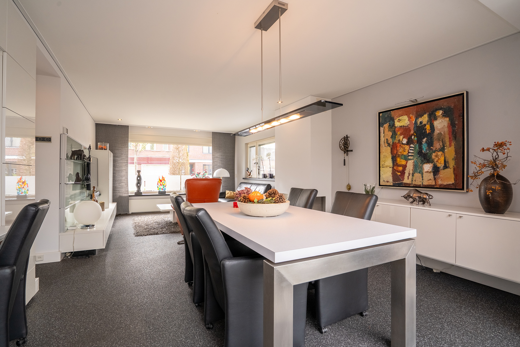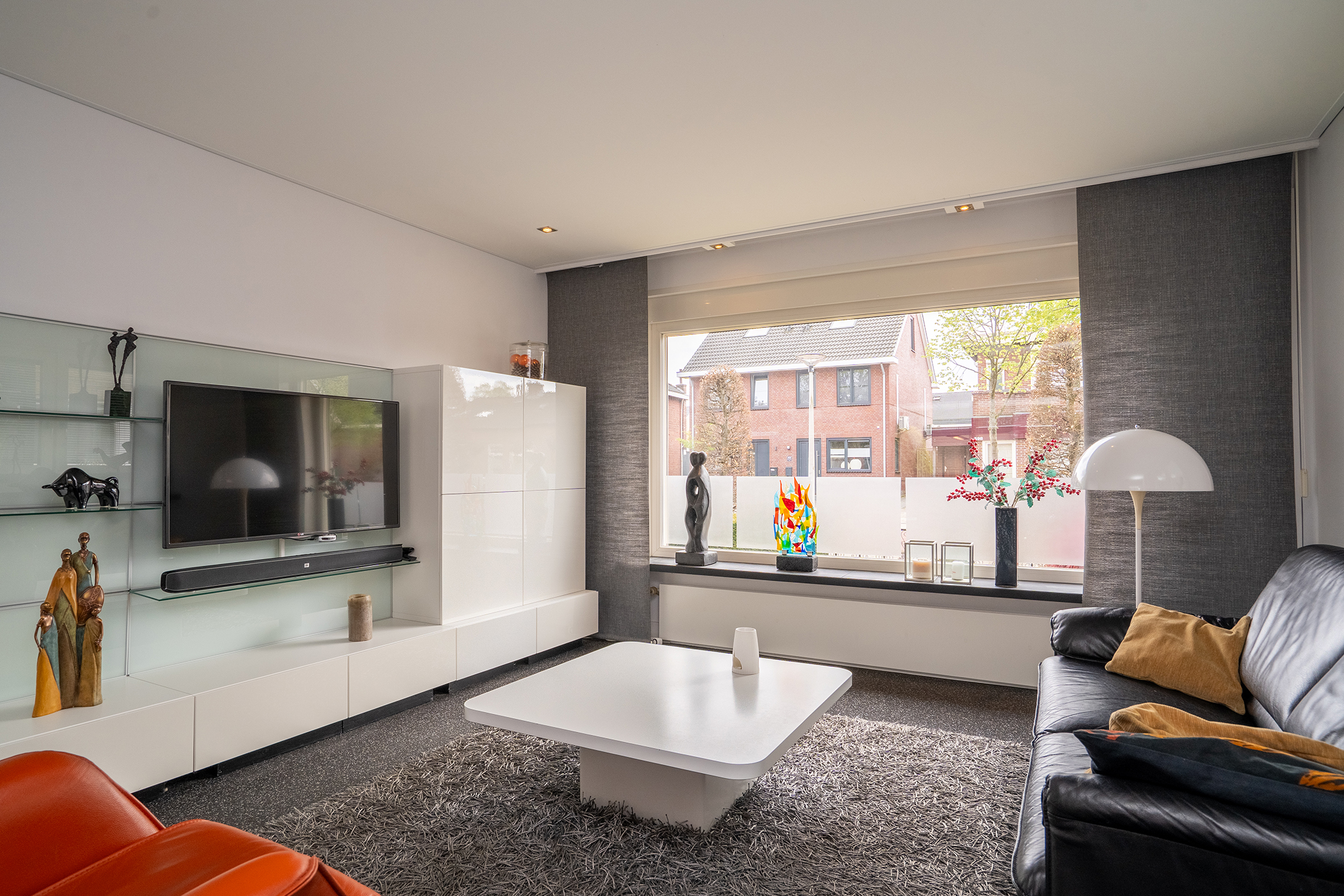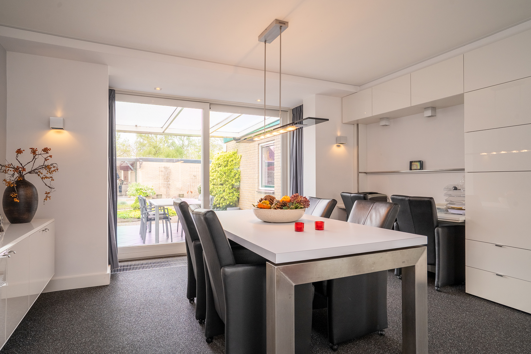 De ruime en lichte woonkamer is bereikbaar via de keuken en kenmerkt zich door de grote raampartijen, wat zorgt voor een aangename lichtinval. De sfeervolle gashaard vormt een mooi centraal punt in de ruimte. Middels de schuifpui is de overkapping direct aan huis bereikbaar, waardoor binnen en buiten op een prettige manier in elkaar overlopen.