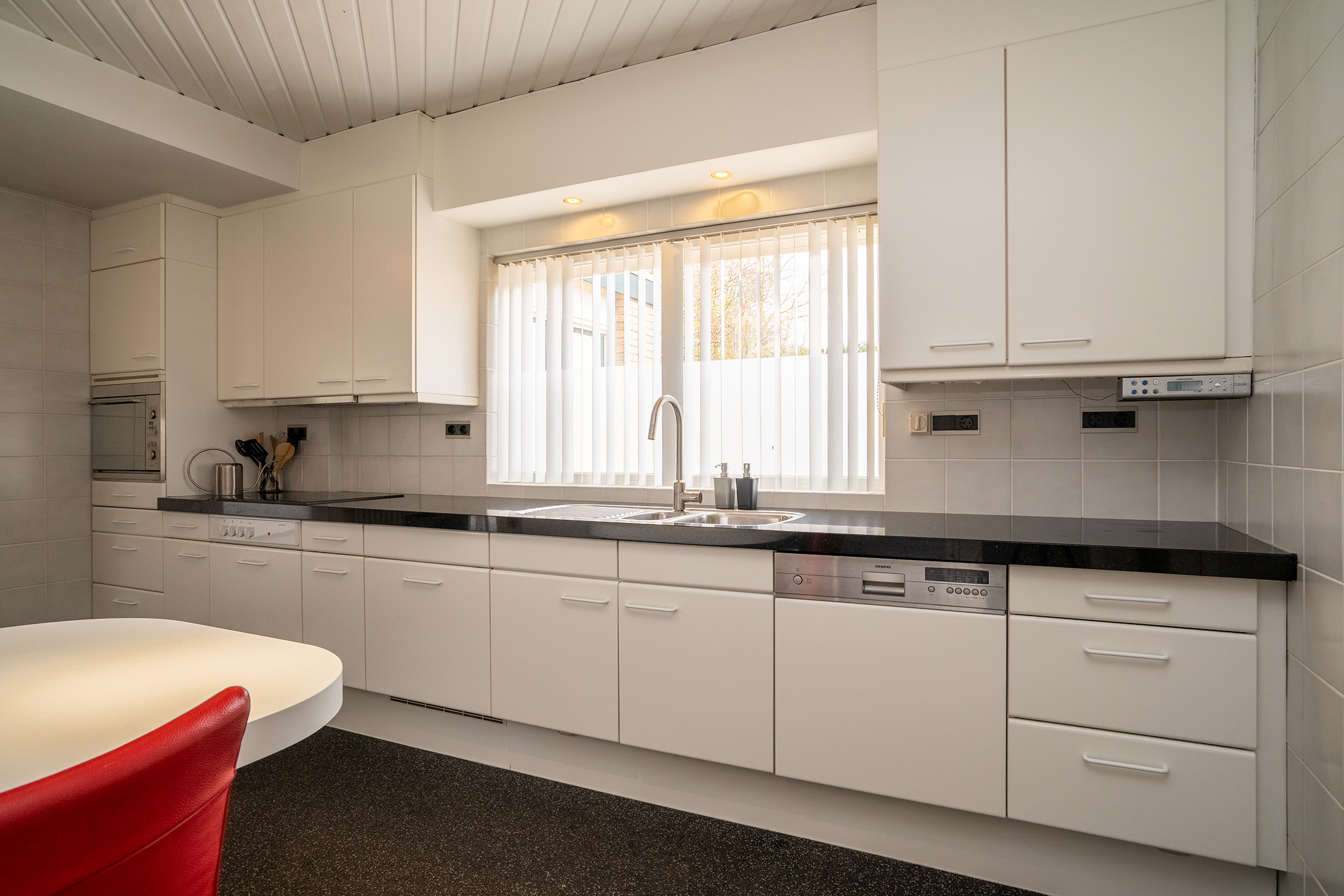 De keuken is praktisch ingedeeld en voorzien van een rechte opstelling met voldoende werk- en kastruimte. De keuken is onder andere uitgerust met een kookplaat, afzuigkap, vaatwasser en combi-oven. Dankzij het grote raam is er prettig daglicht, wat het tot een fijne plek maakt om te koken. Vanuit de keuken is er toegang tot zowel de woonkamer als de bijkeuken.